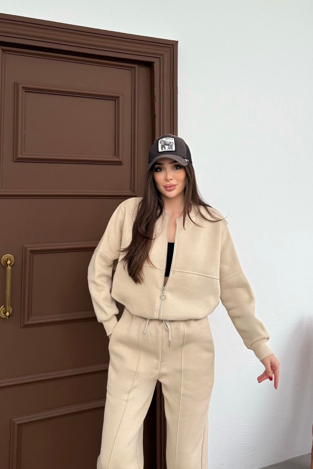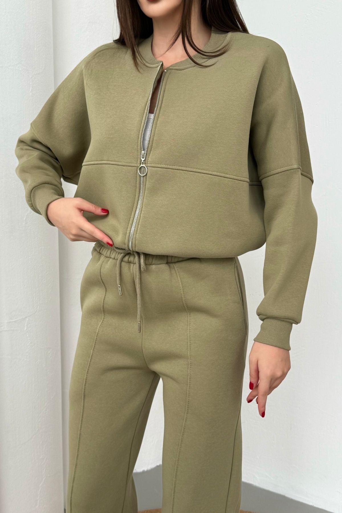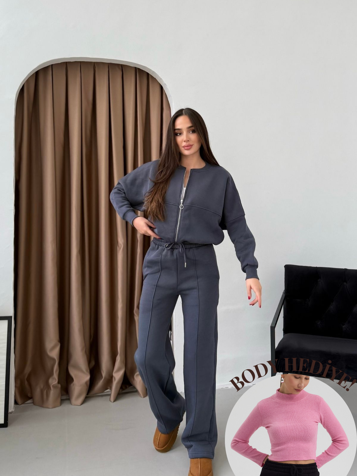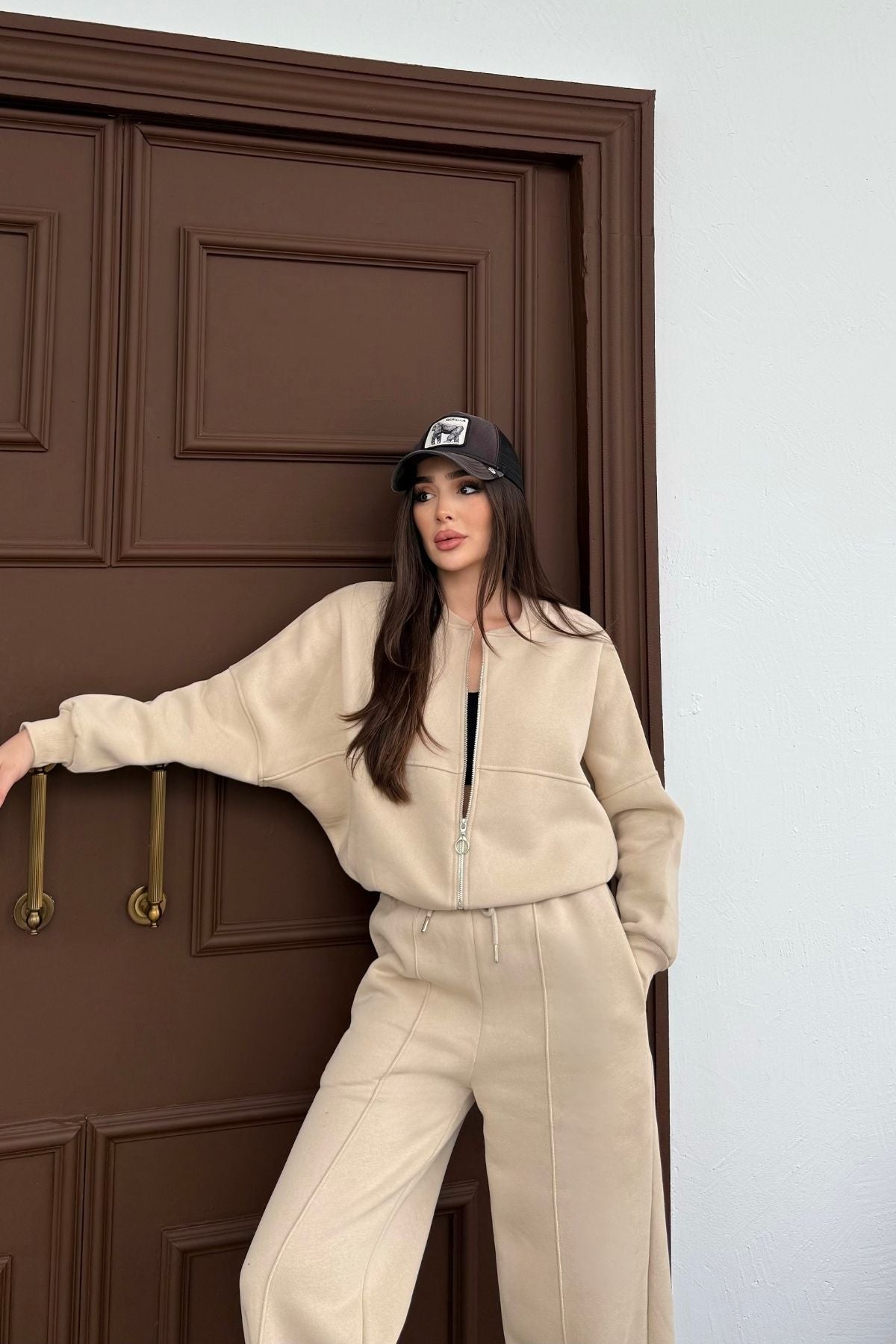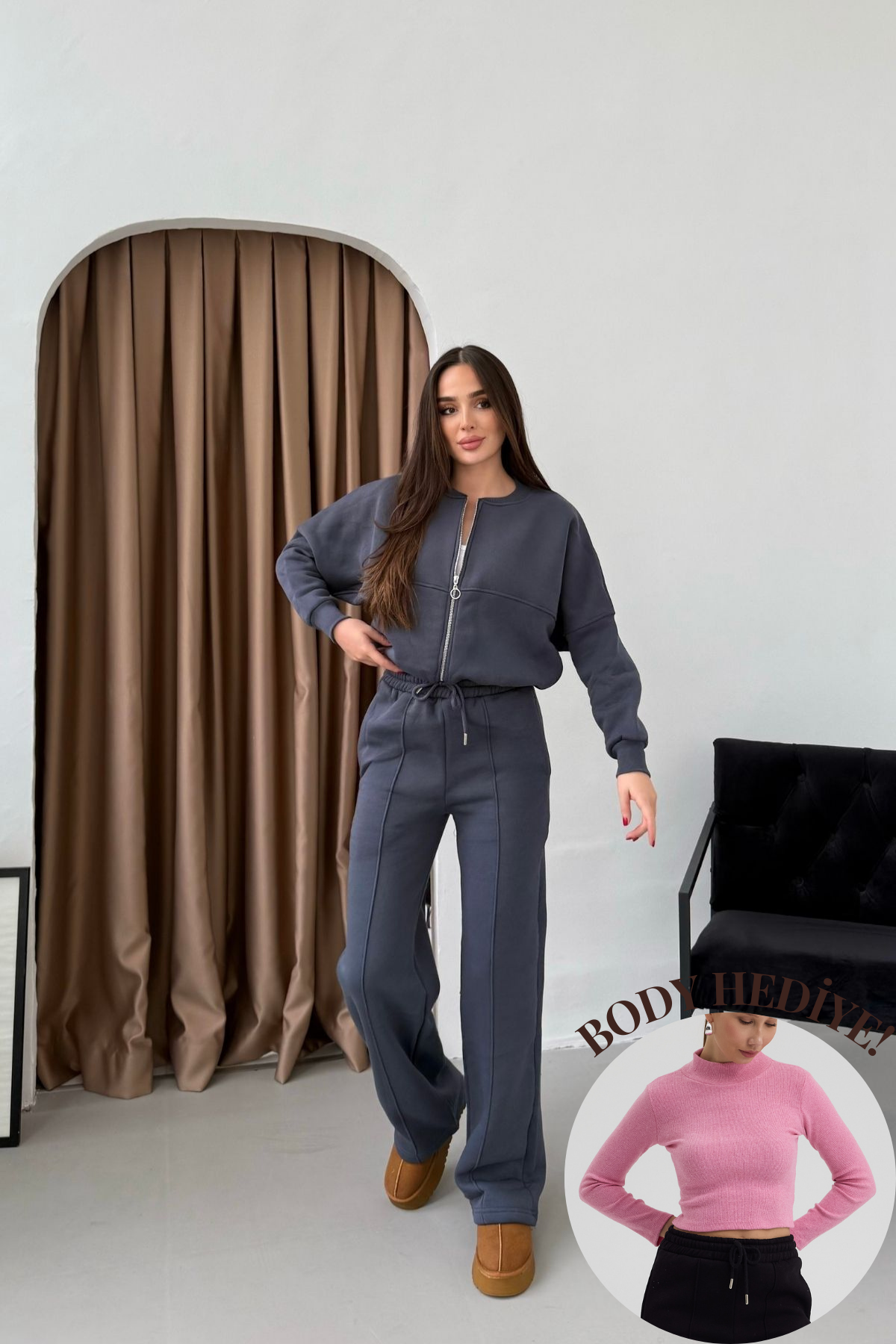 Kadın Şardonlu Fermuar Detaylı Üç Iplik Kışlık Eşofman Takımı