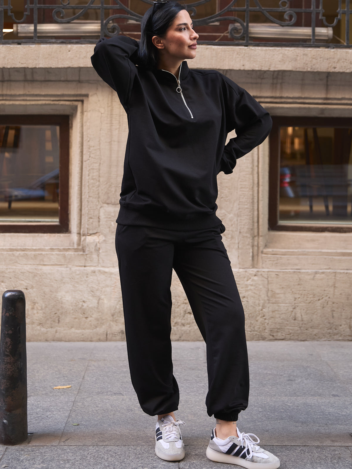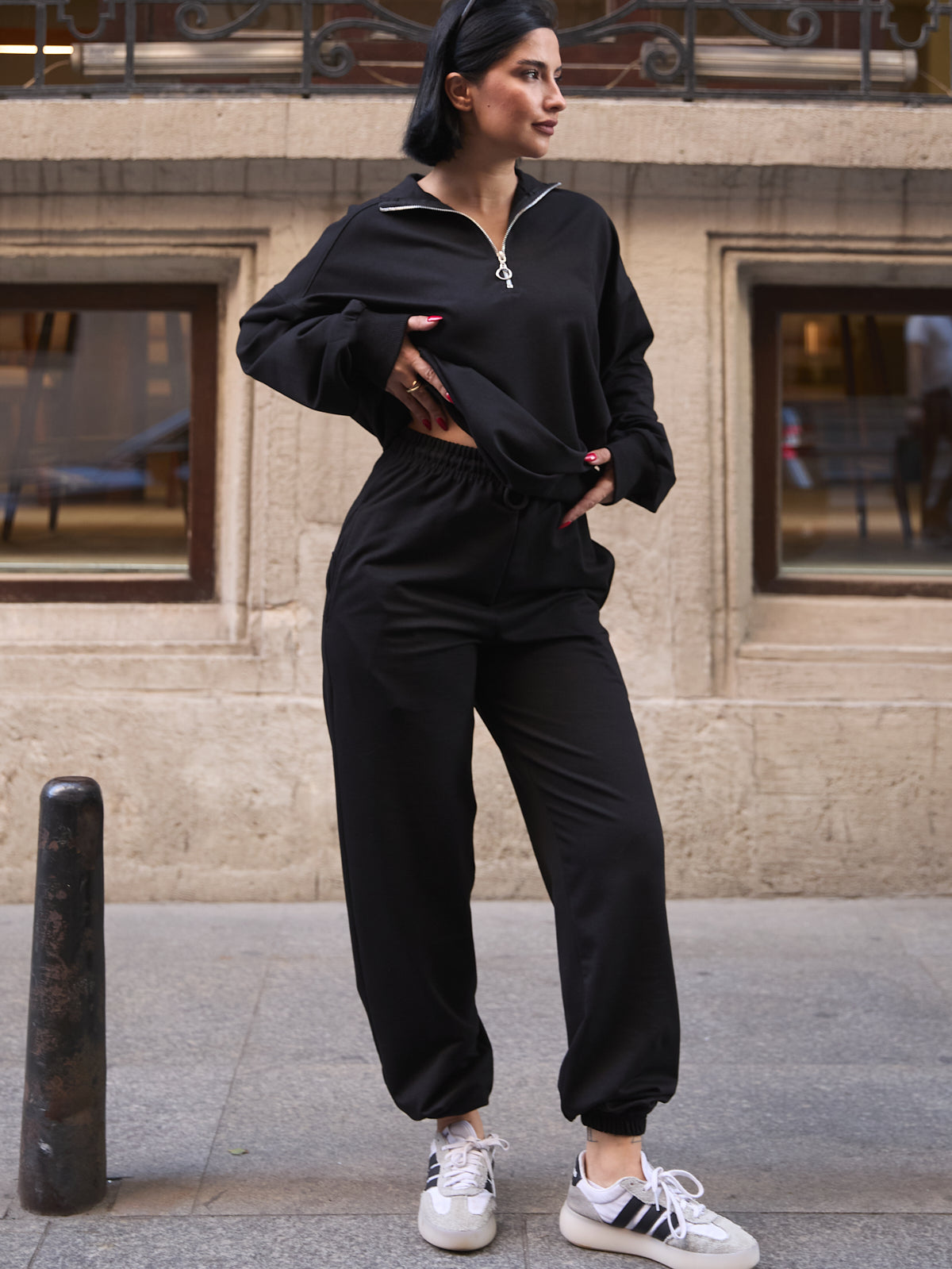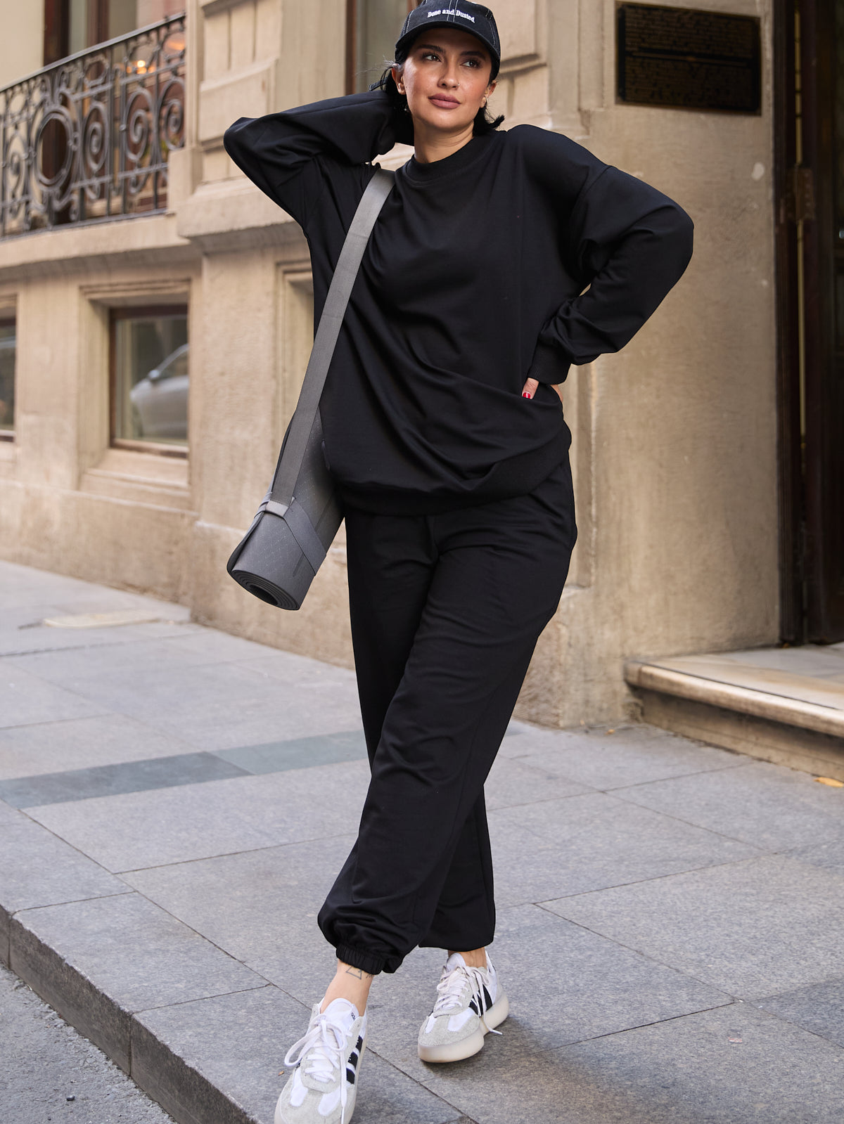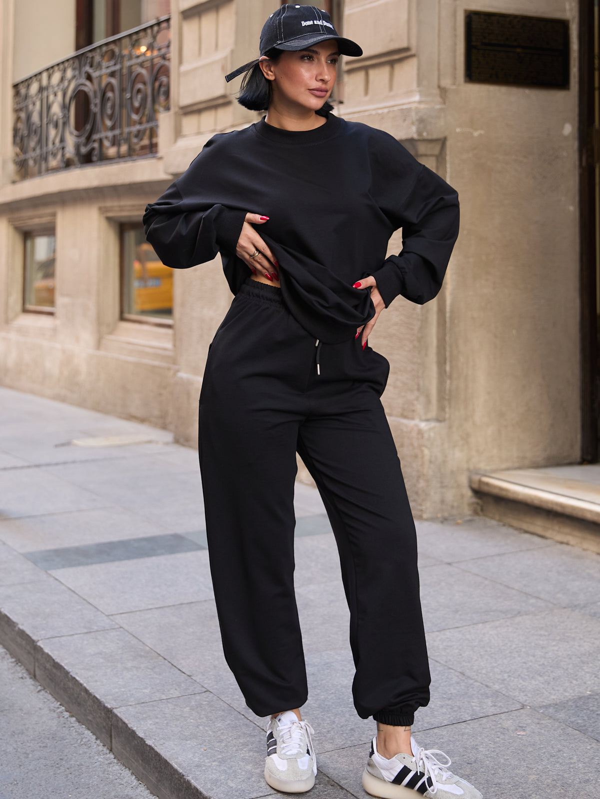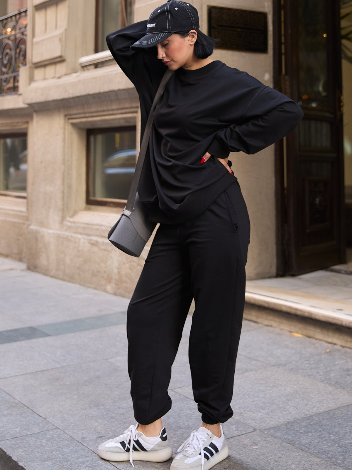 Regular Fit 2'li Takım Sweatshirt Beli Lastikli Jogger Siyah Eşofman Altı