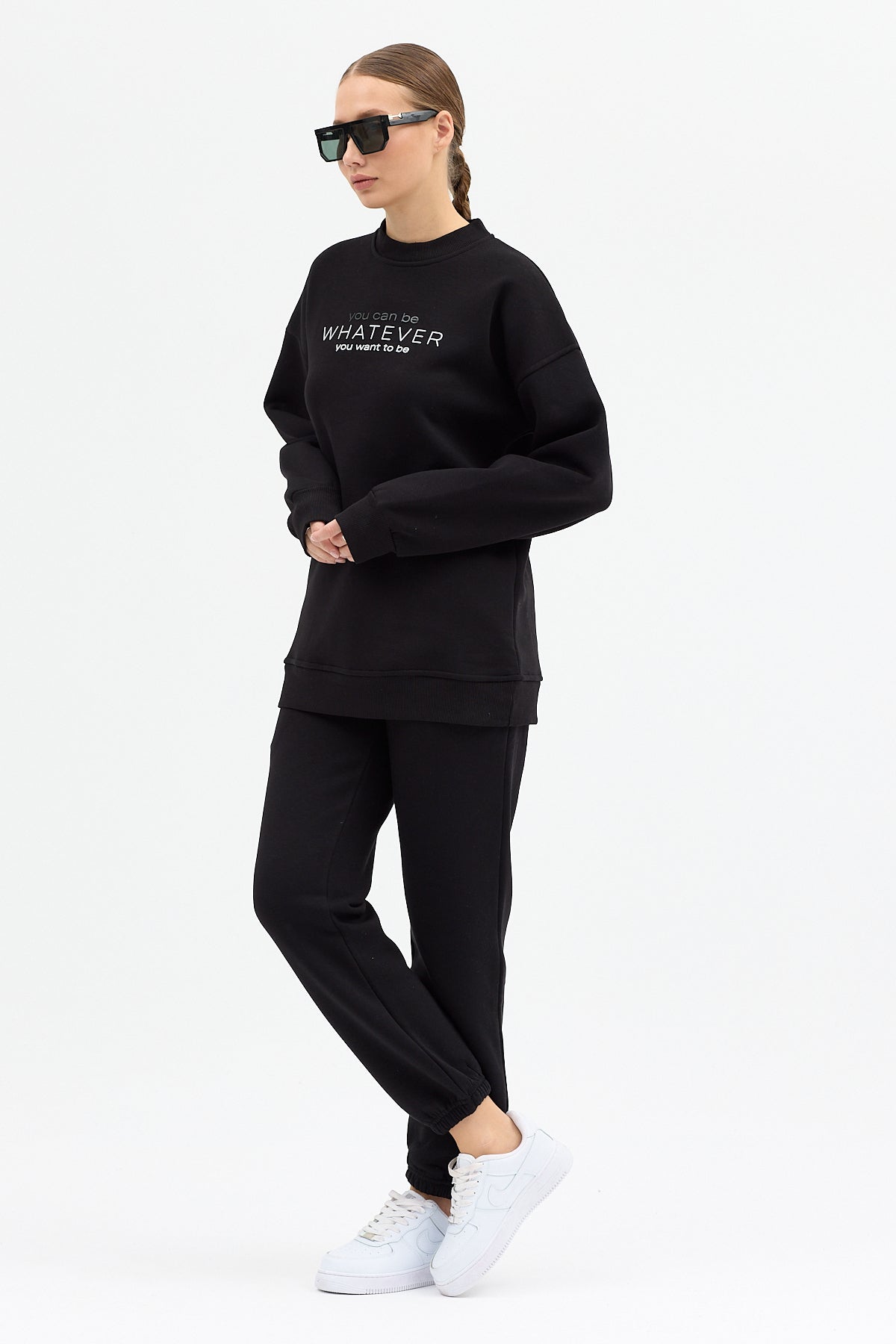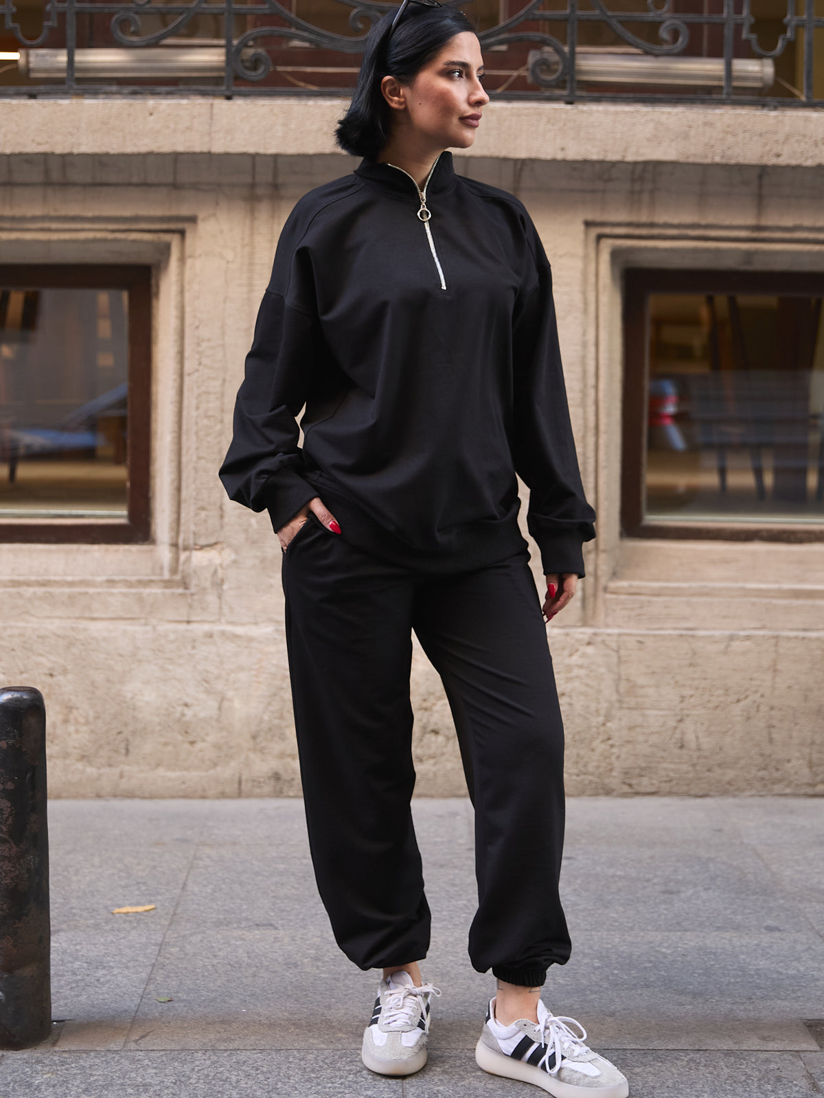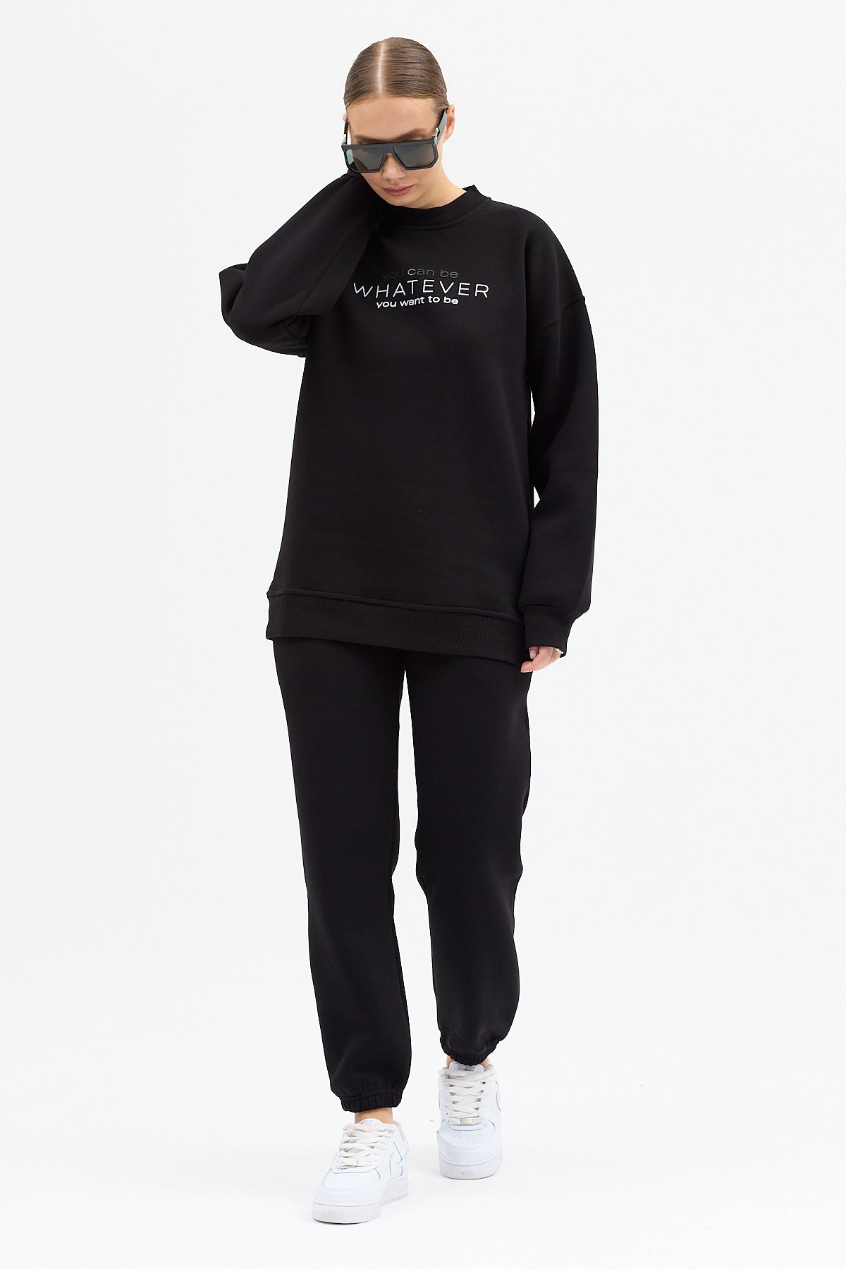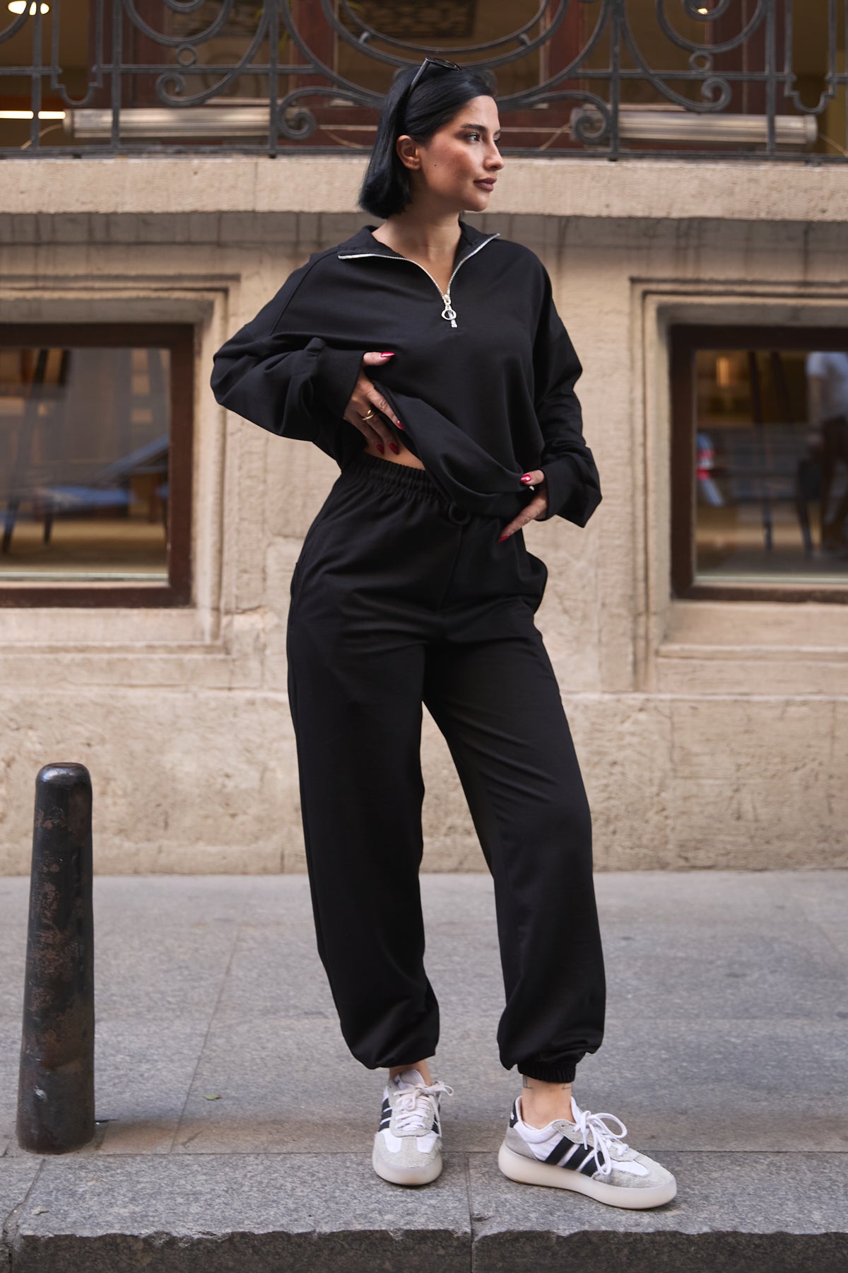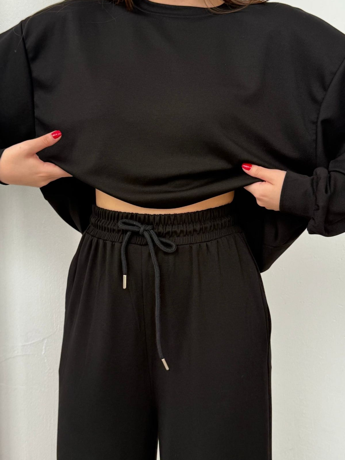 Regular Fit 2'li Takım Sweatshirt Beli Lastikli Jogger Siyah Eşofman Altı