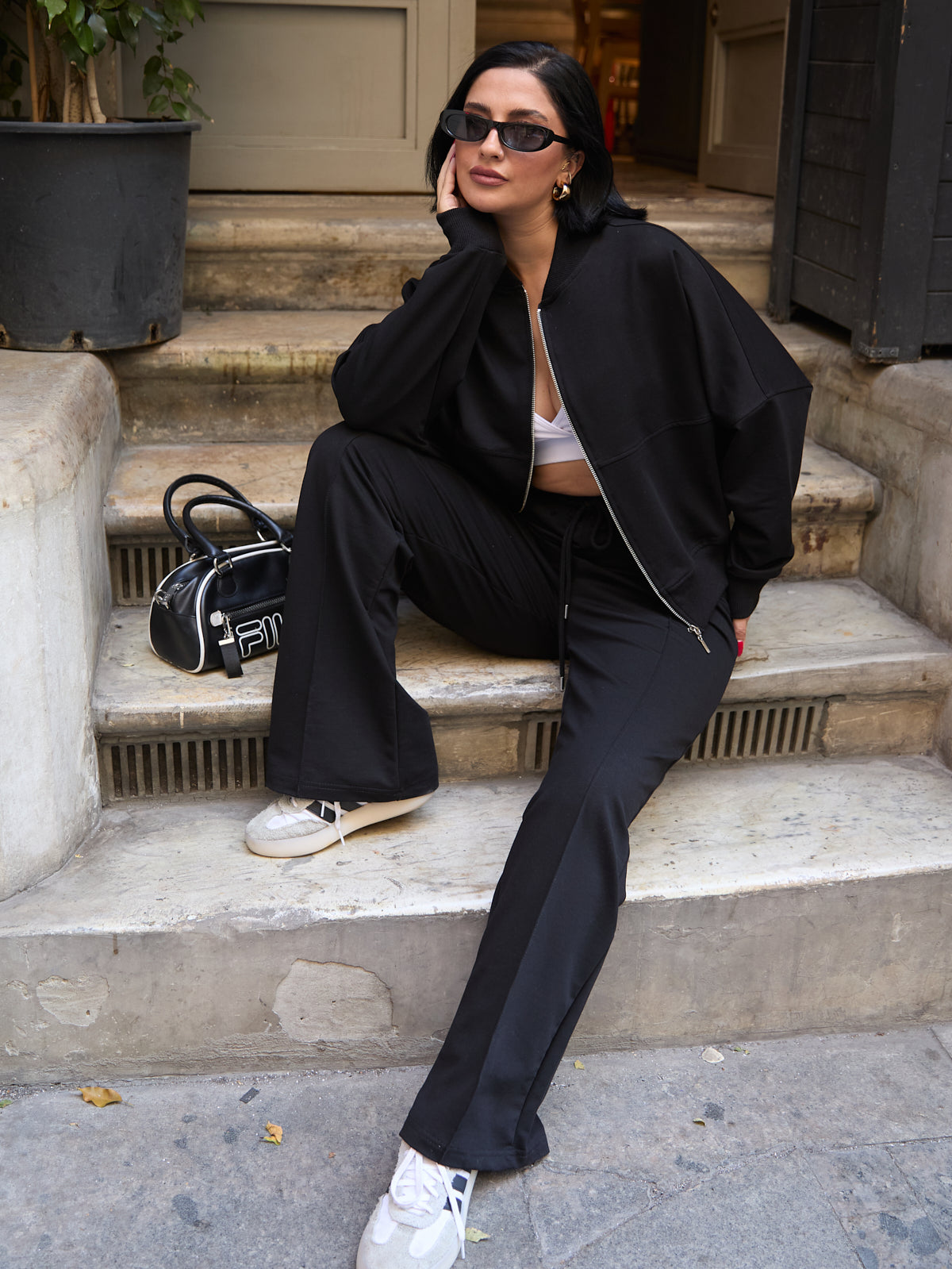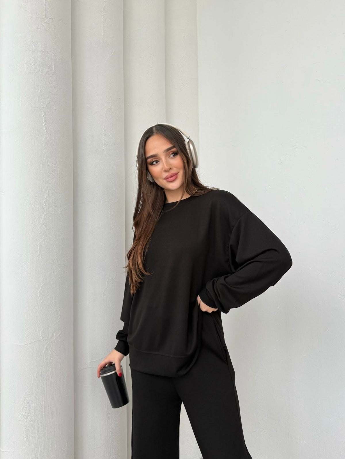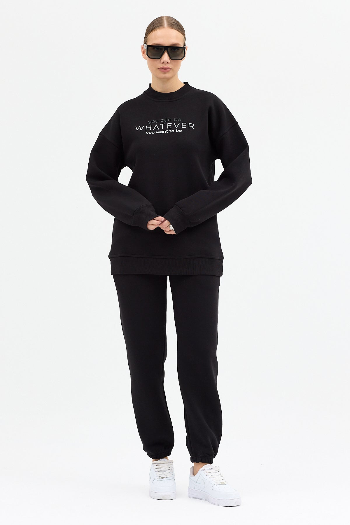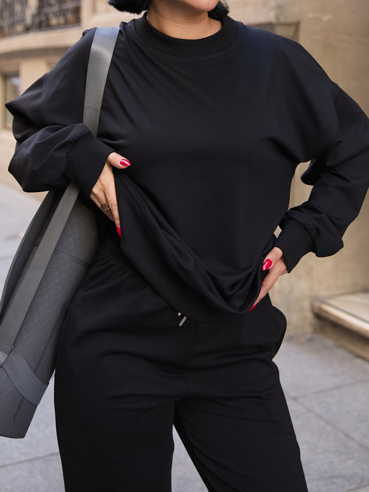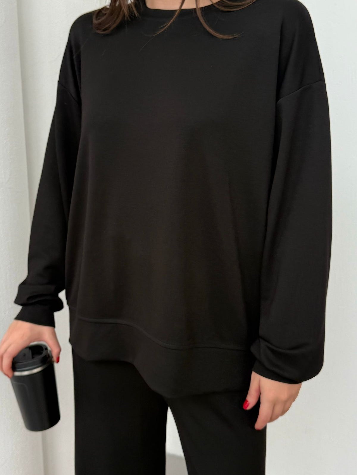 Regular Fit 2'li Takım Sweatshirt Beli Lastikli Jogger Siyah Eşofman Altı