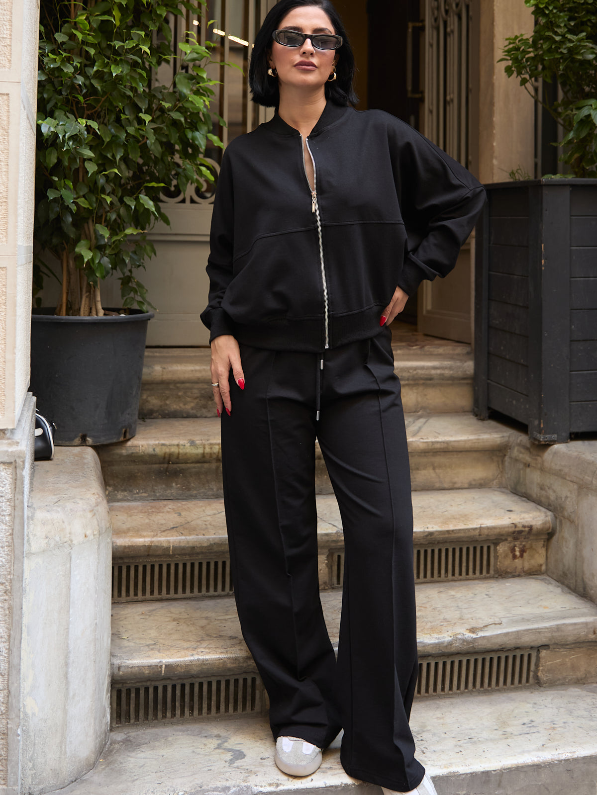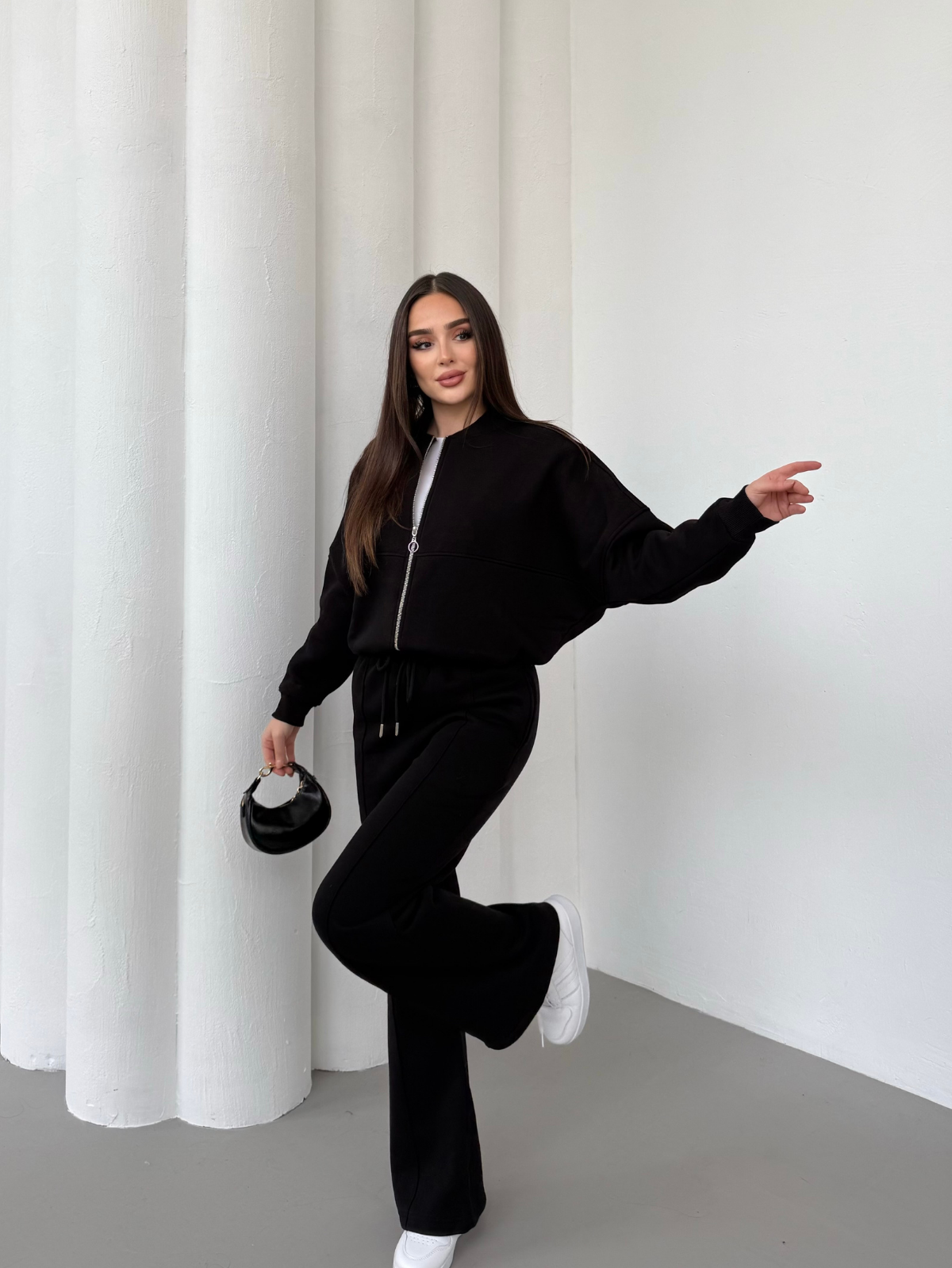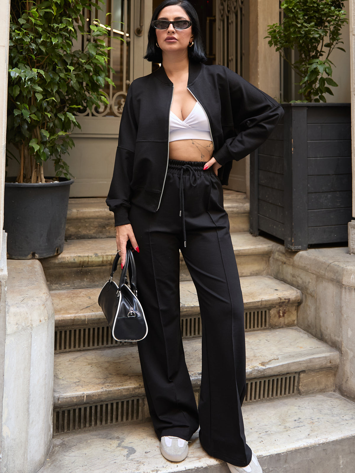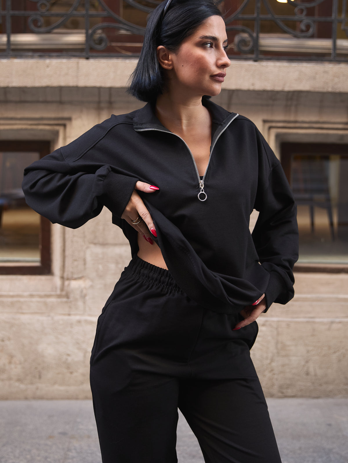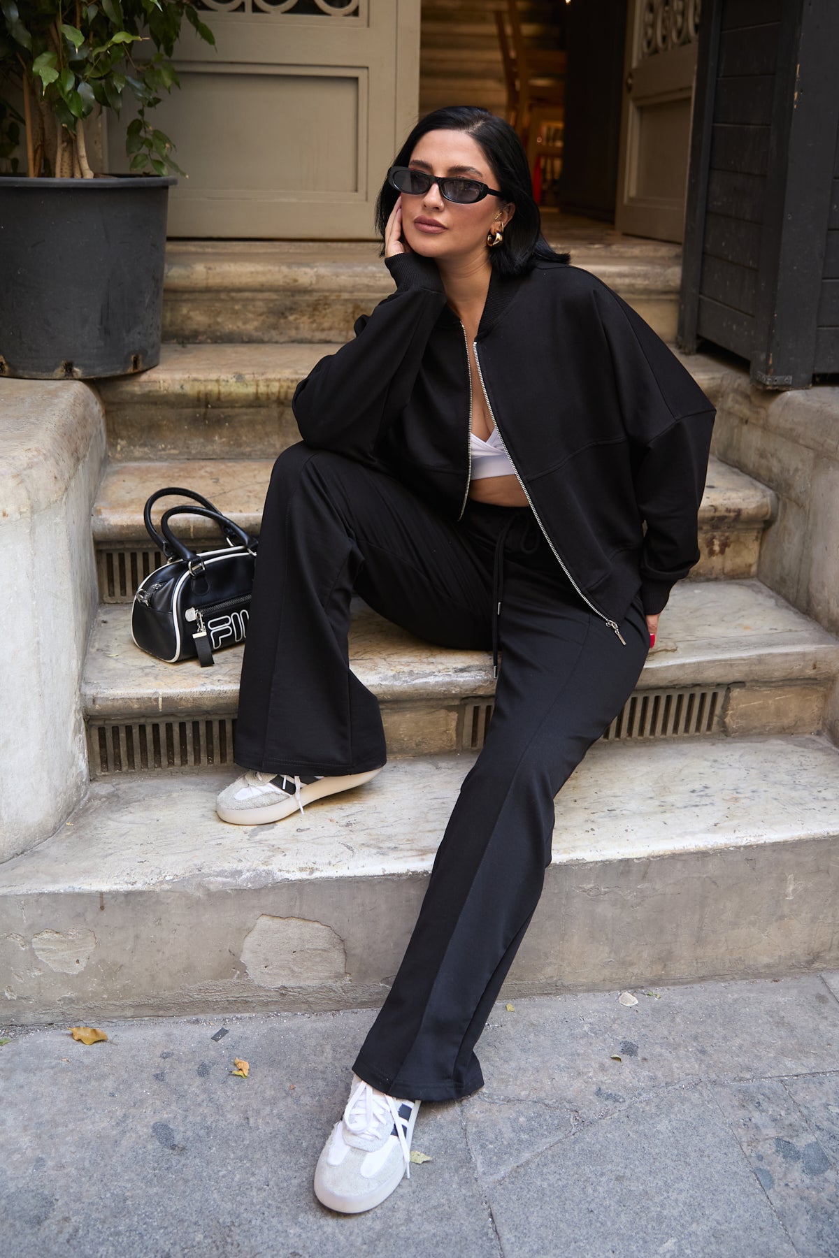 Regular Fit 2'li Takım Sweatshirt Beli Lastikli Jogger Siyah Eşofman Altı