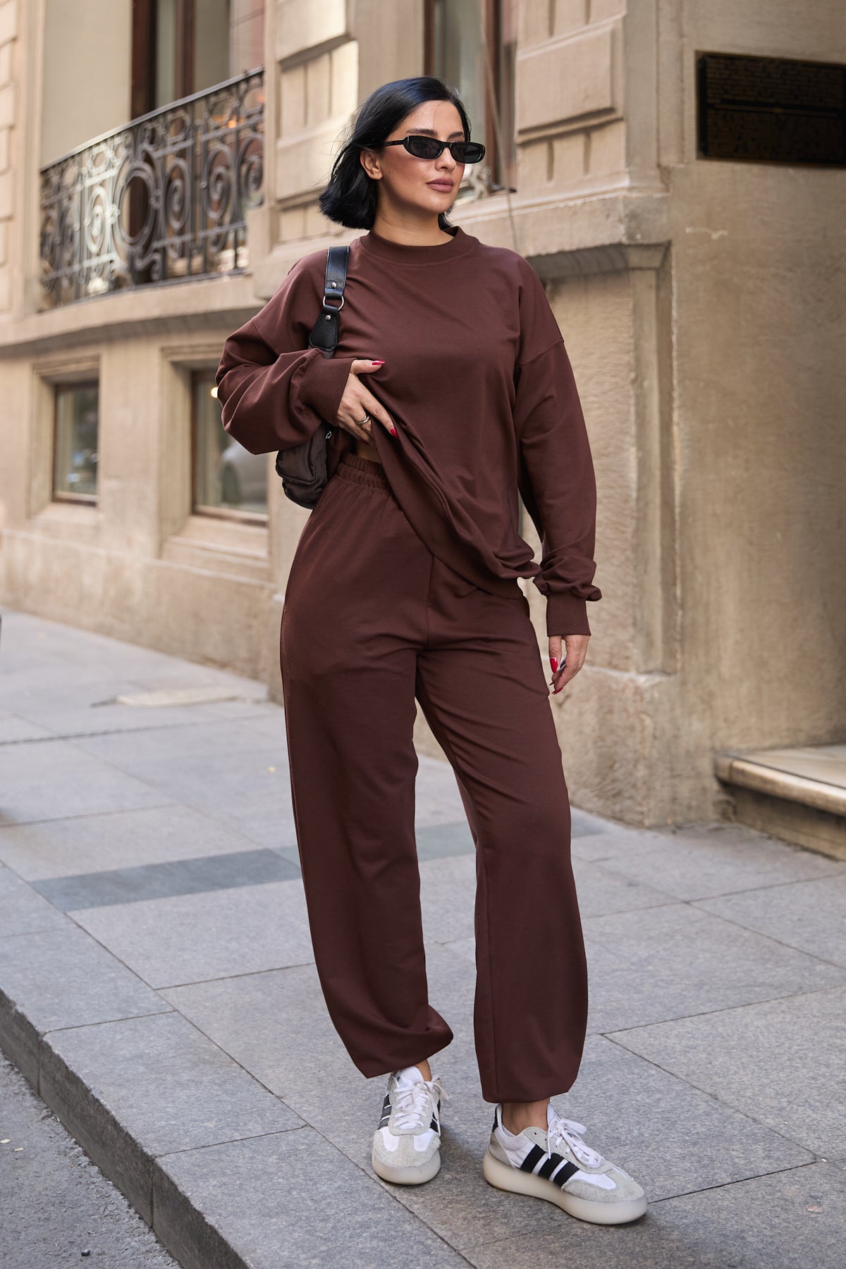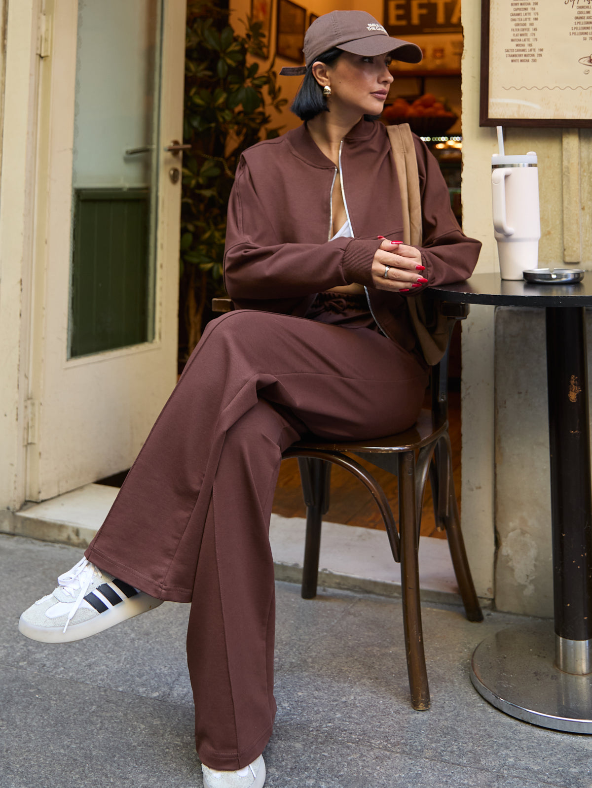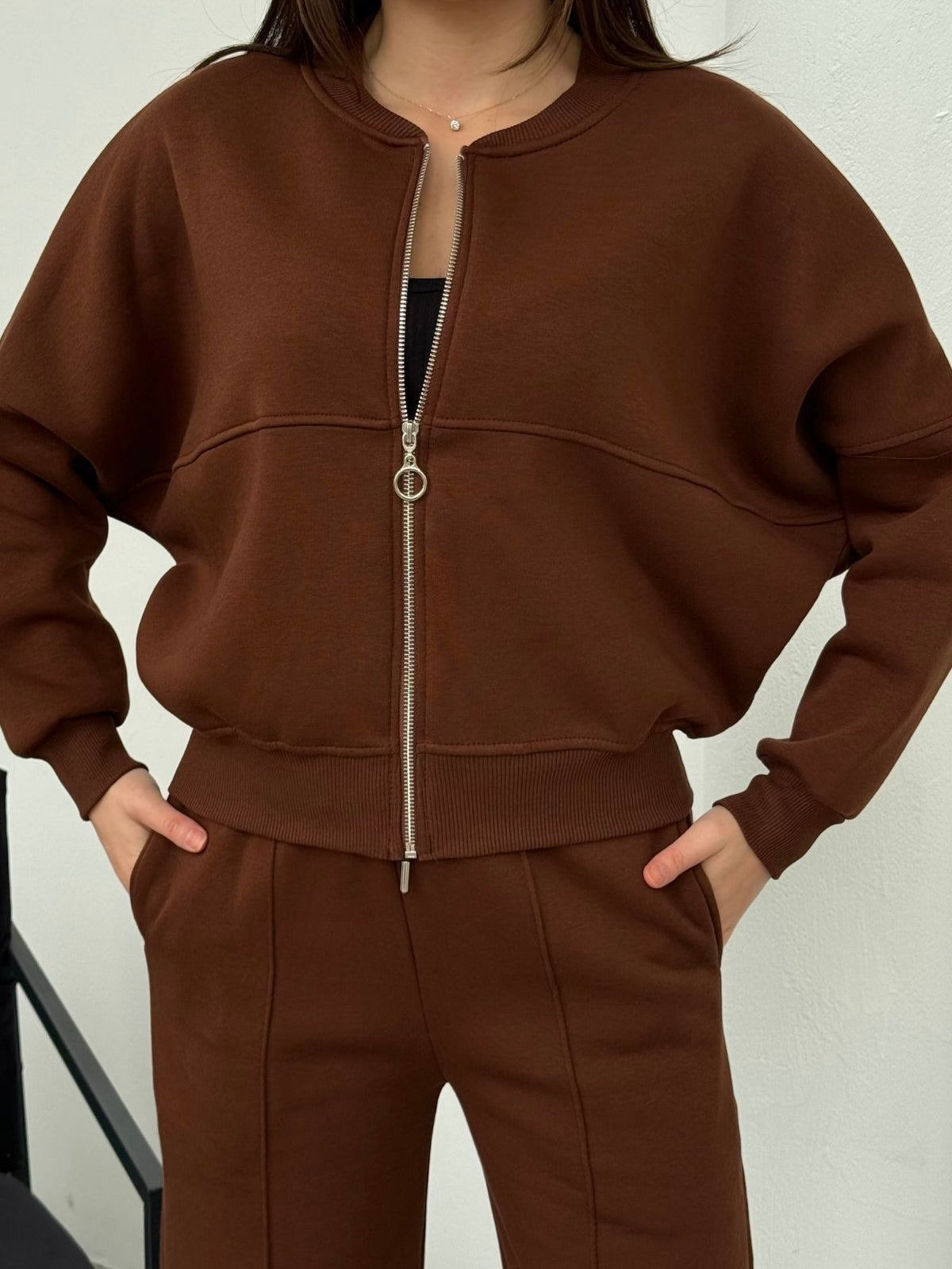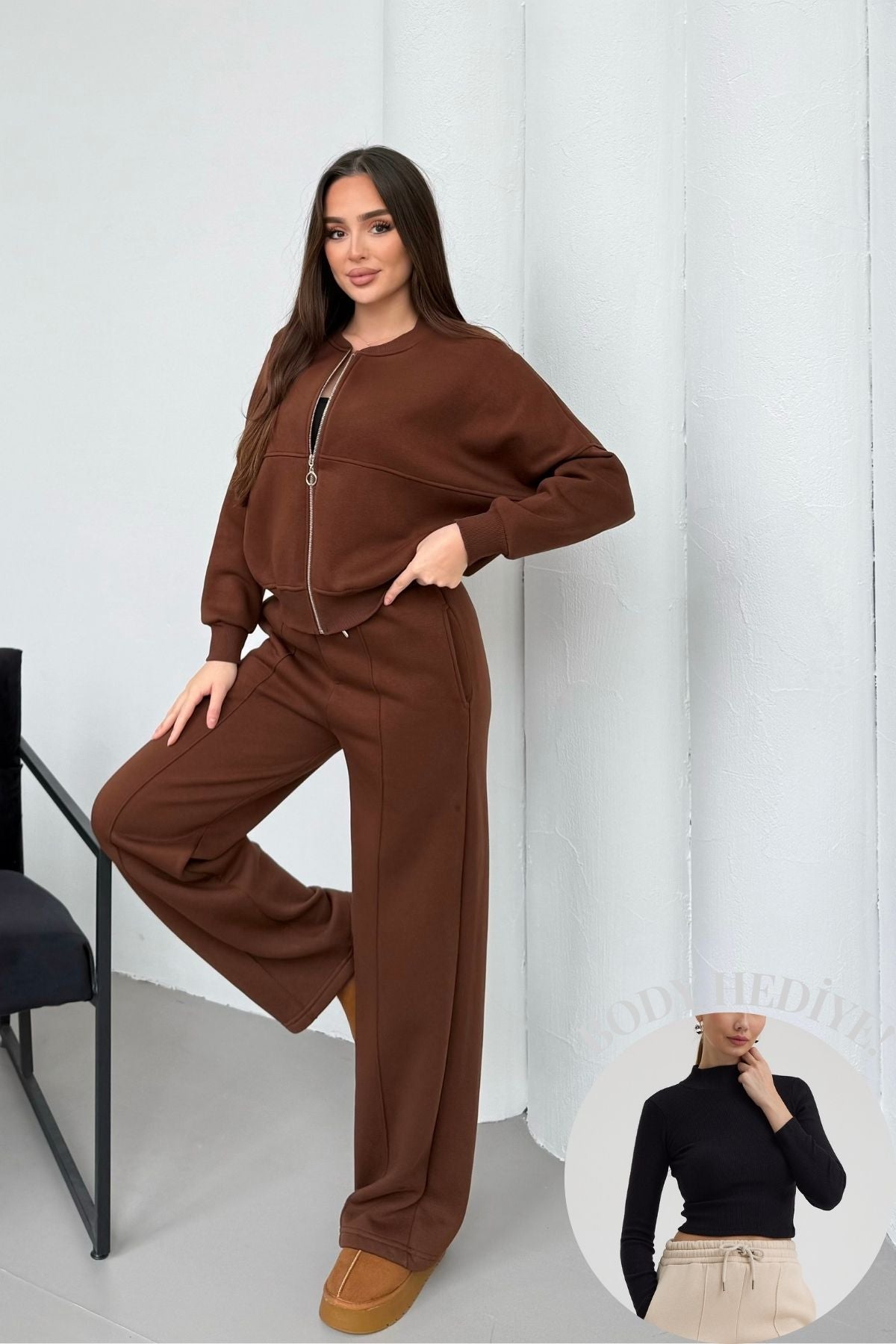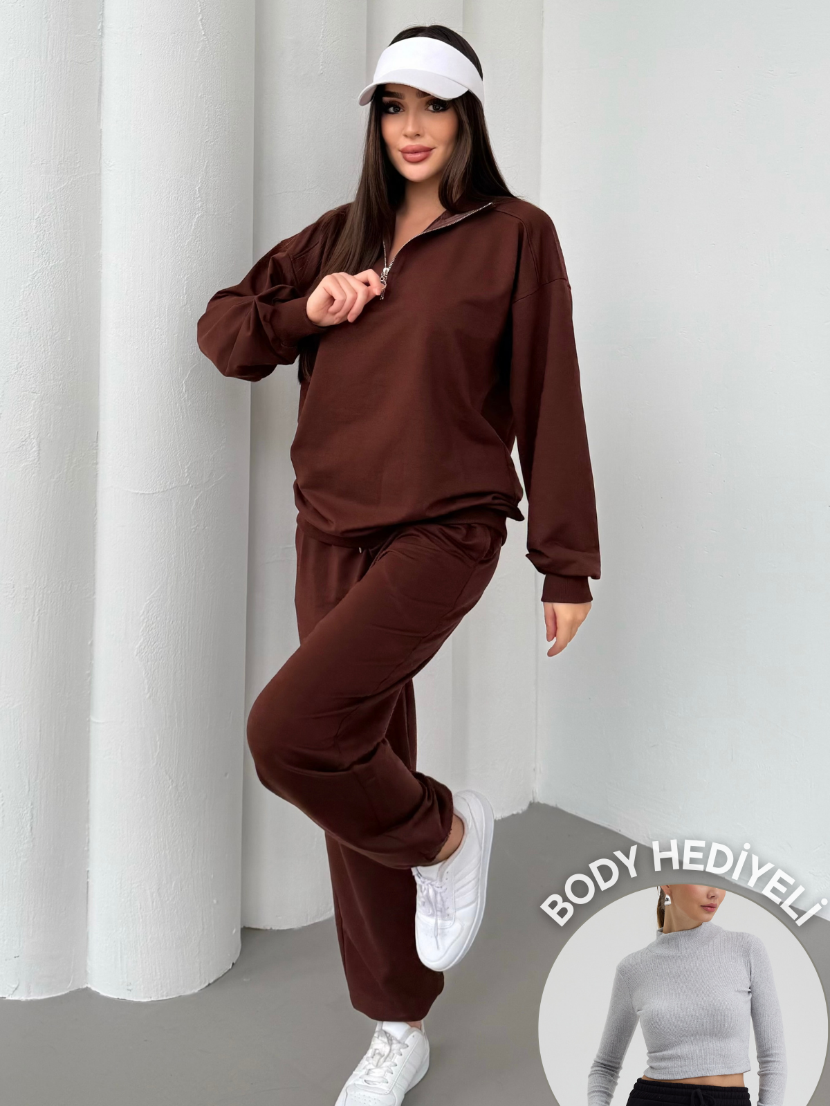Kadın Yarım Fermuarlı Sweatshırt Ve Paçası Lastikli Kahverengi Eşofman Takımı
