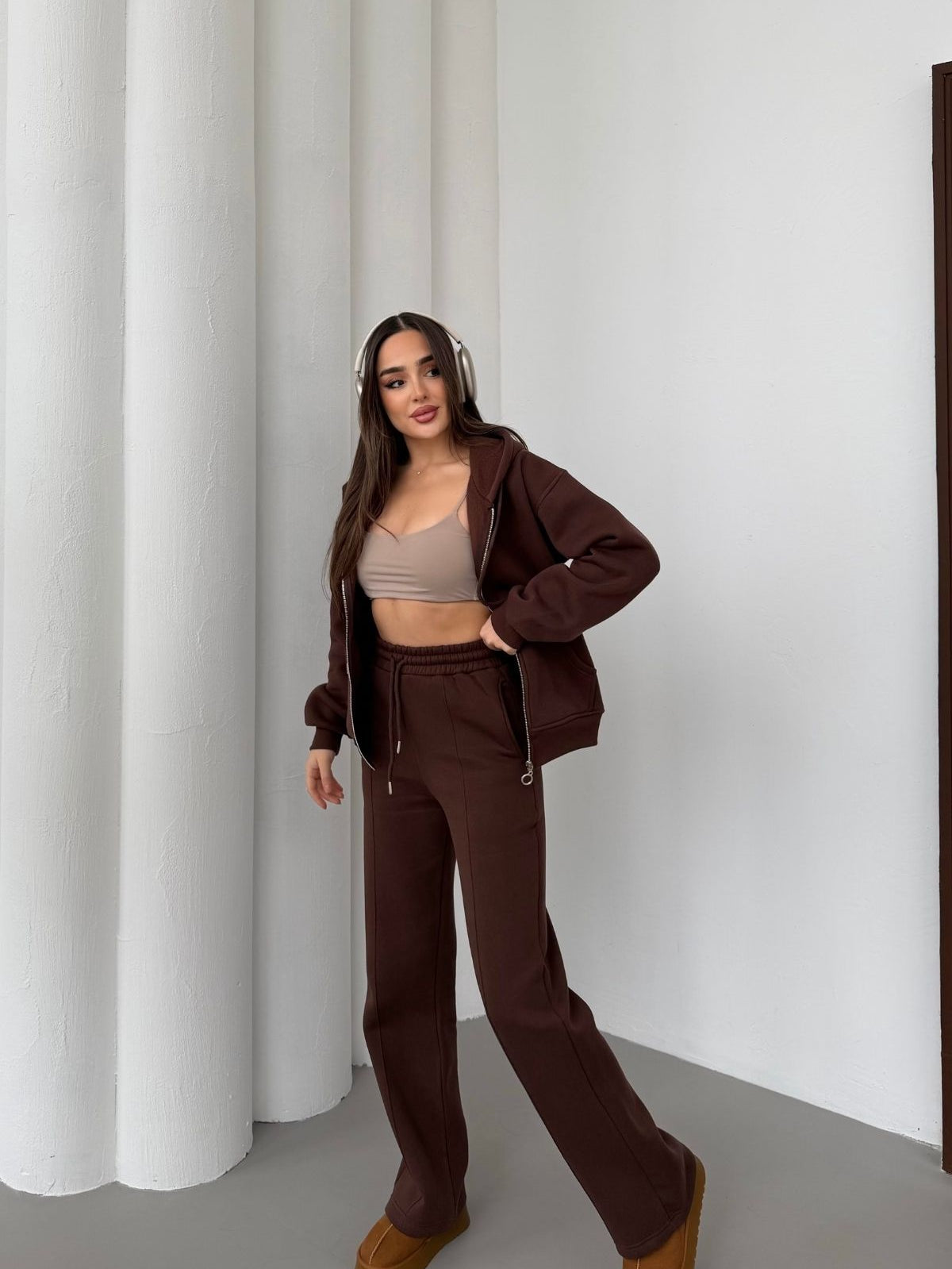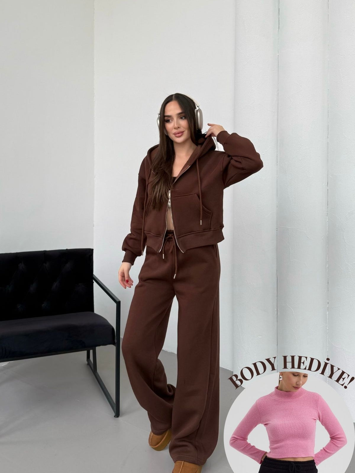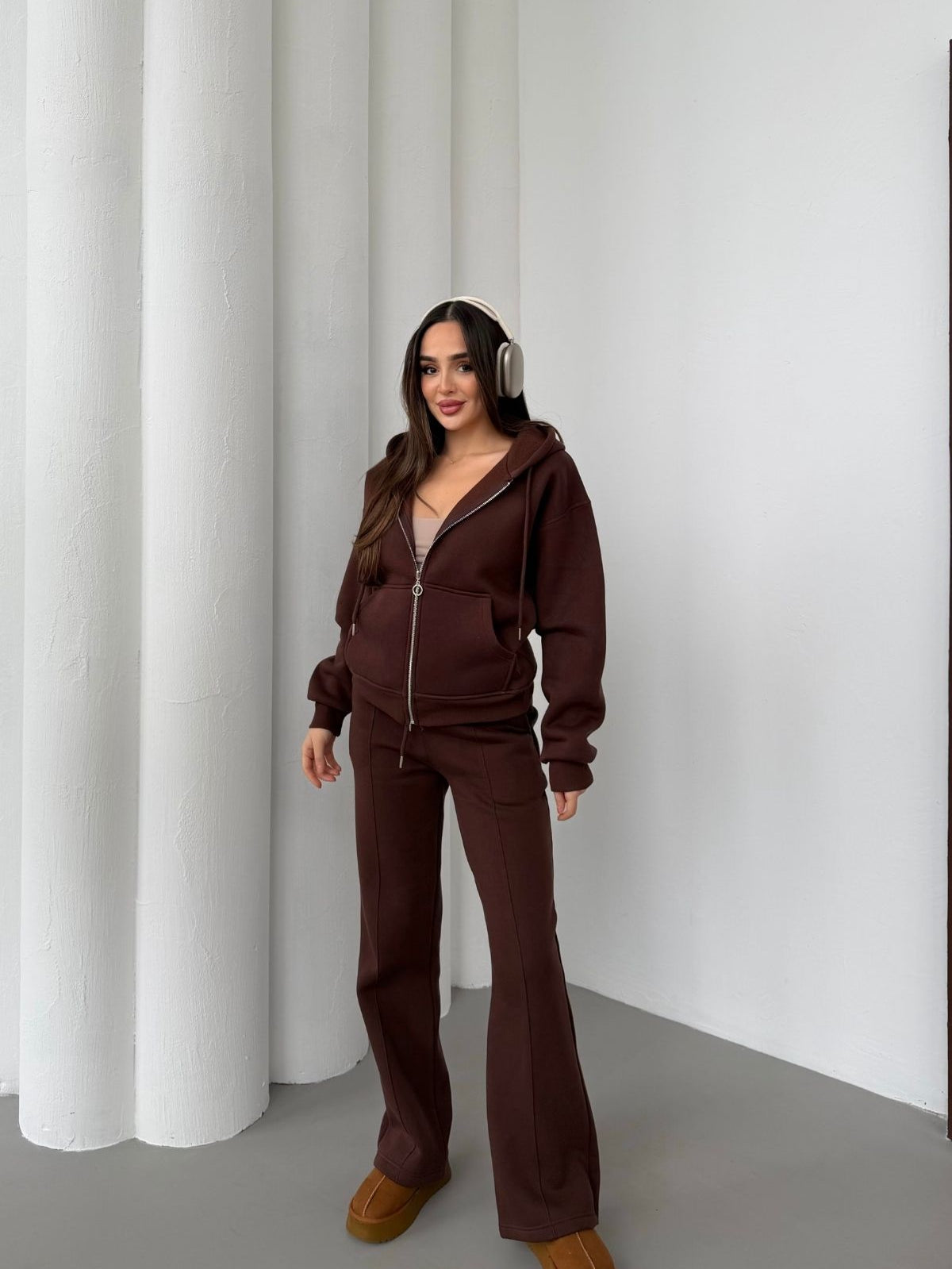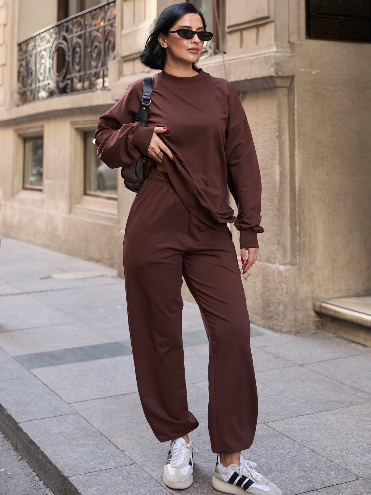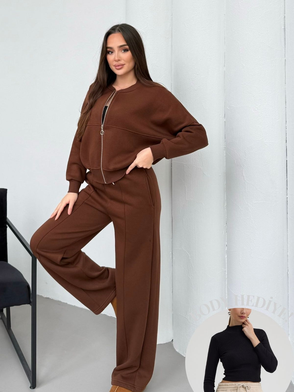 Kadın Yarım Fermuarlı Sweatshırt Ve Paçası Lastikli Kahverengi Eşofman Takımı