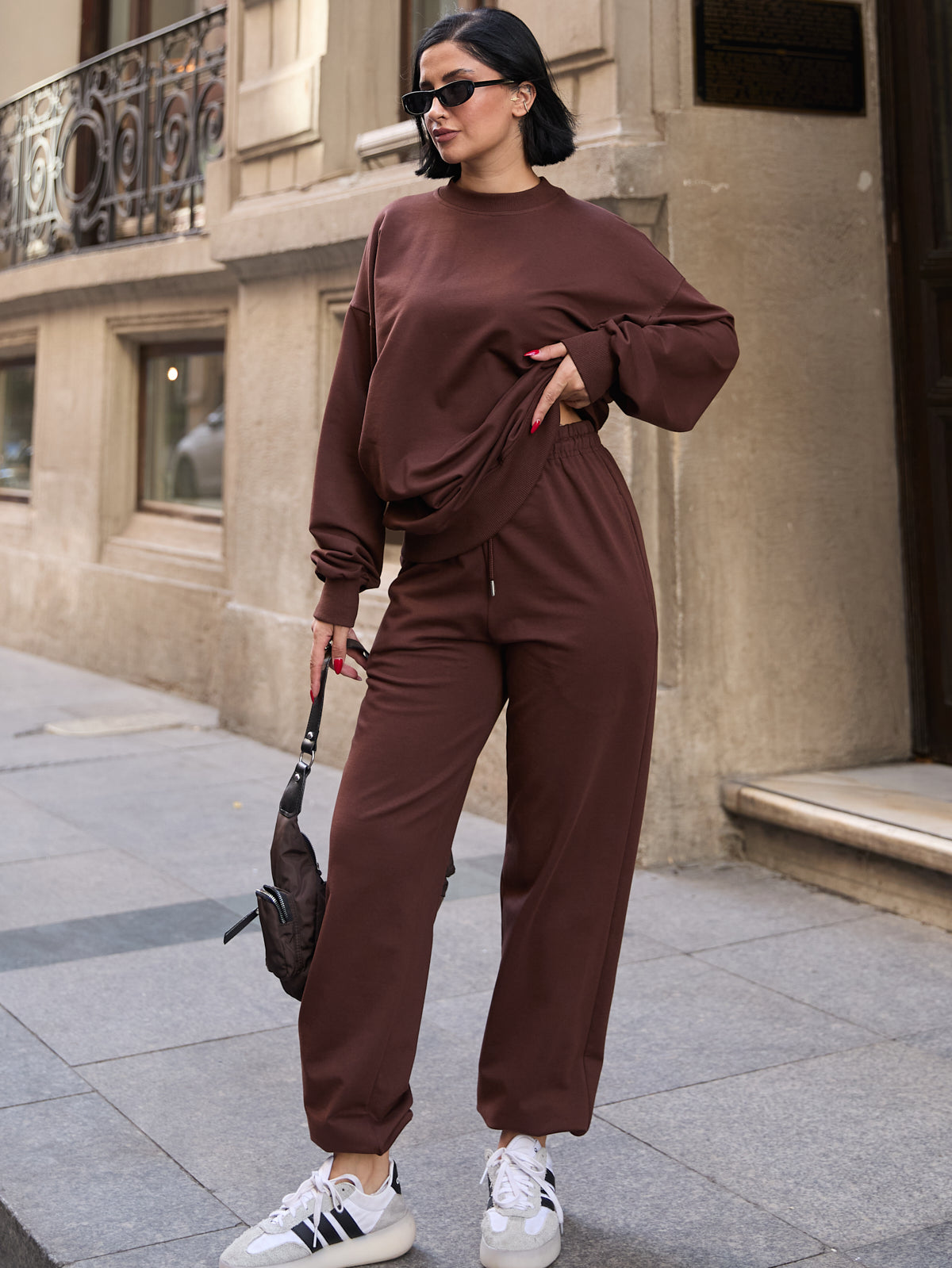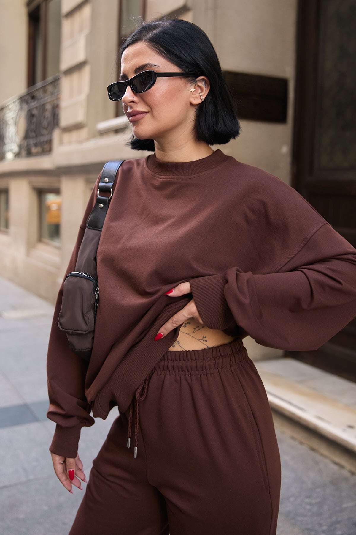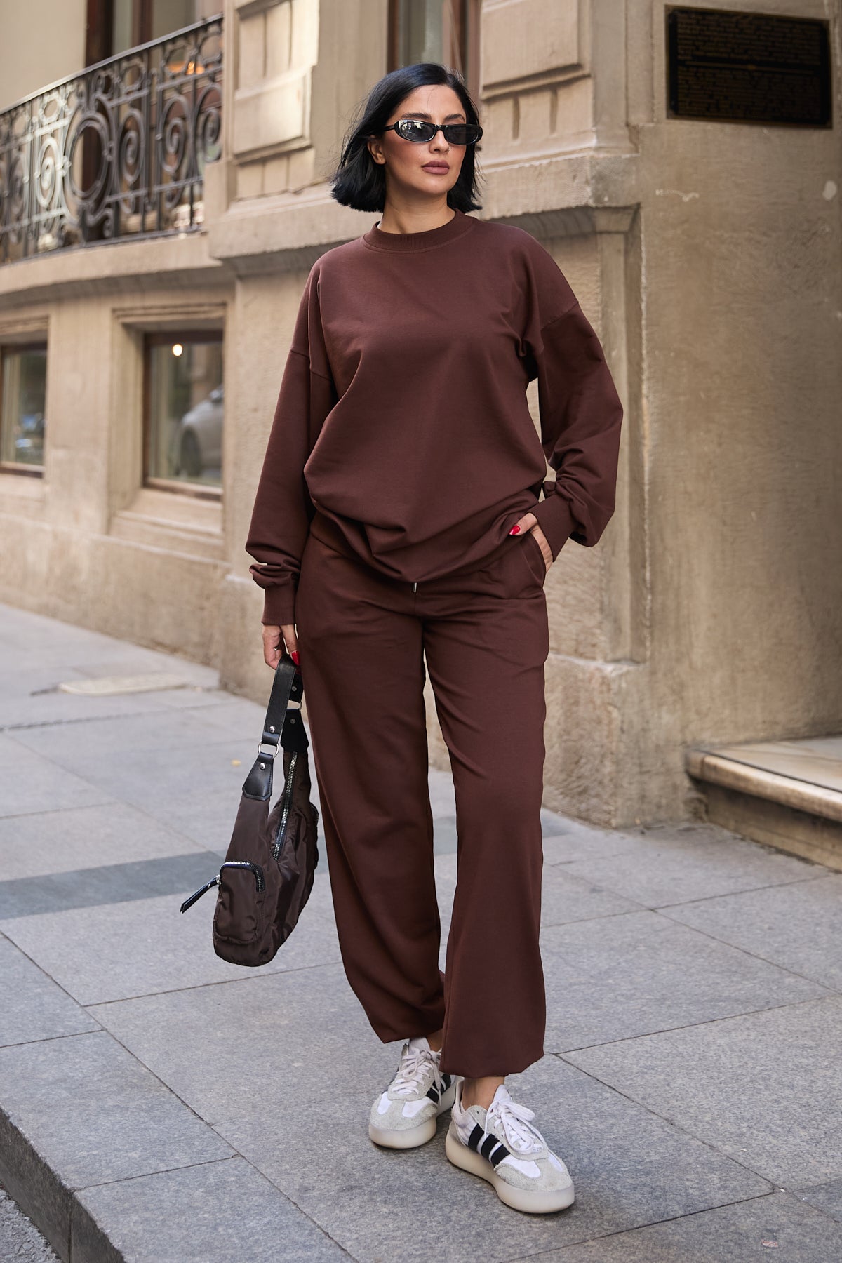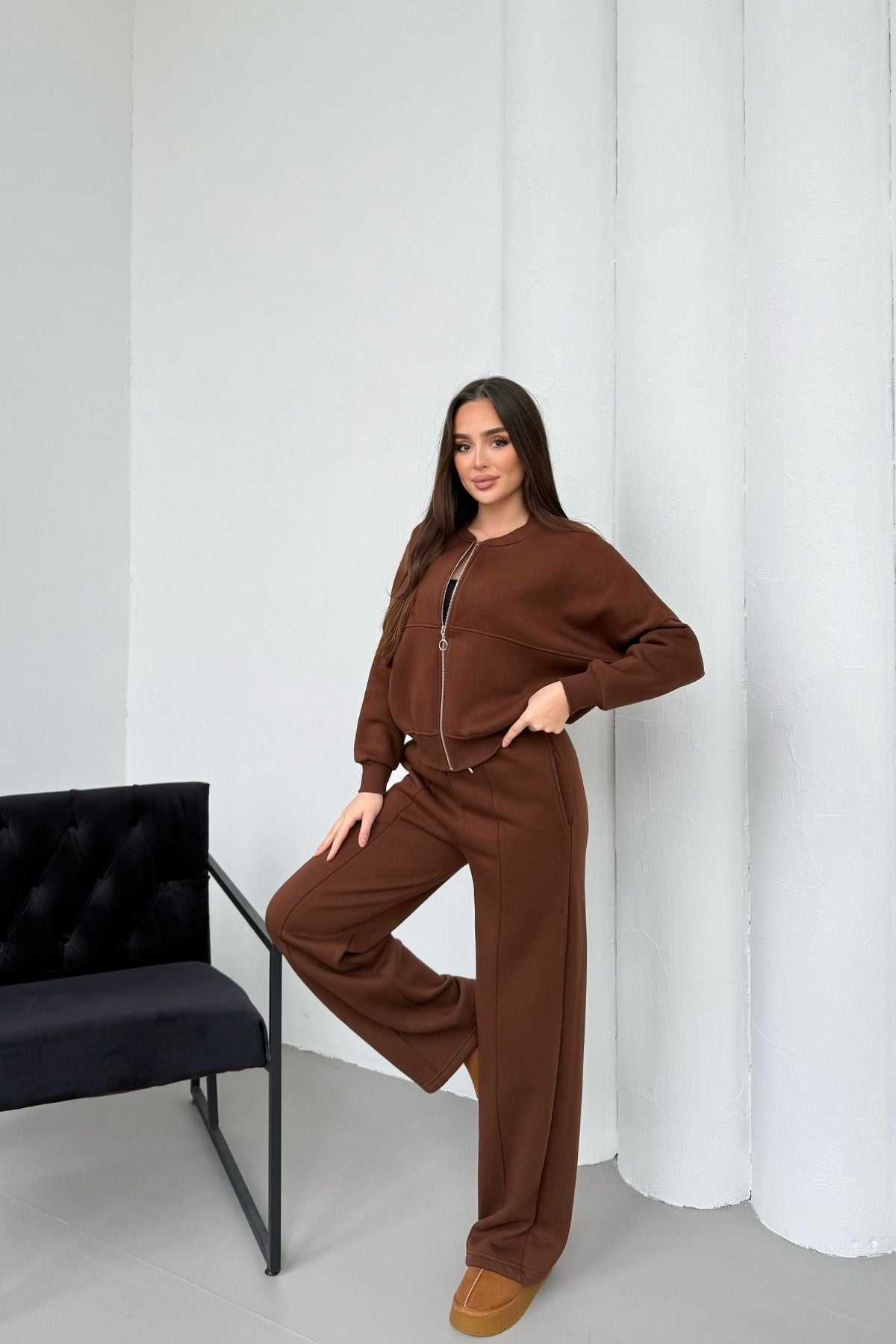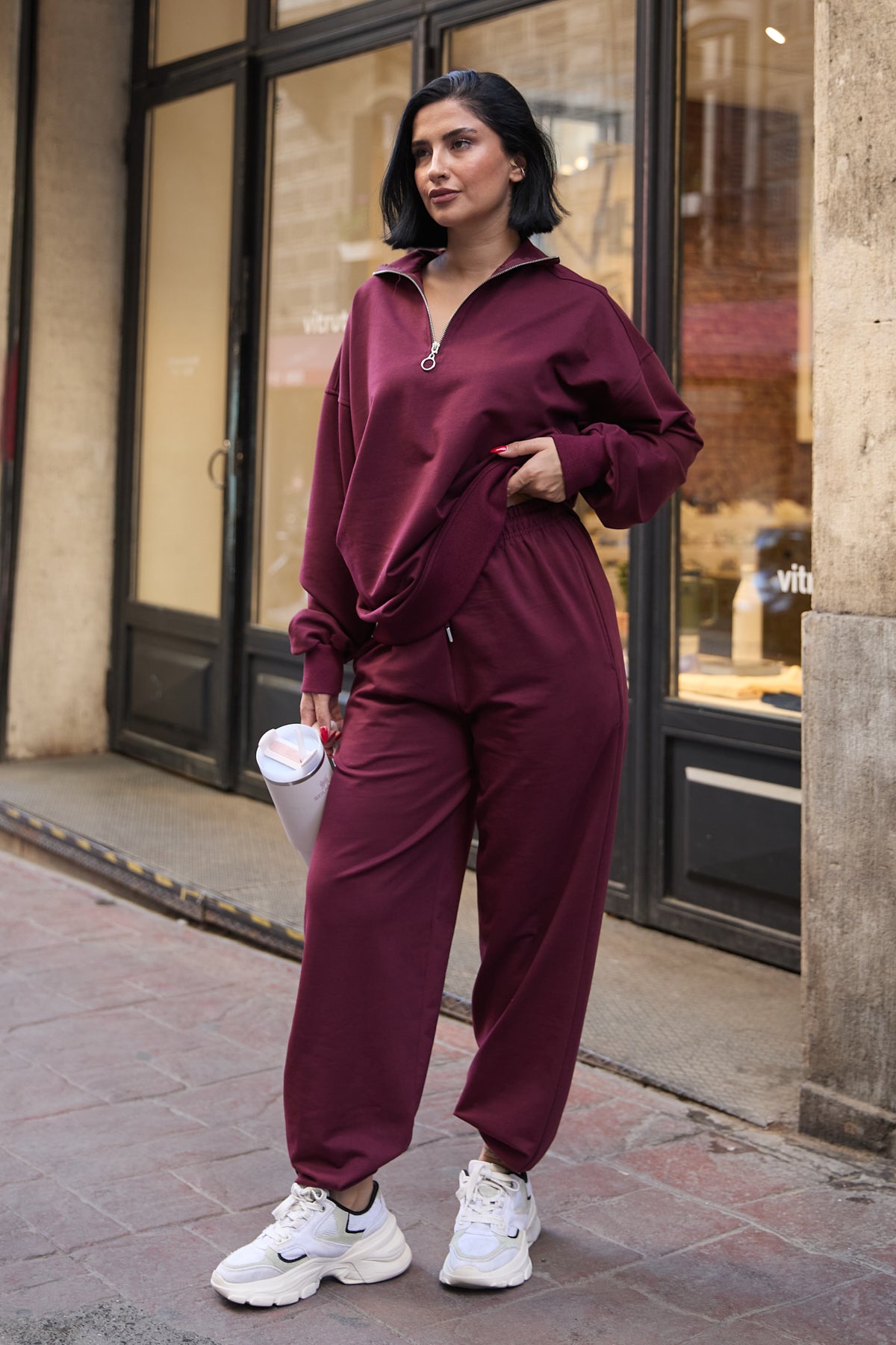 Kadın Yarım Fermuarlı Sweatshırt Ve Paçası Lastikli Kahverengi Eşofman Takımı
