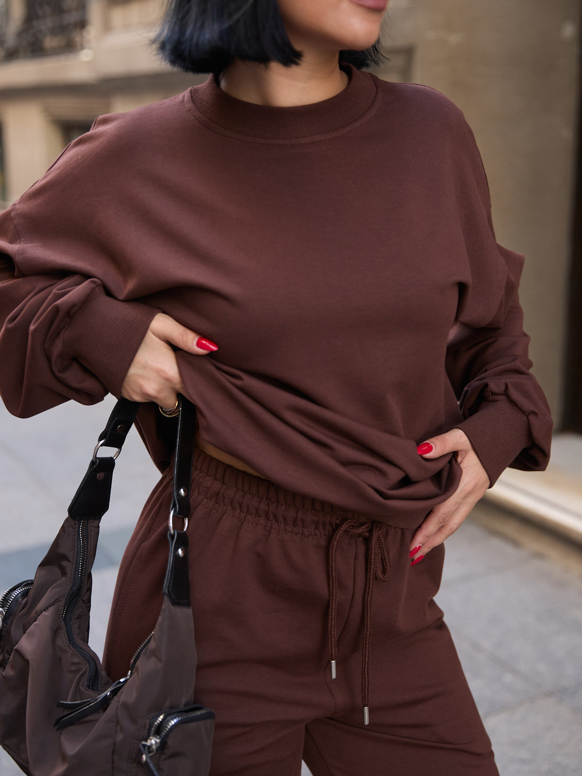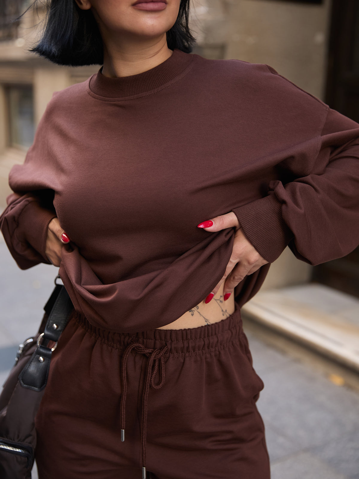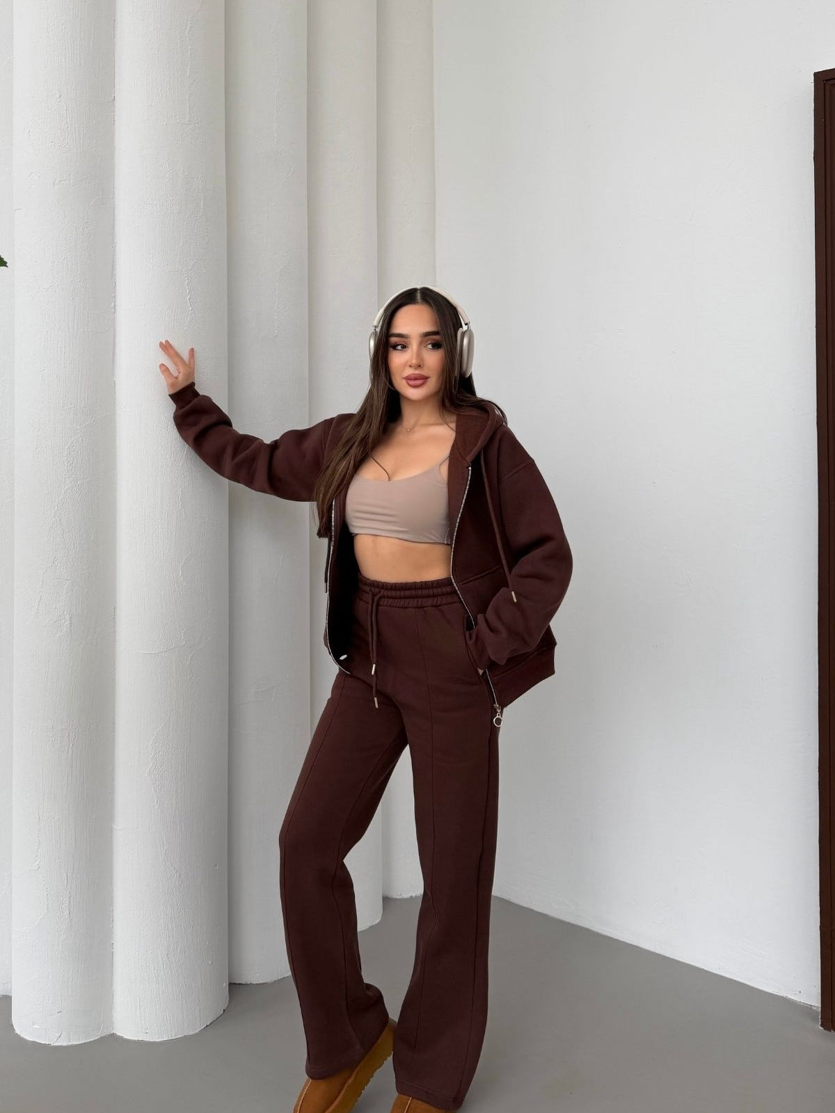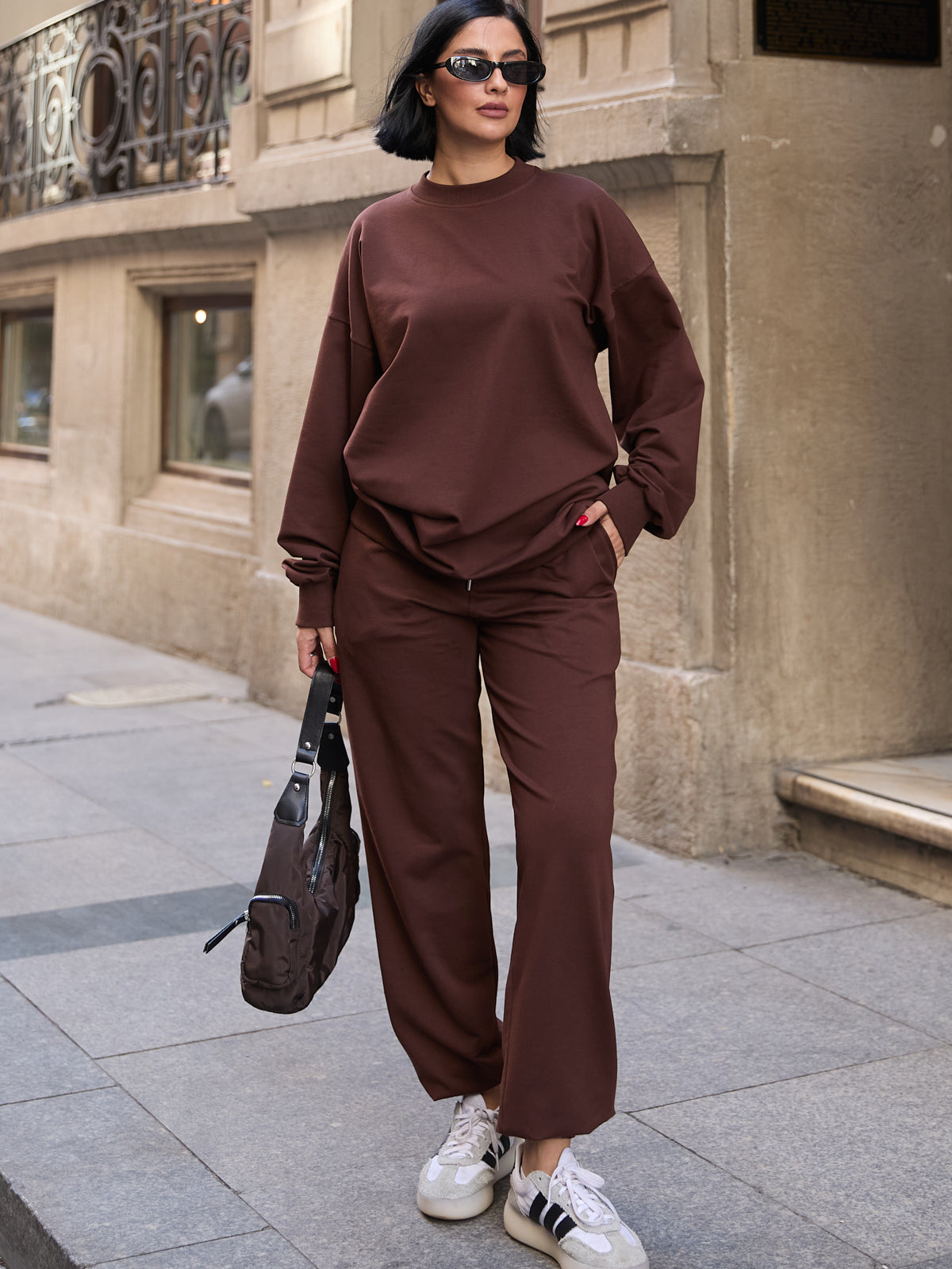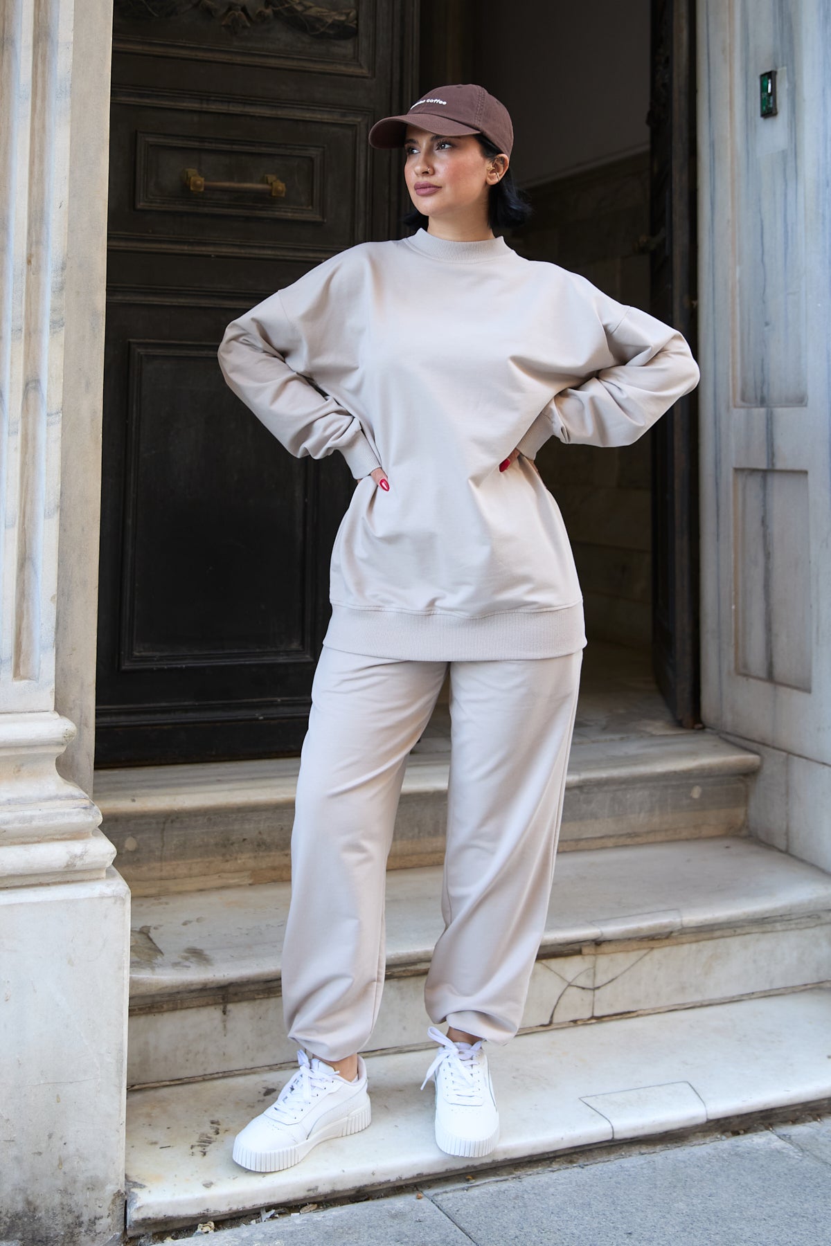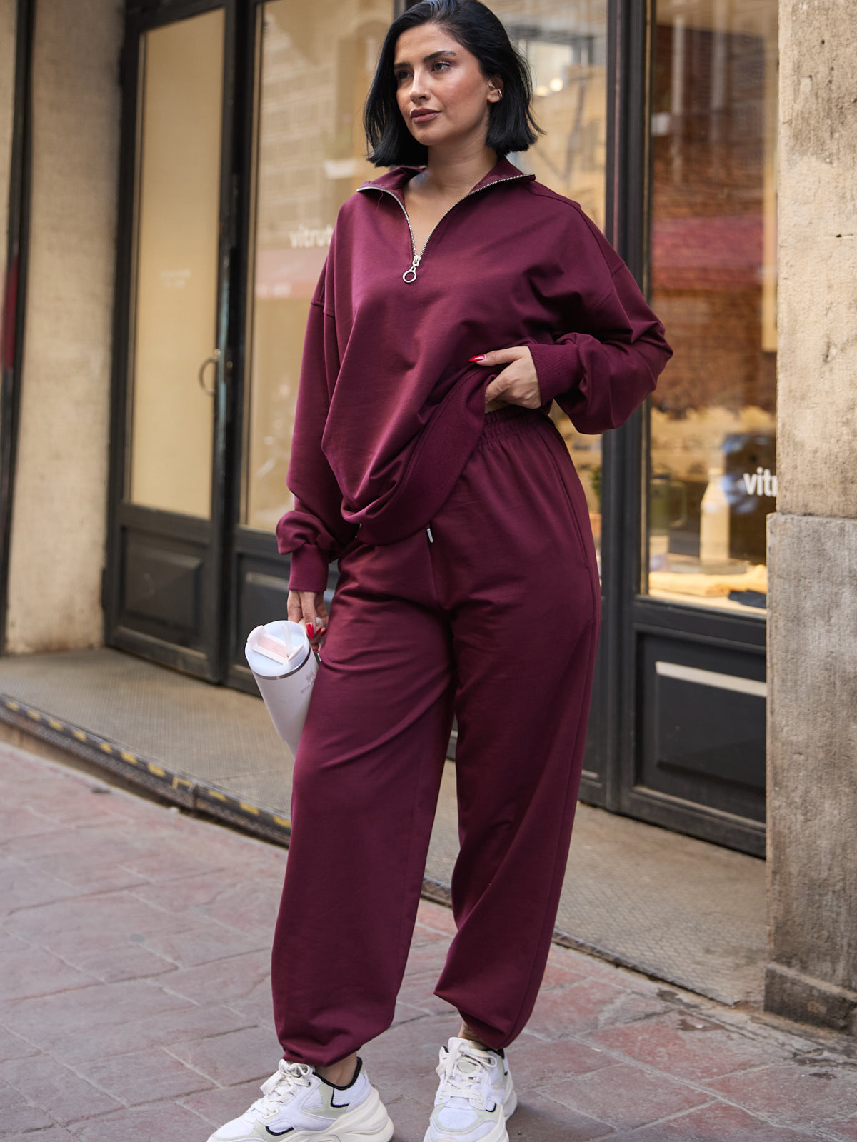 Kadın Yarım Fermuarlı Sweatshırt Ve Paçası Lastikli Kahverengi Eşofman Takımı
