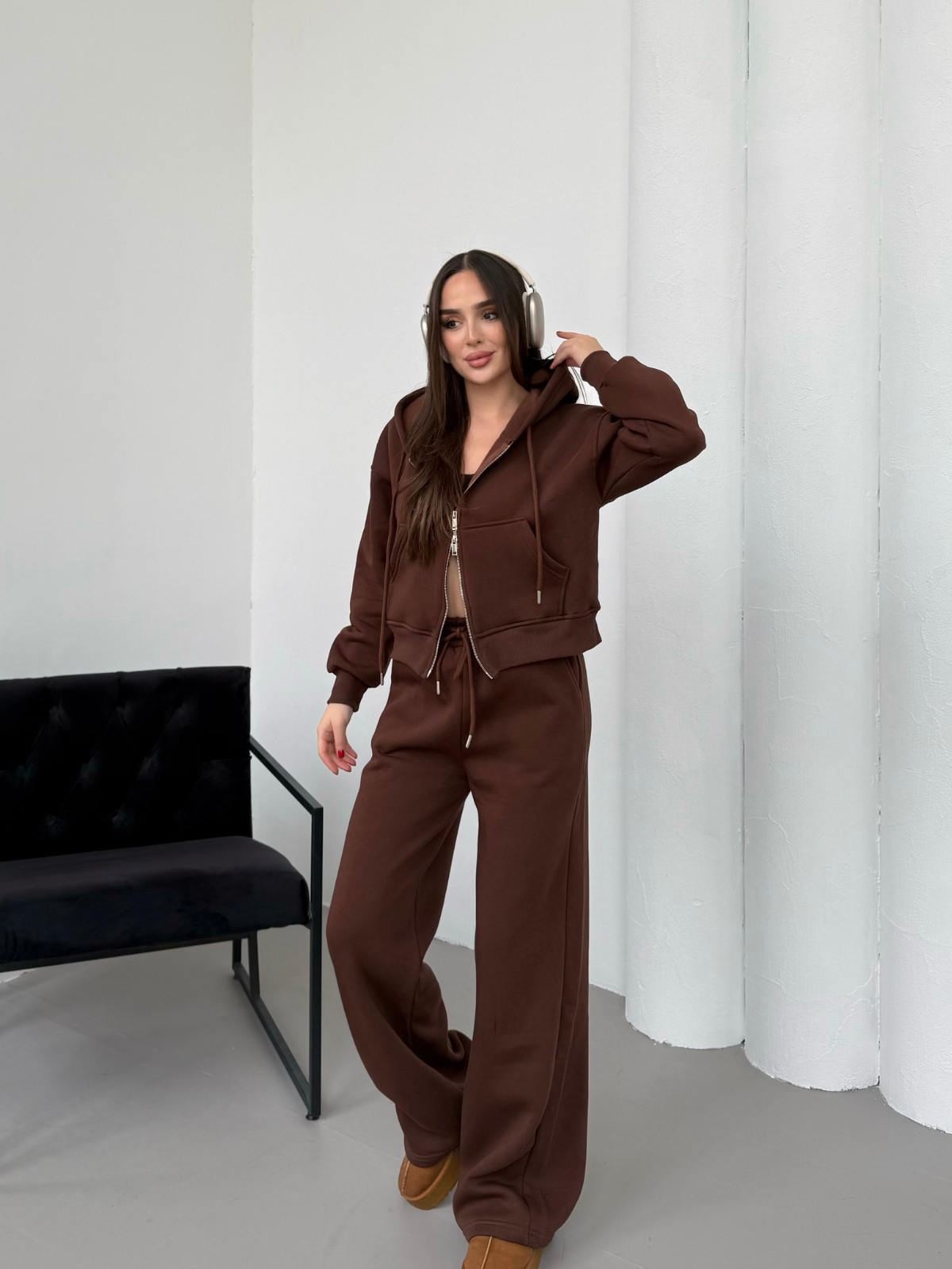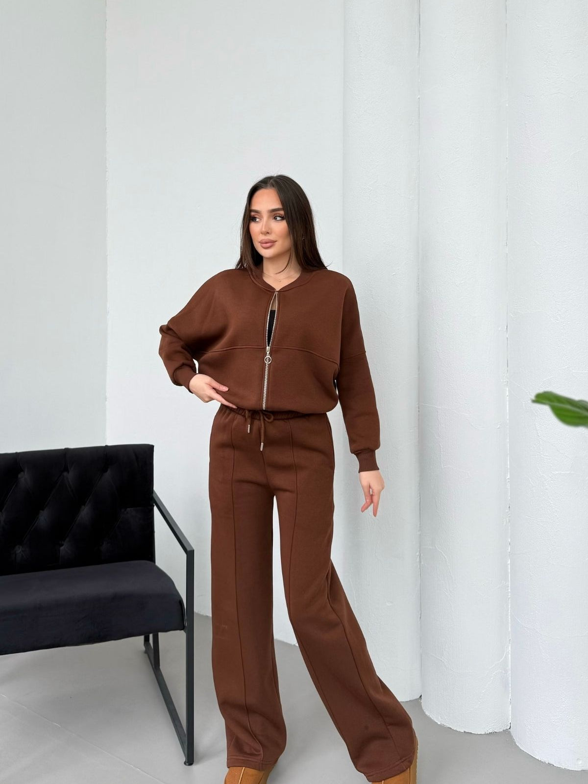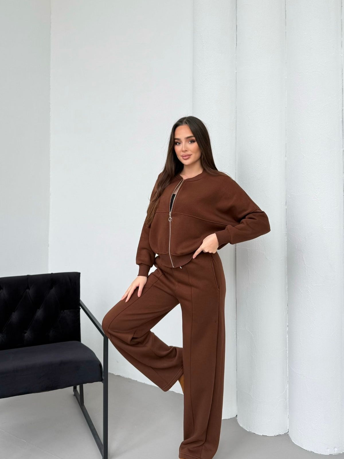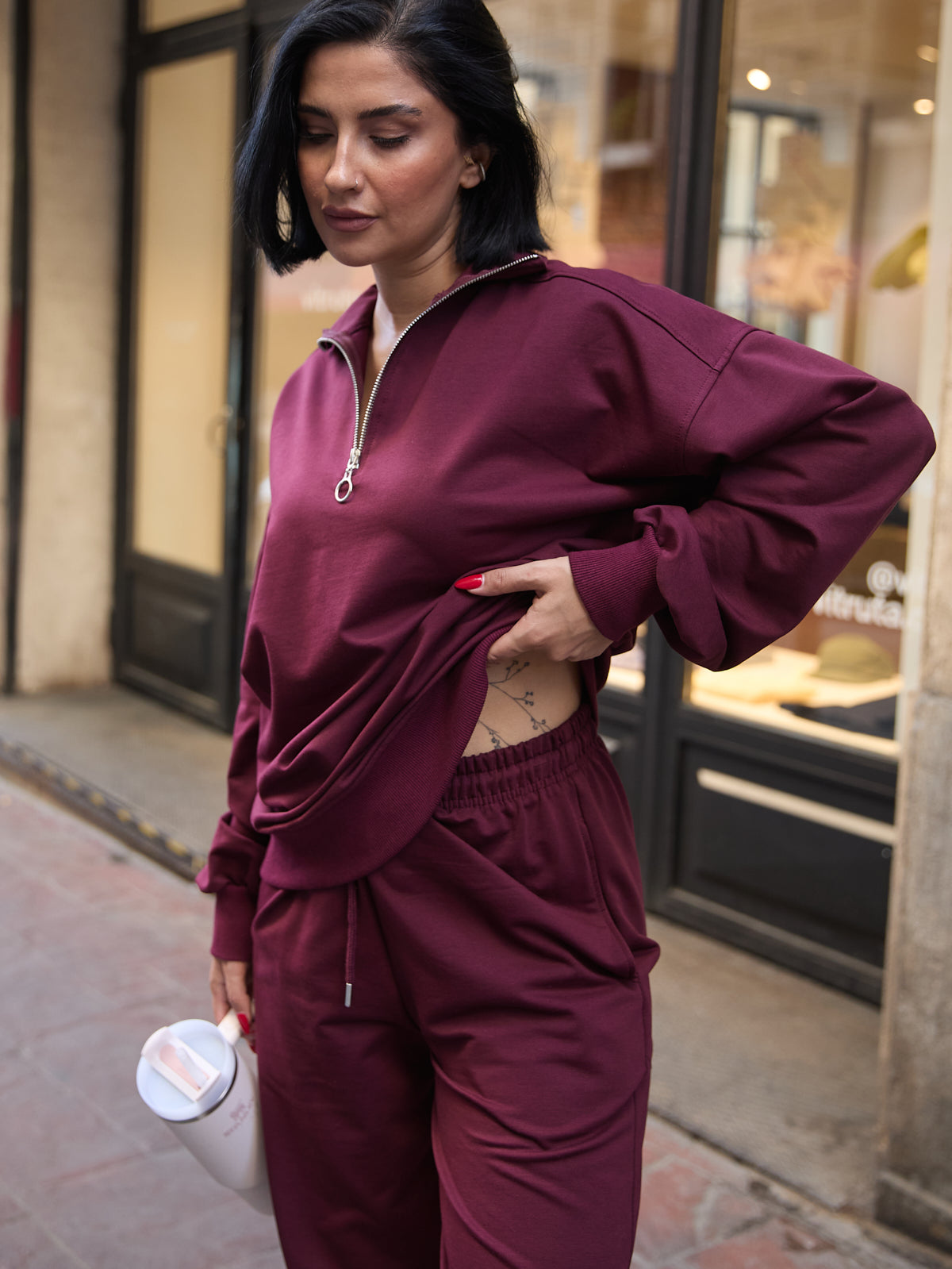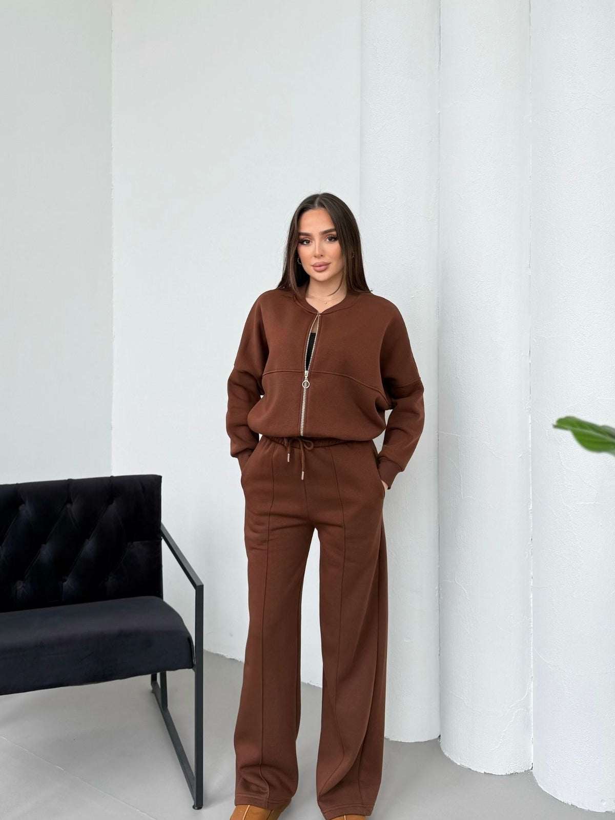 Kadın Yarım Fermuarlı Sweatshırt Ve Paçası Lastikli Kahverengi Eşofman Takımı