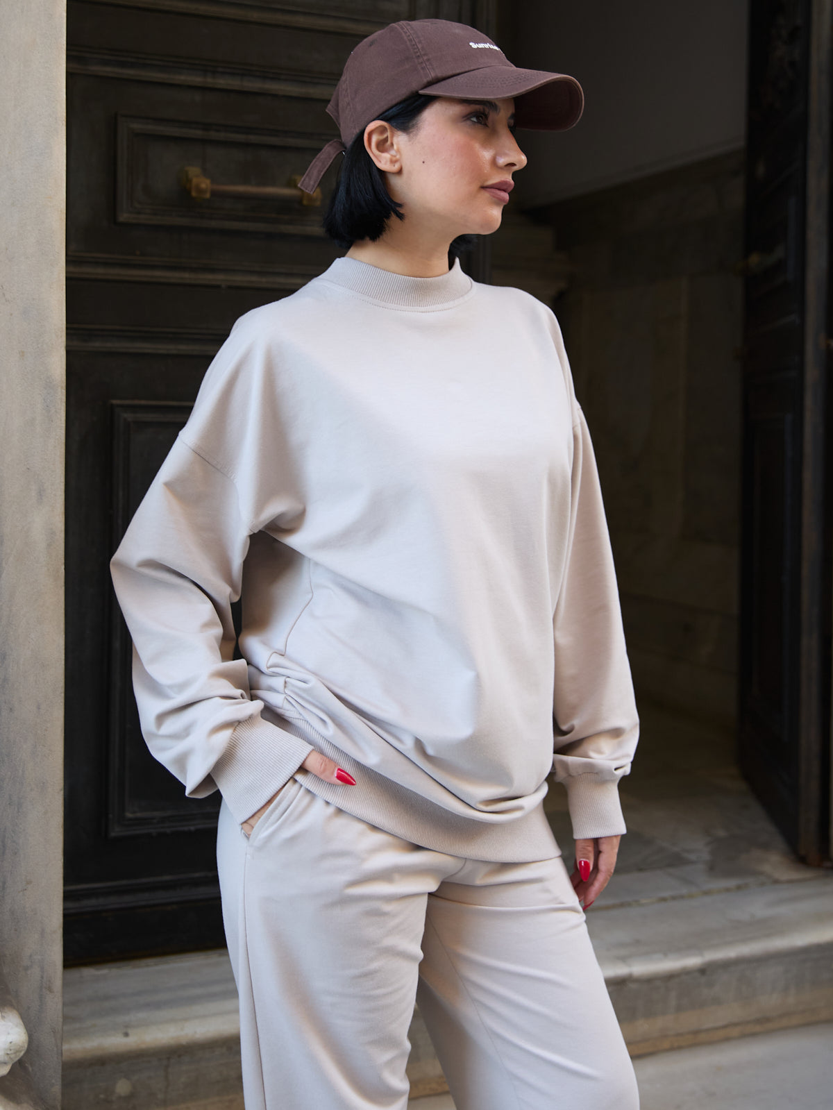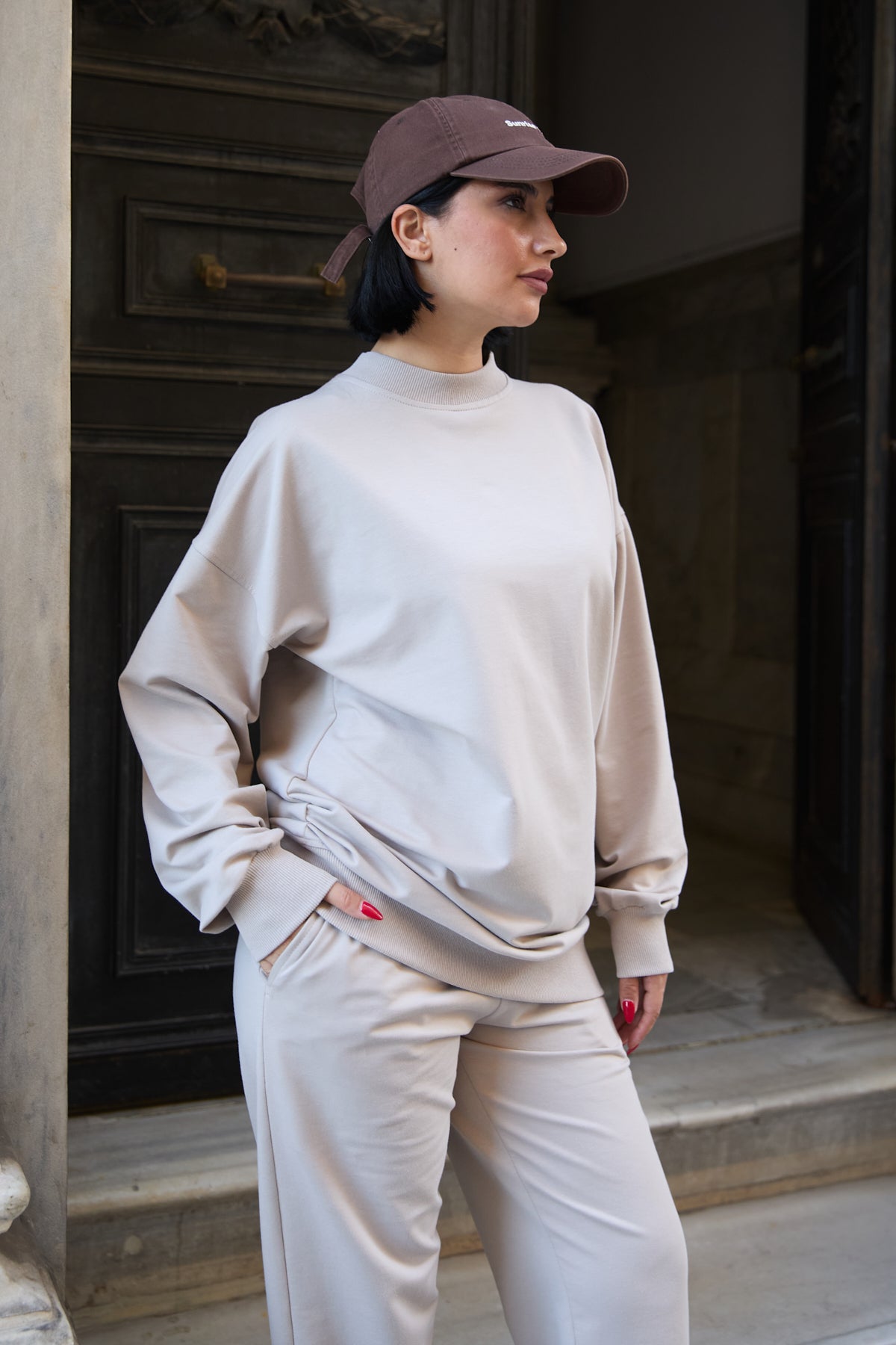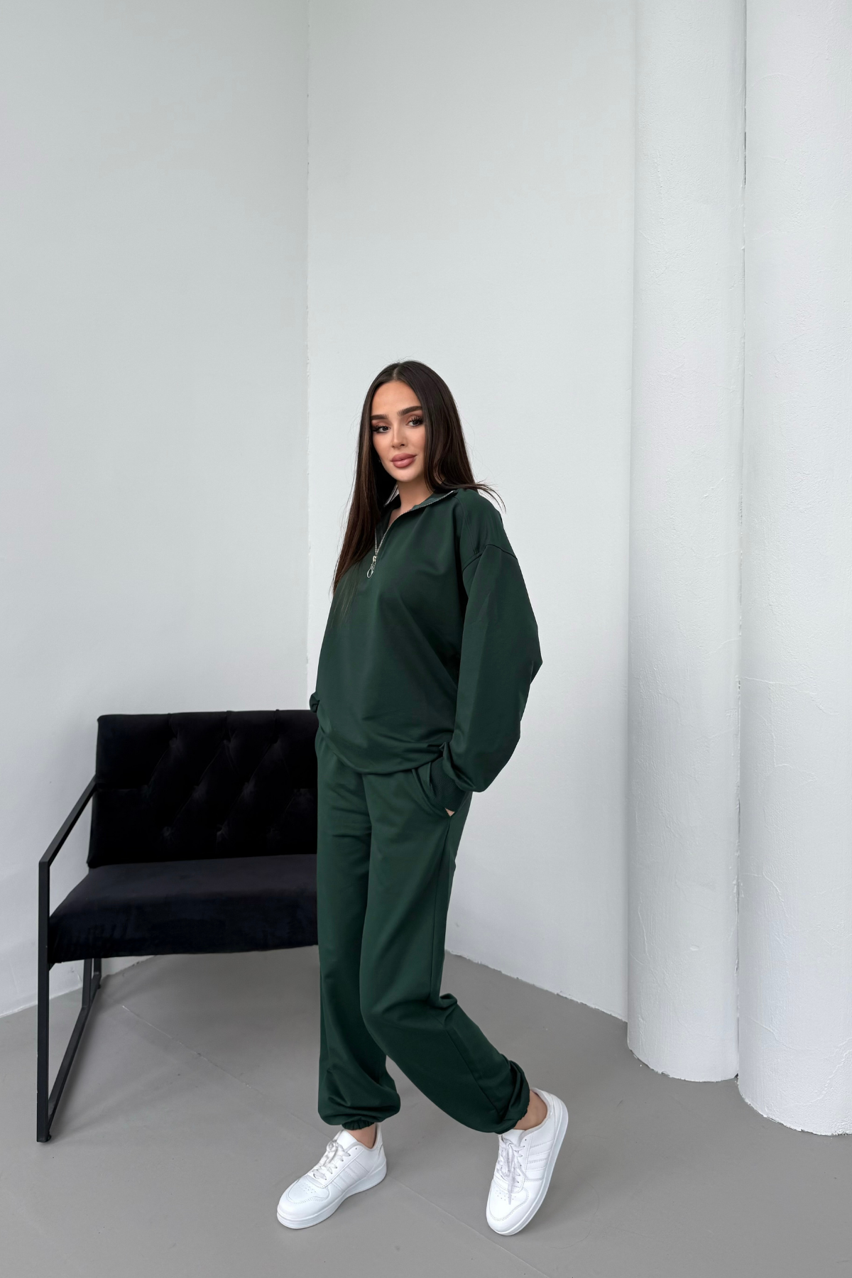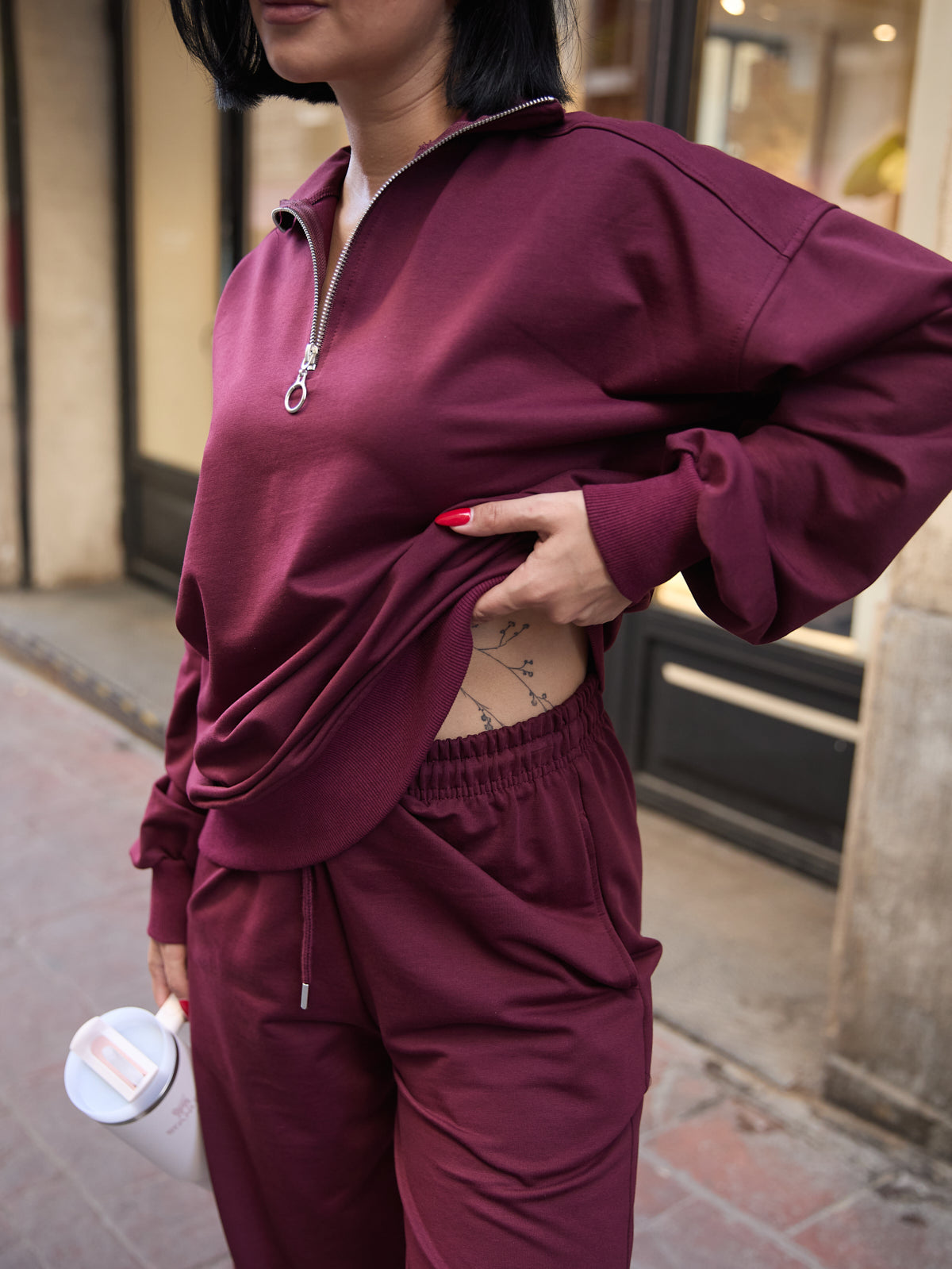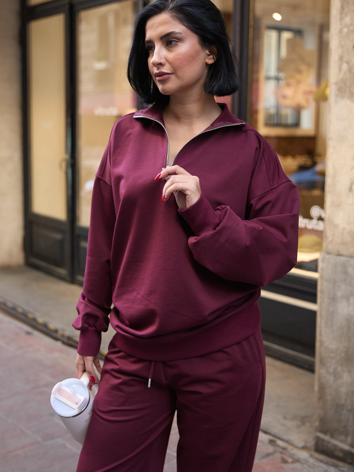 Kadın Yarım Fermuarlı Sweatshırt Ve Paçası Lastikli Kahverengi Eşofman Takımı