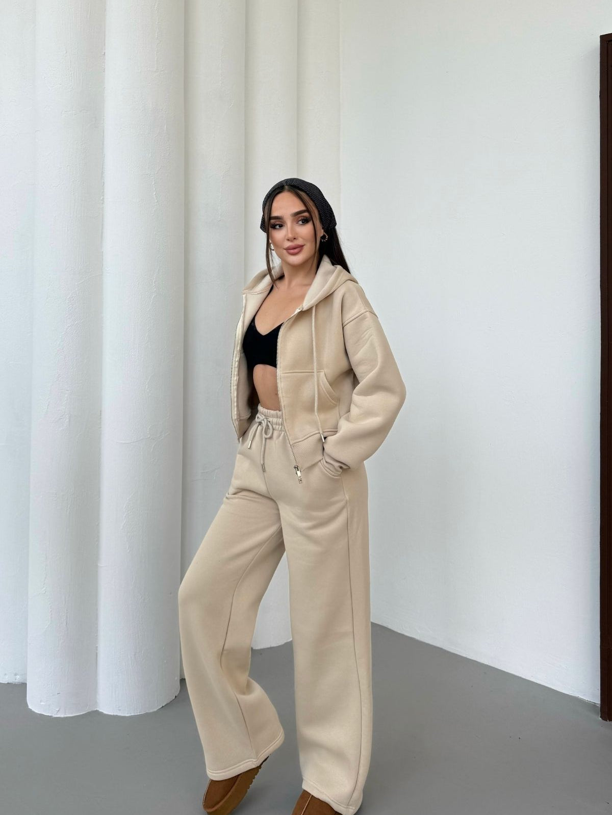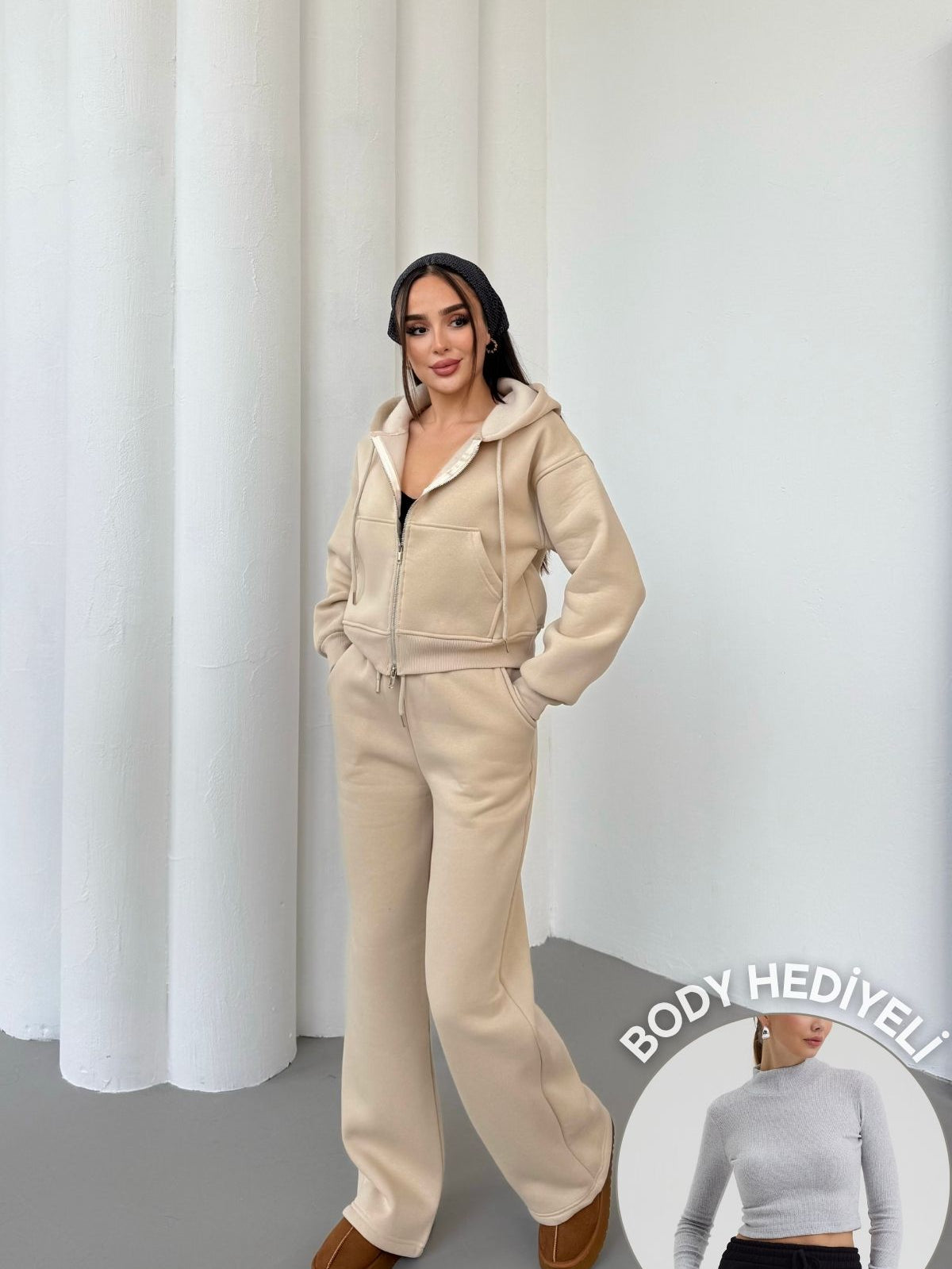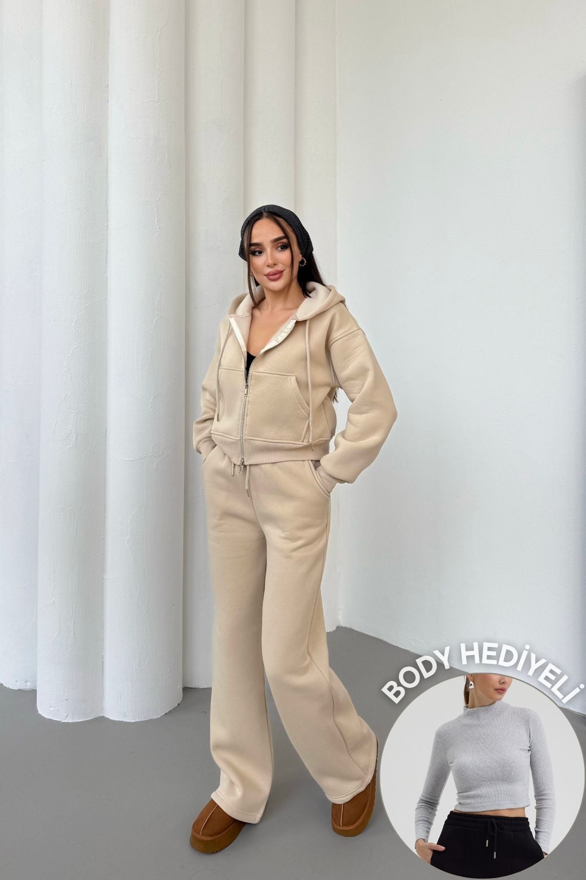 Kadın Çift Fermuar Detaylı Kapüşonlu Kışlık Şardonlu Oversize Eşofman Takımı