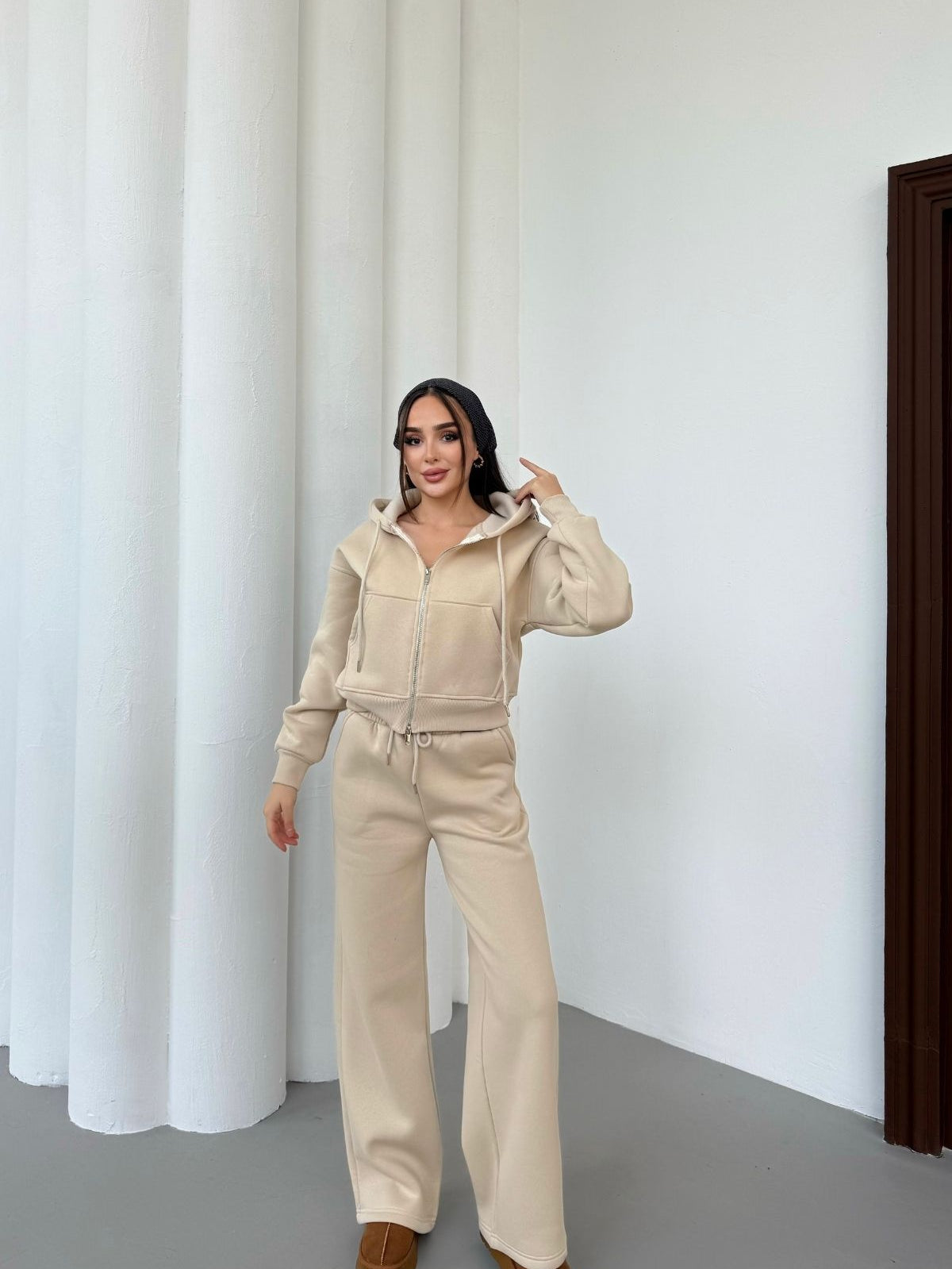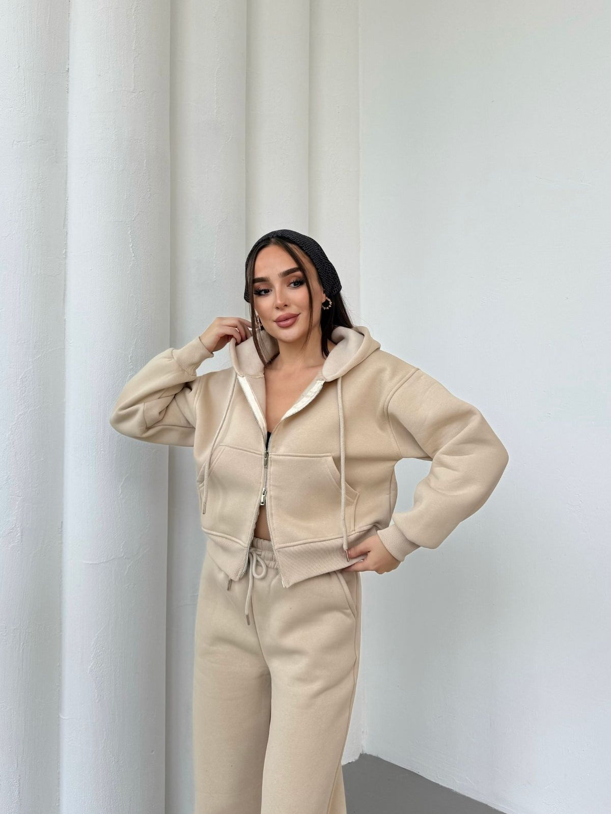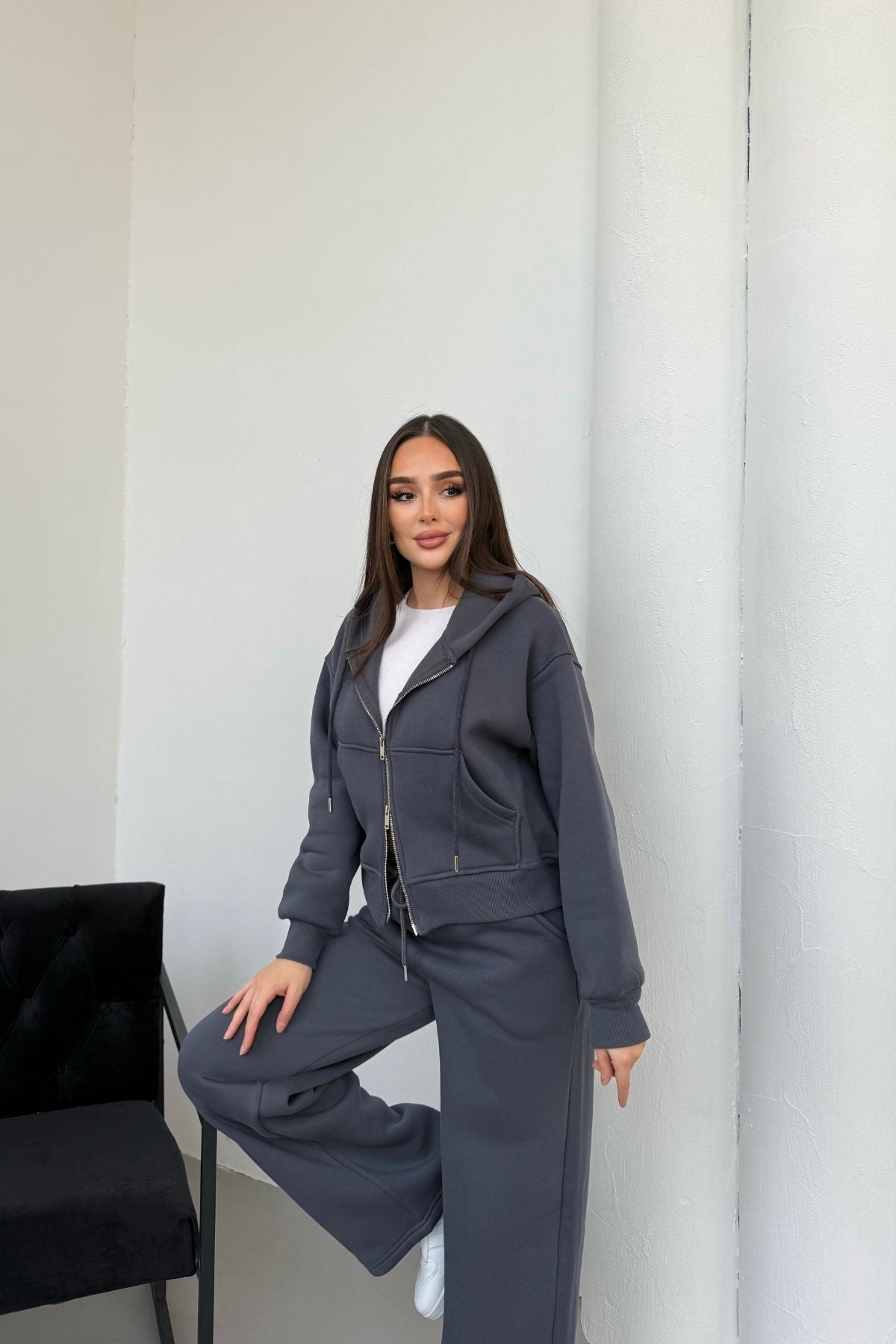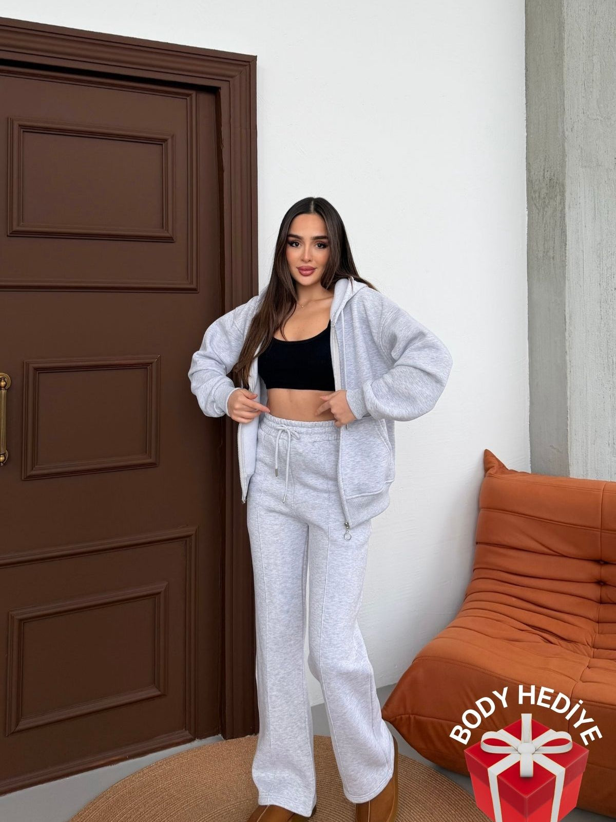Kadın Çift Fermuar Detaylı Kapüşonlu Kışlık Şardonlu Oversize Eşofman Takımı