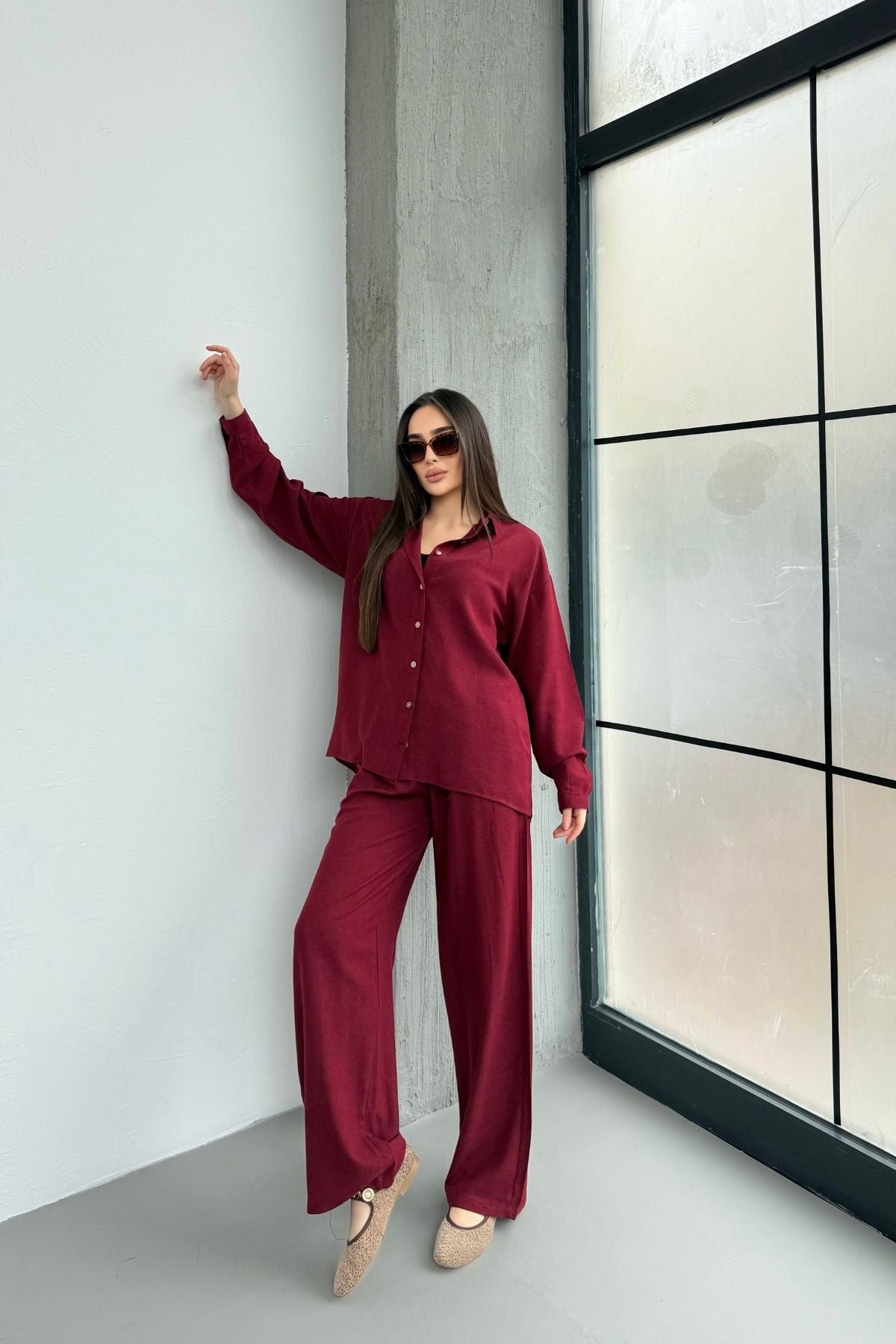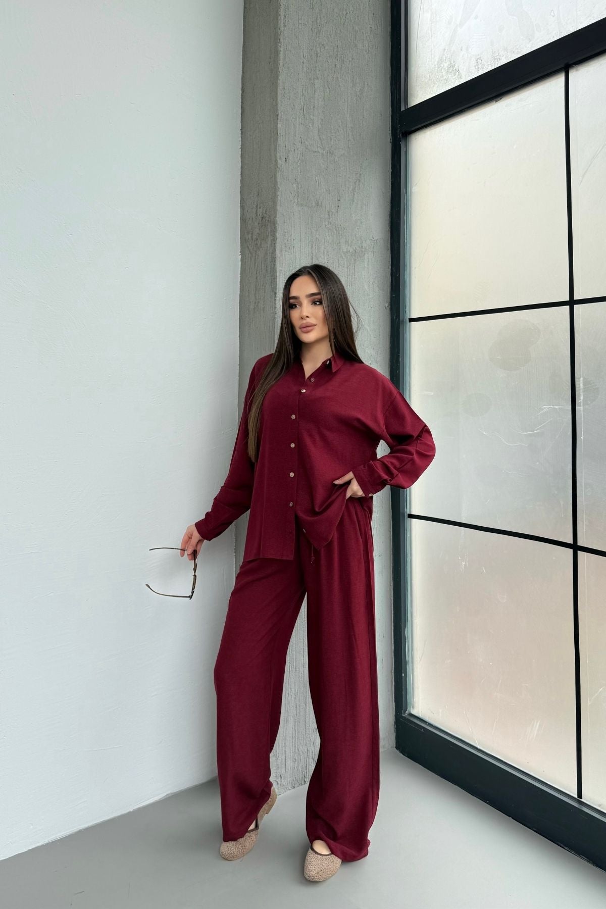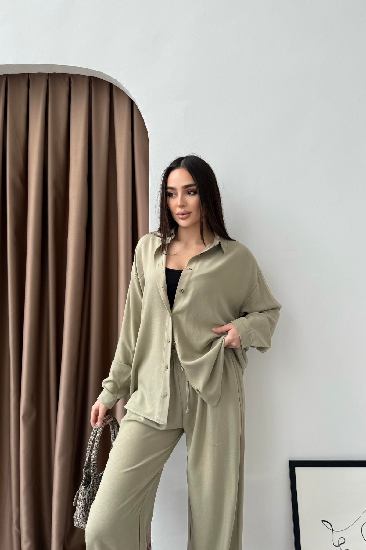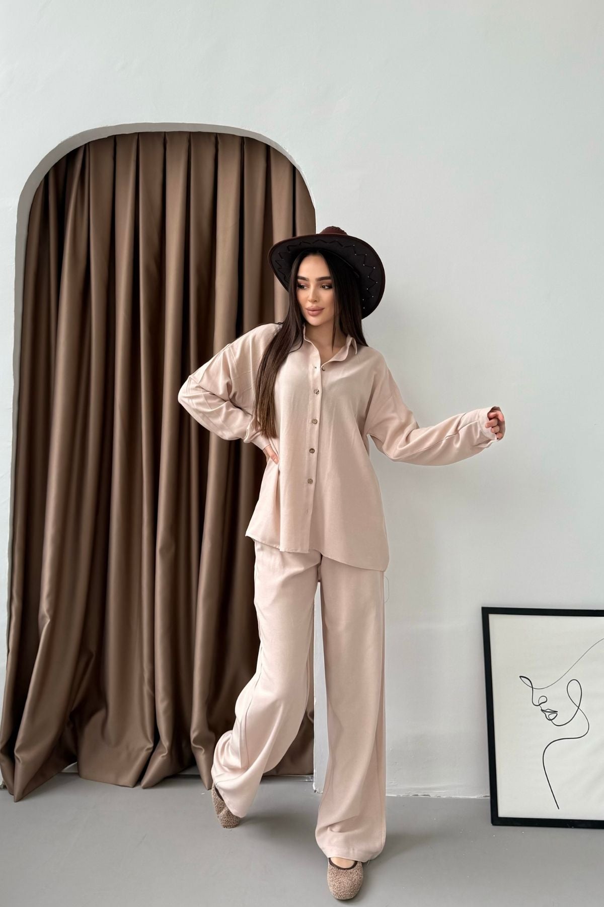 Kadın İkili Rahat Kesim Keten Gömlek Pantolon Alt Üst Takım