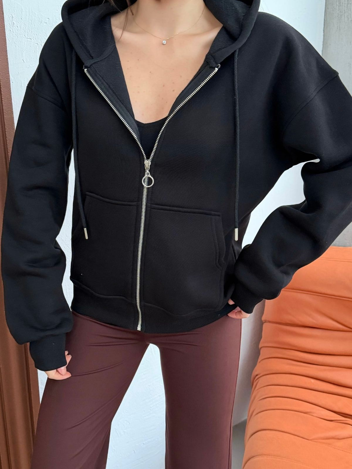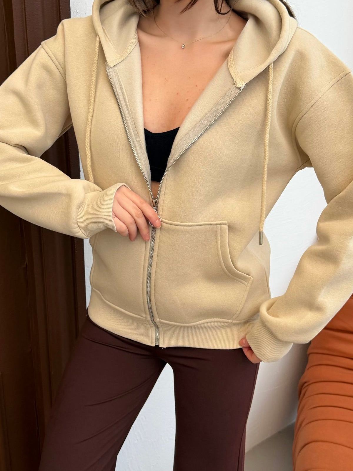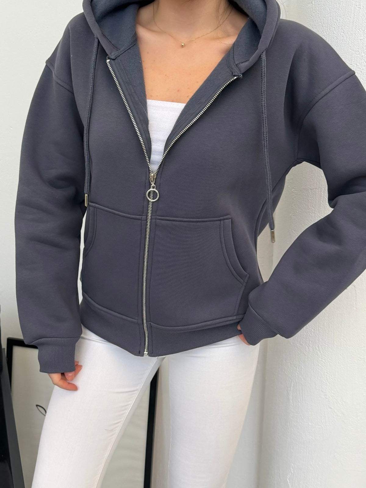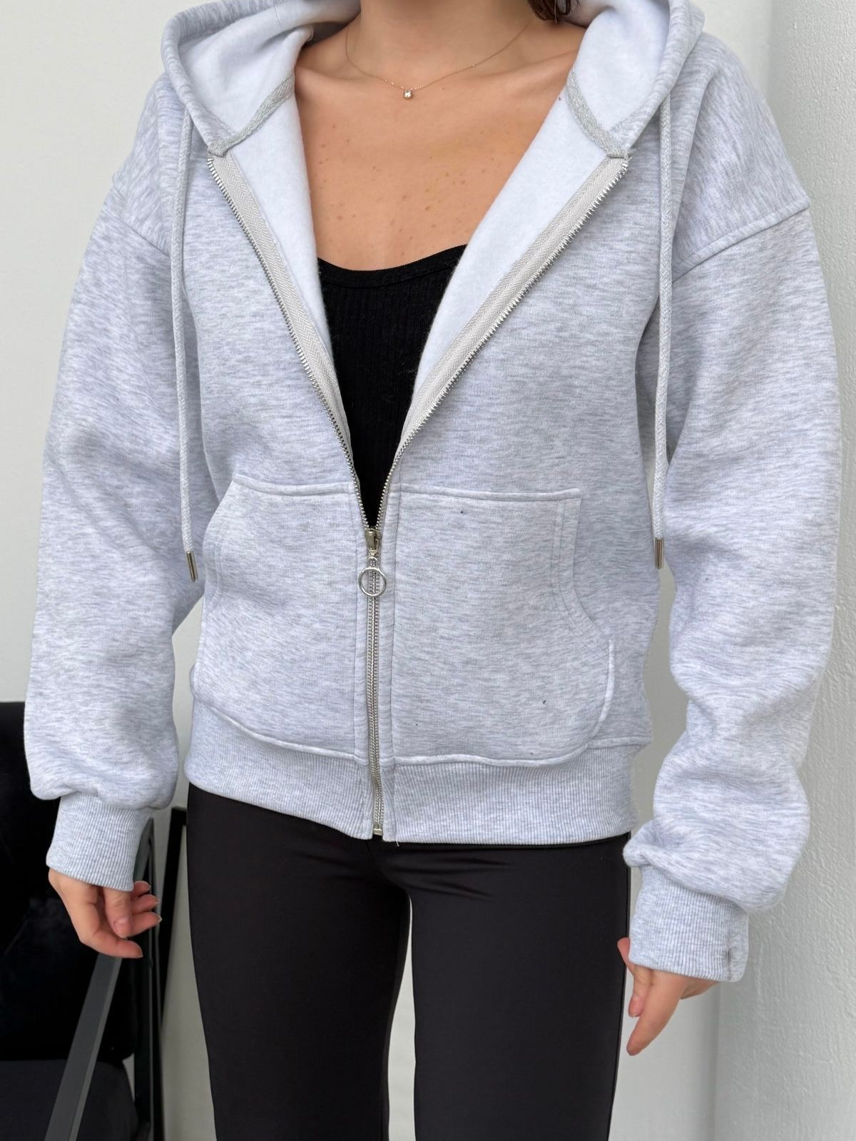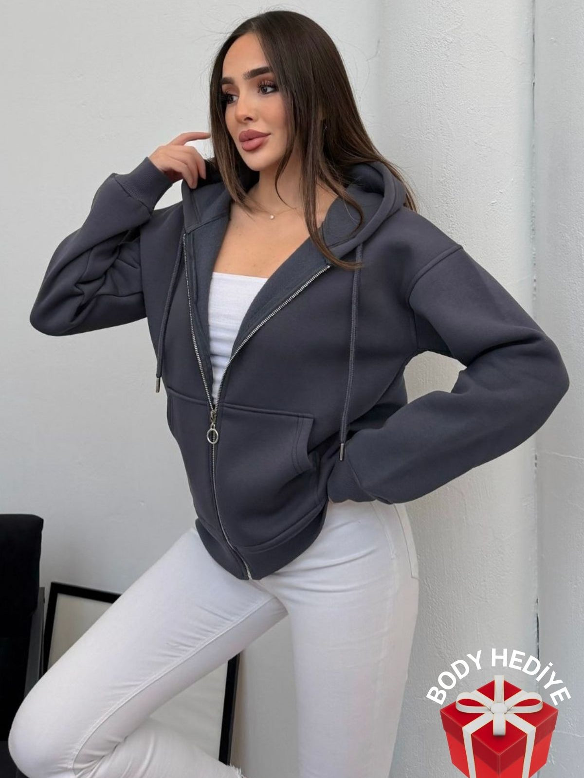 Kadın Kapüşonlu Bağcıklı Sweatshirt Fermuarlı 3 İplik Şardonlu Rahat Kesim