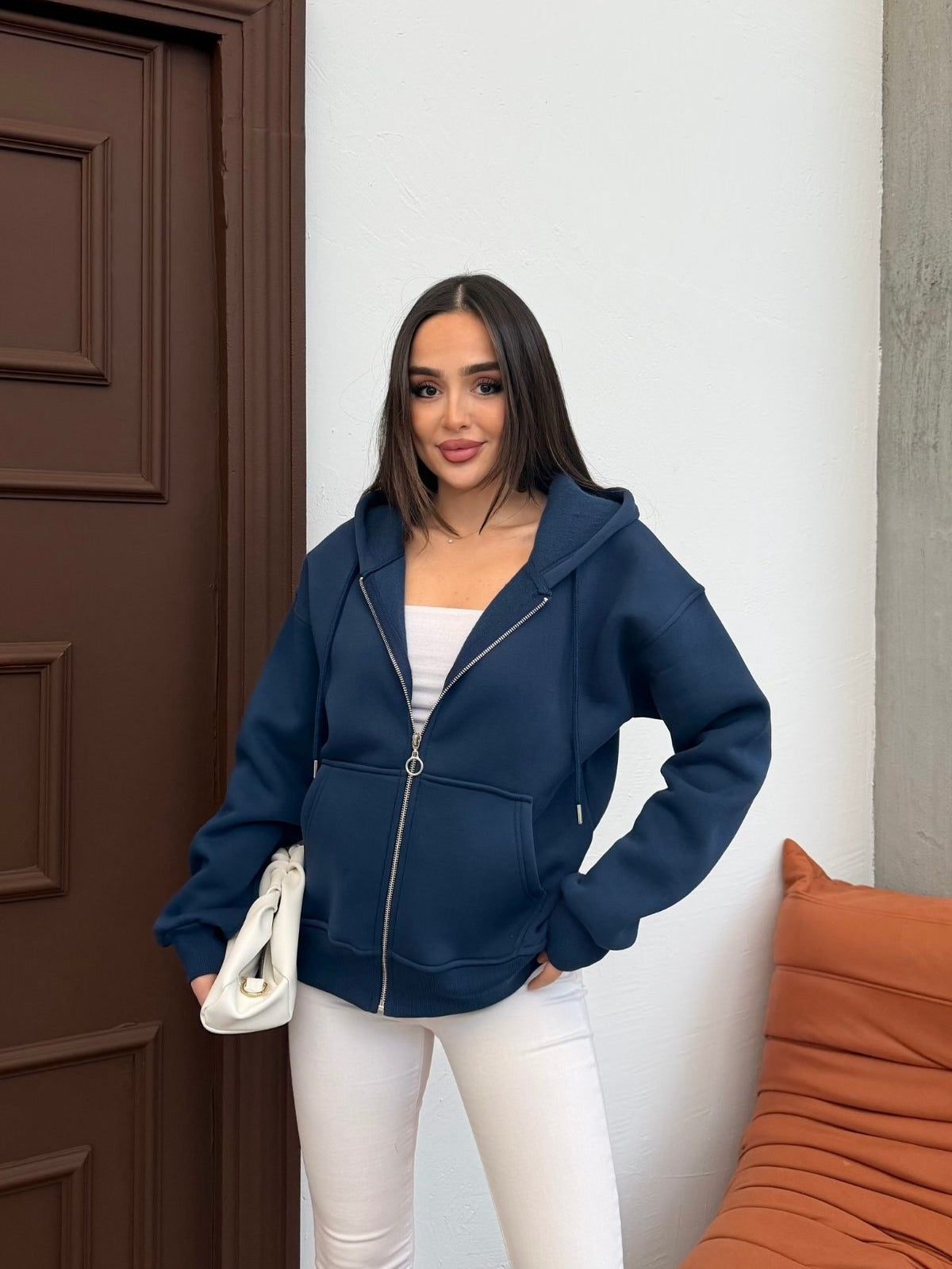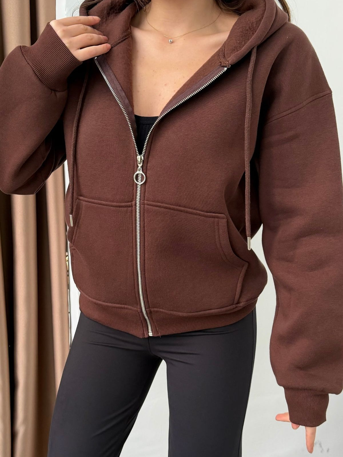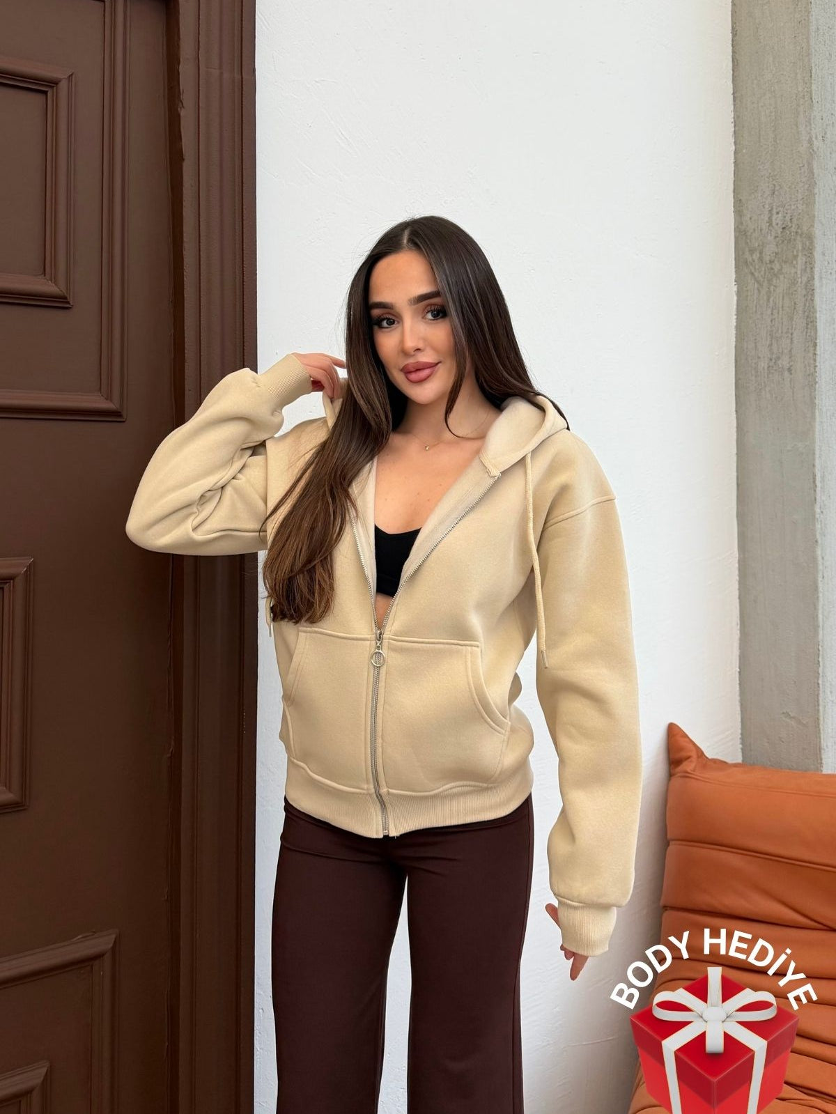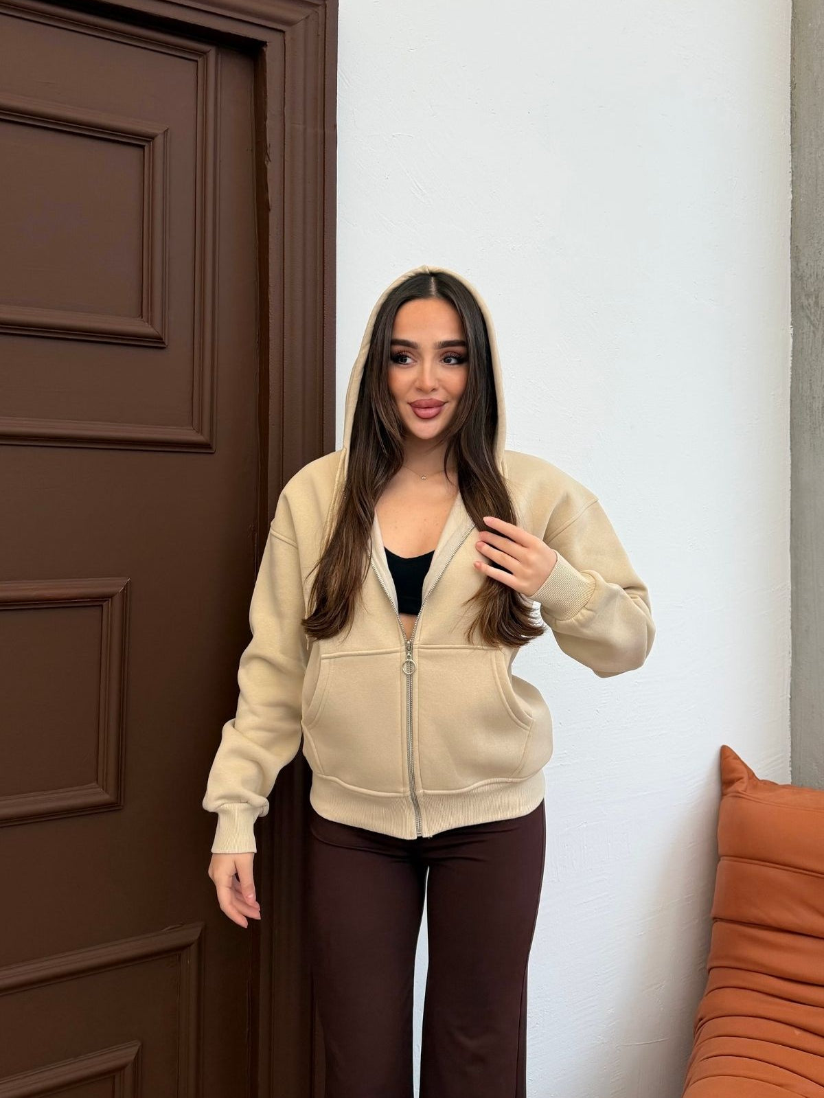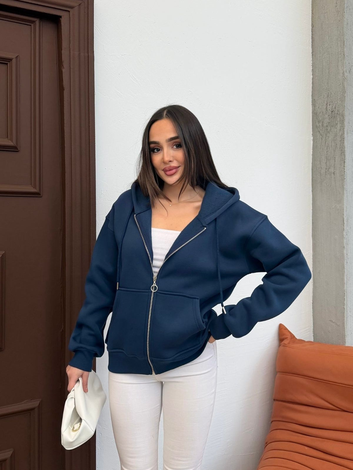 Kadın Kapüşonlu Bağcıklı Sweatshirt Fermuarlı 3 İplik Şardonlu Rahat Kesim