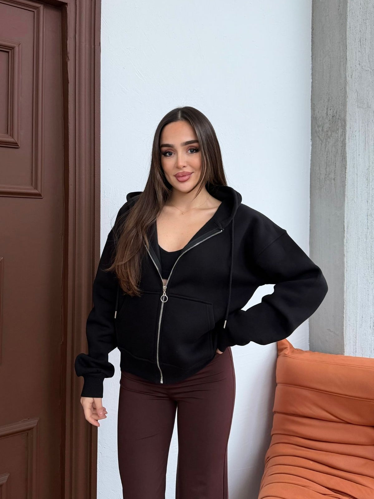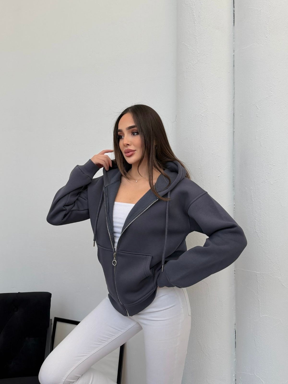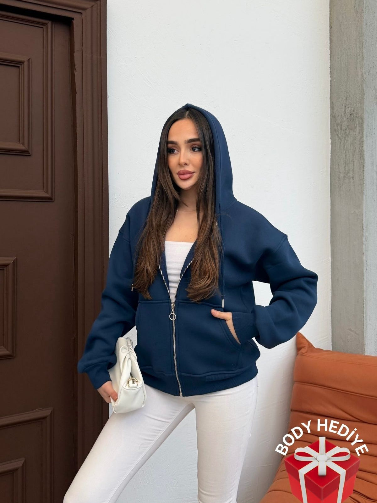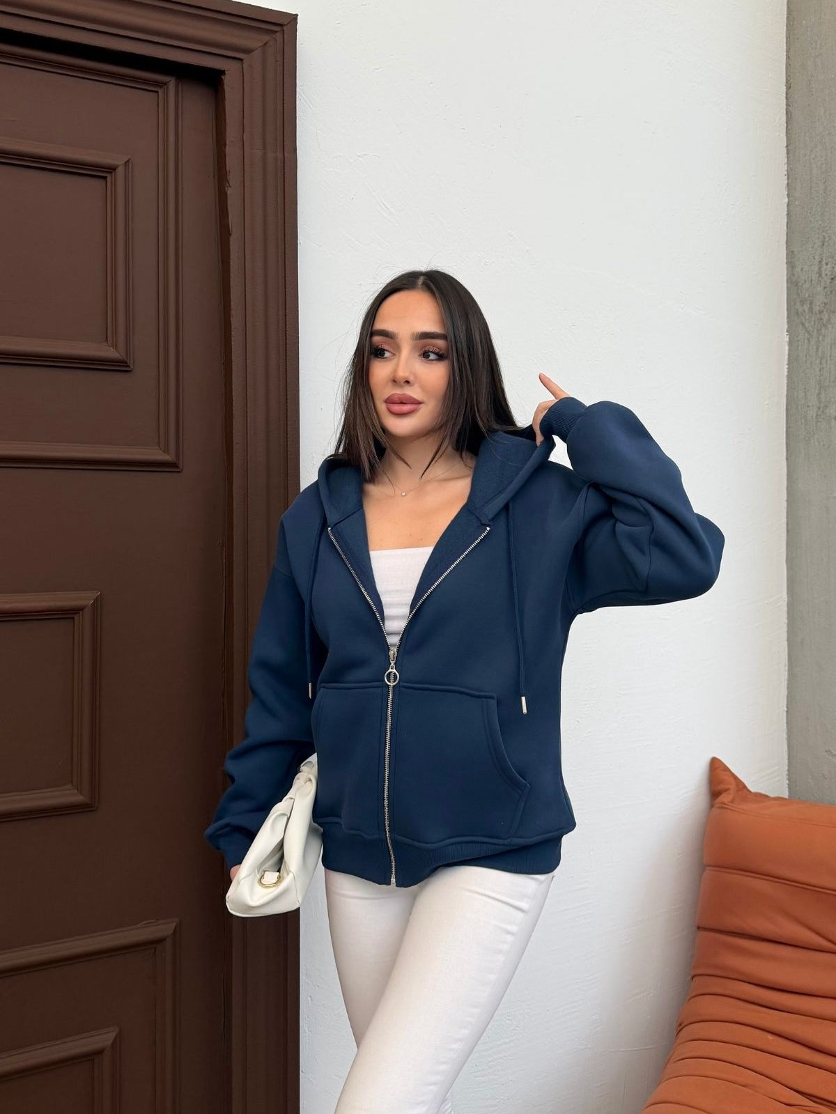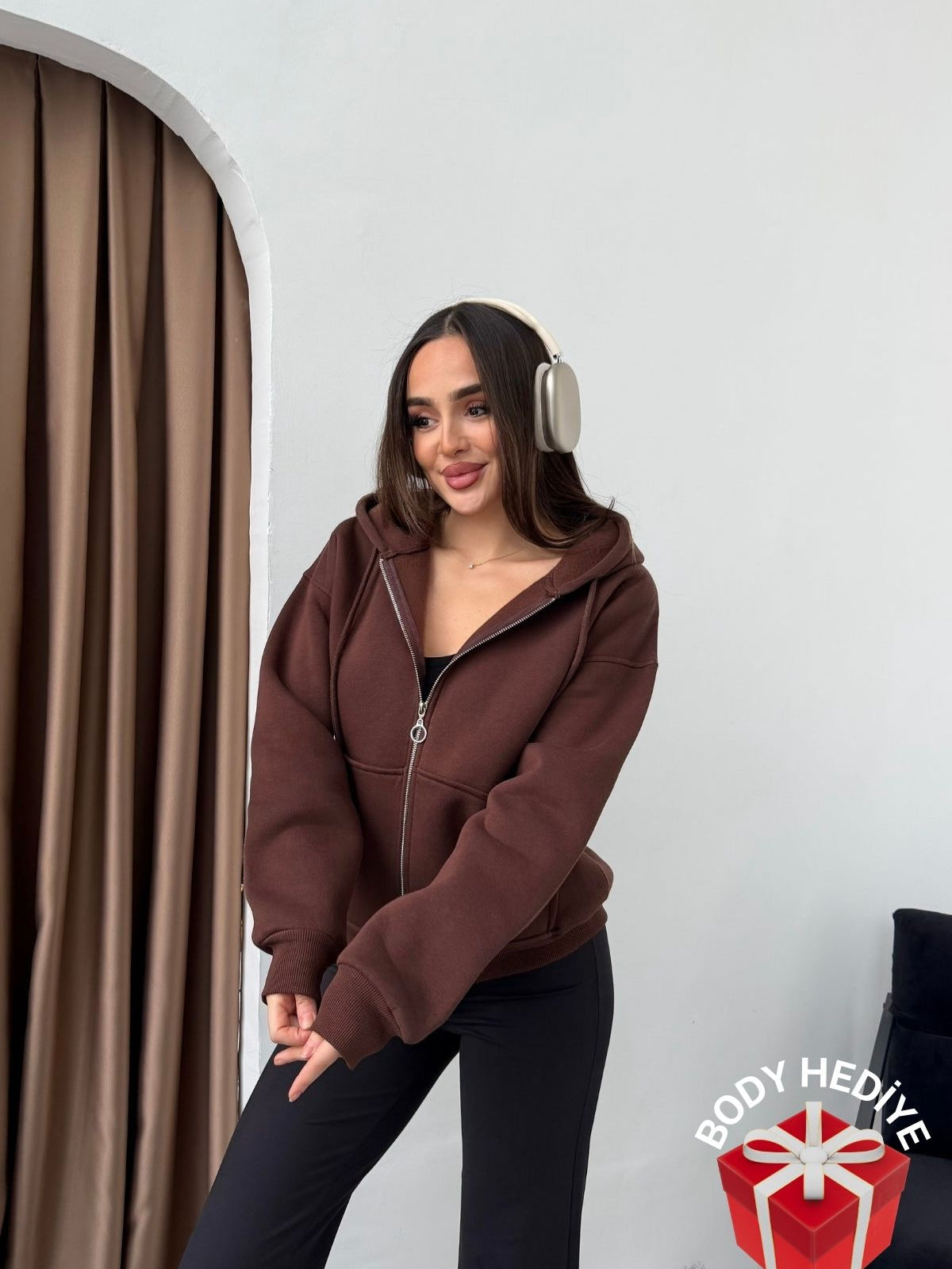 Kadın Kapüşonlu Bağcıklı Sweatshirt Fermuarlı 3 İplik Şardonlu Rahat Kesim