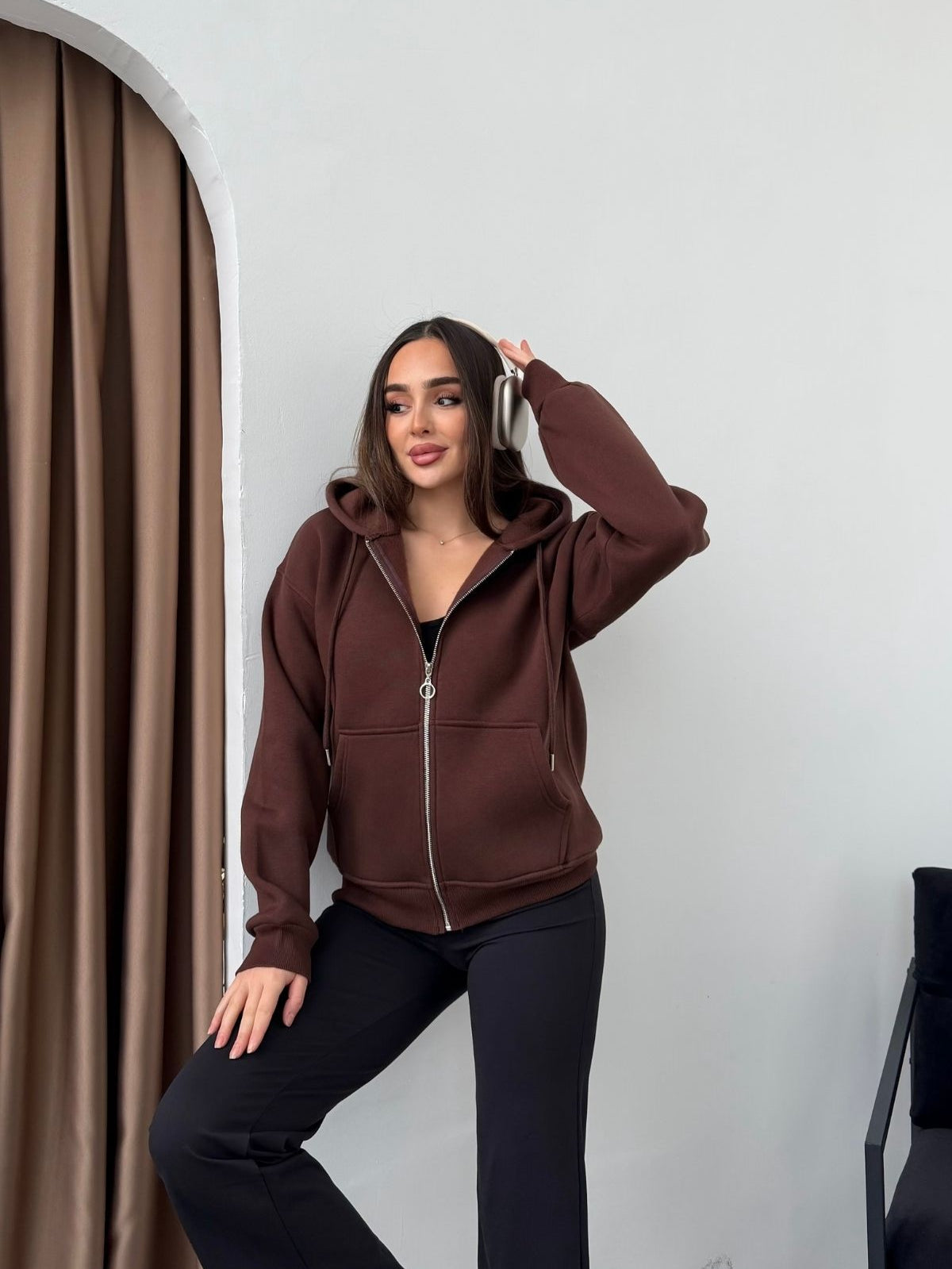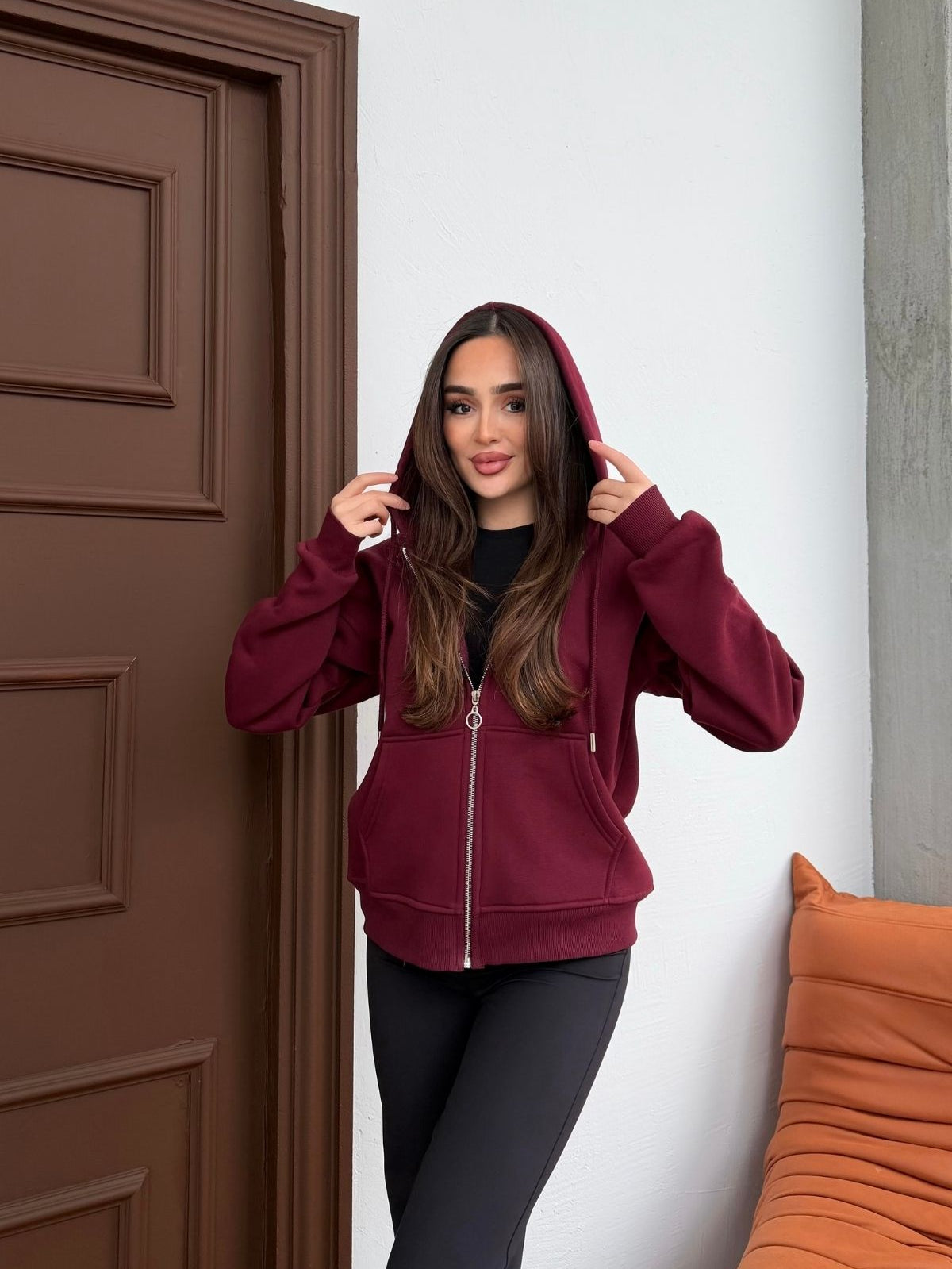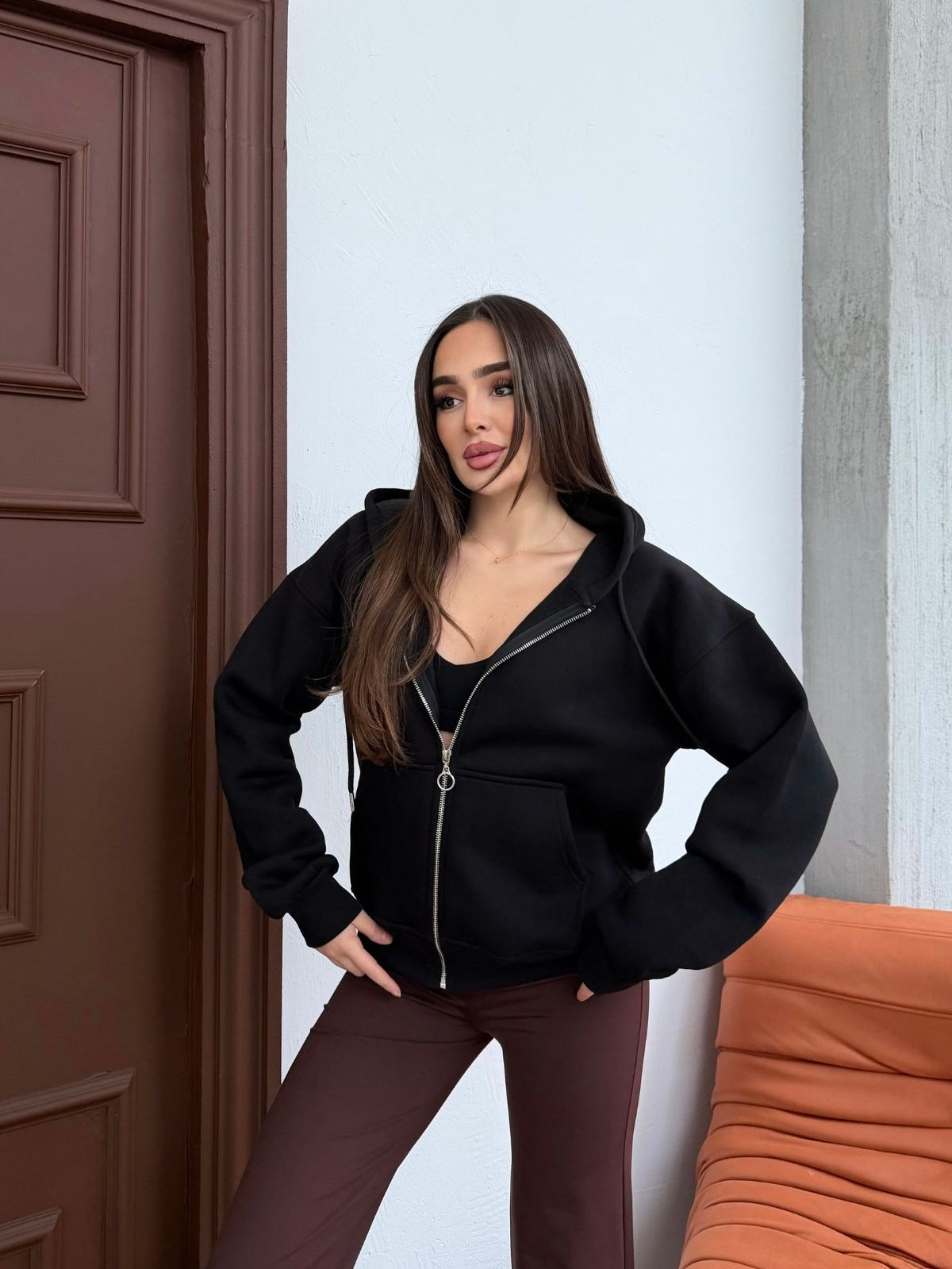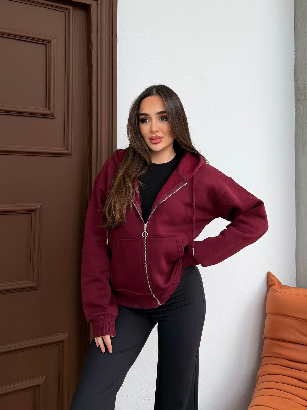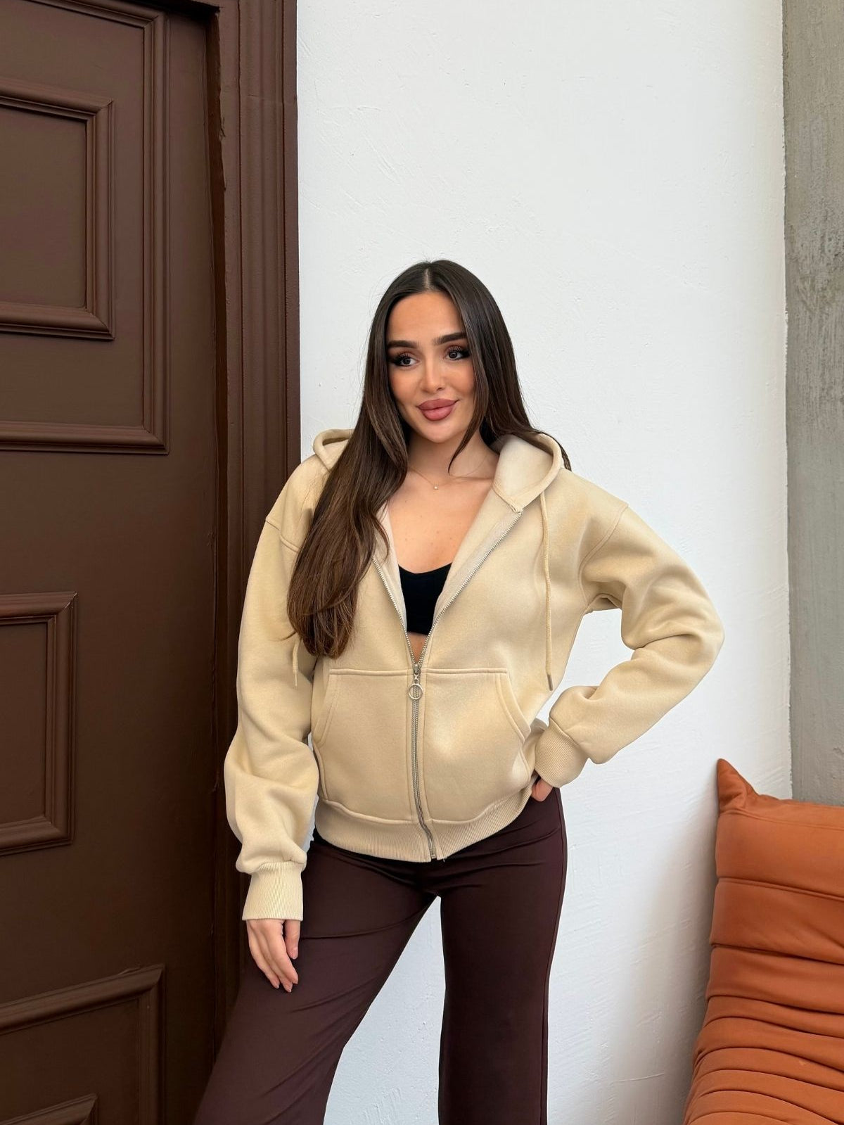 Kadın Kapüşonlu Bağcıklı Sweatshirt Fermuarlı 3 İplik Şardonlu Rahat Kesim