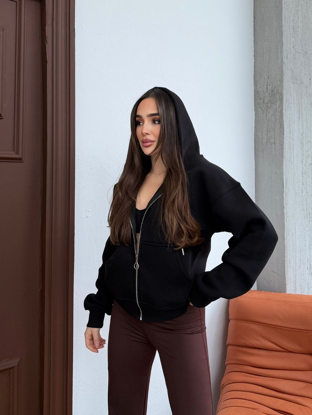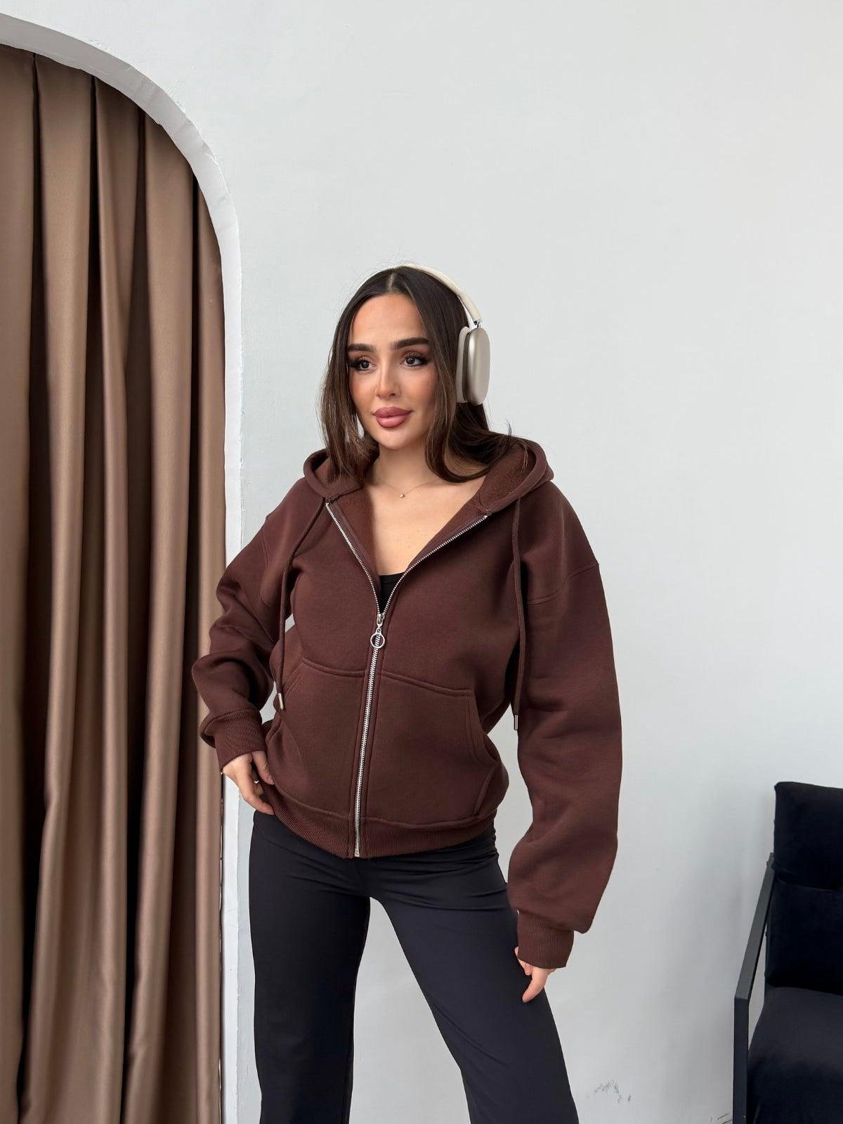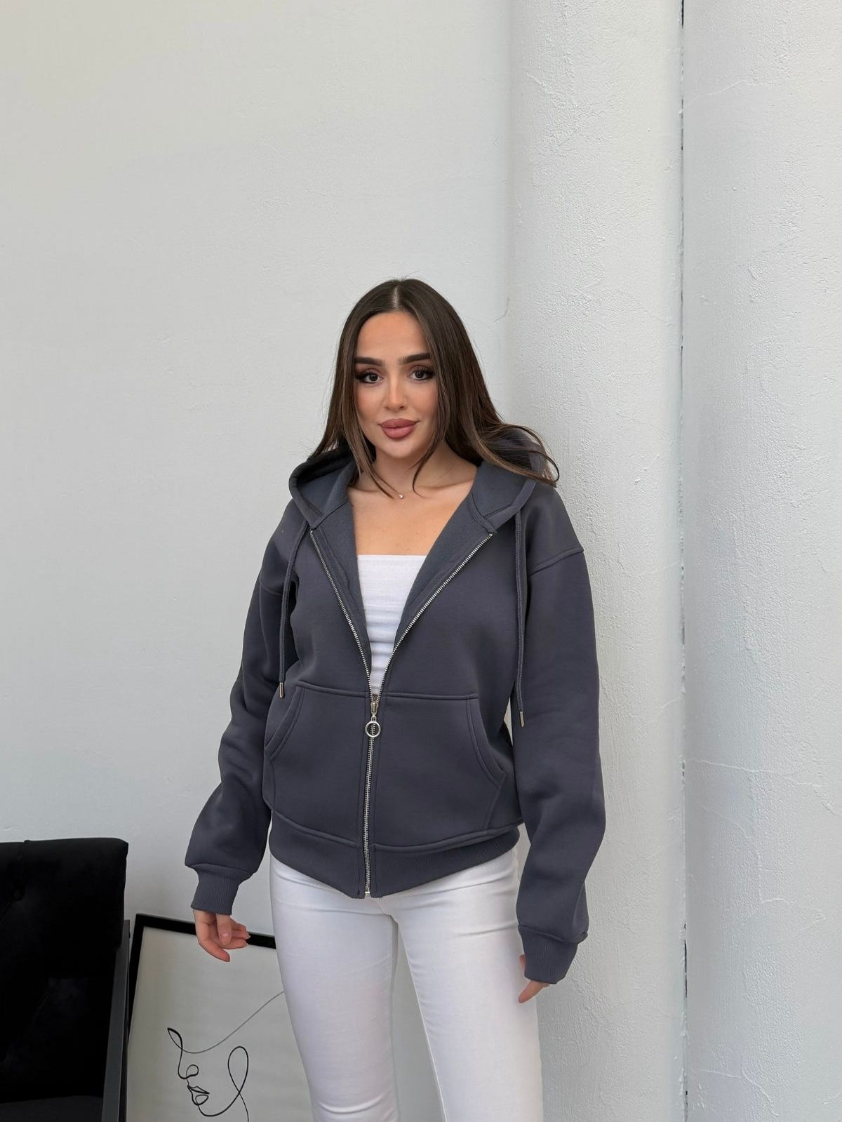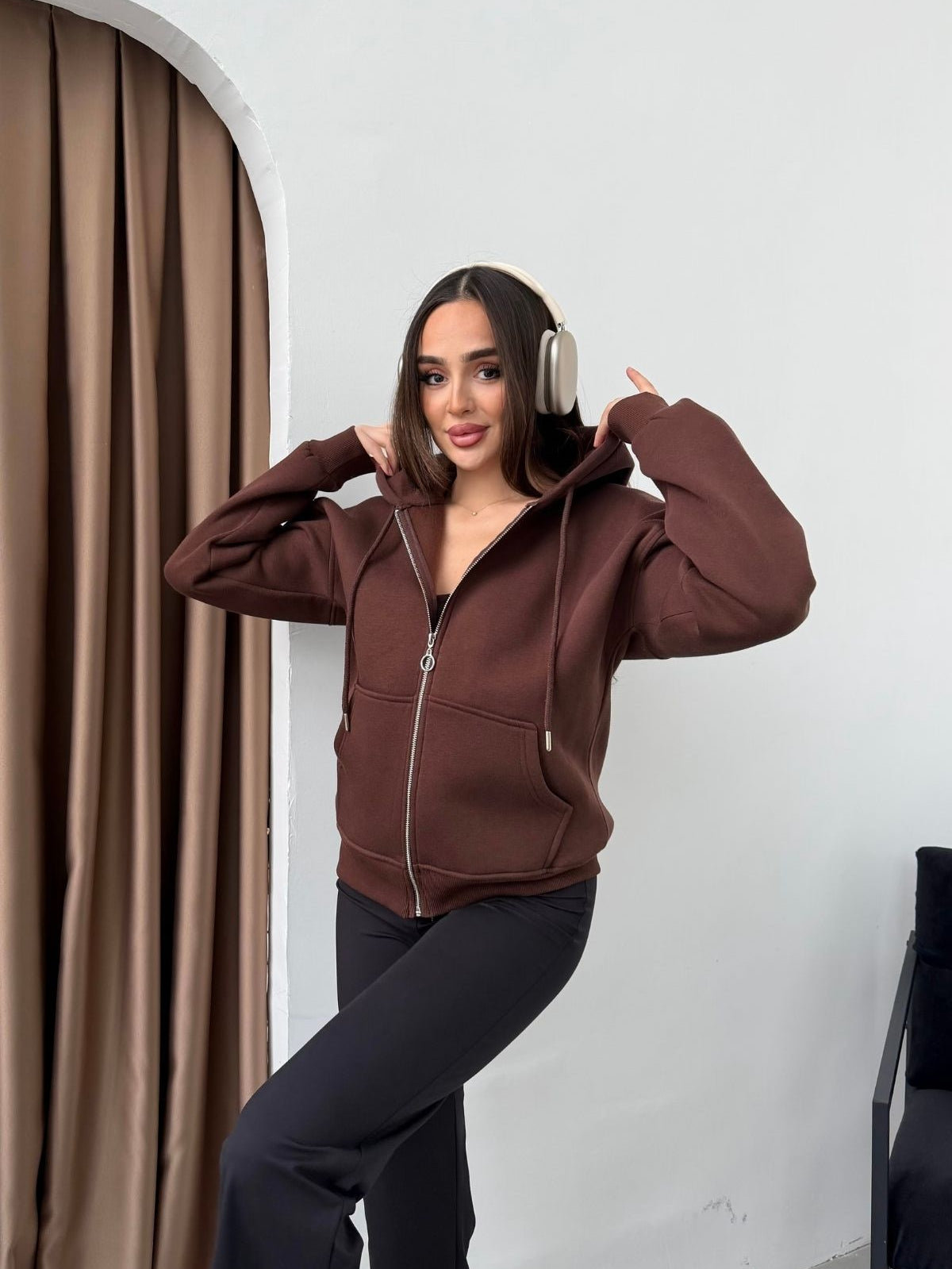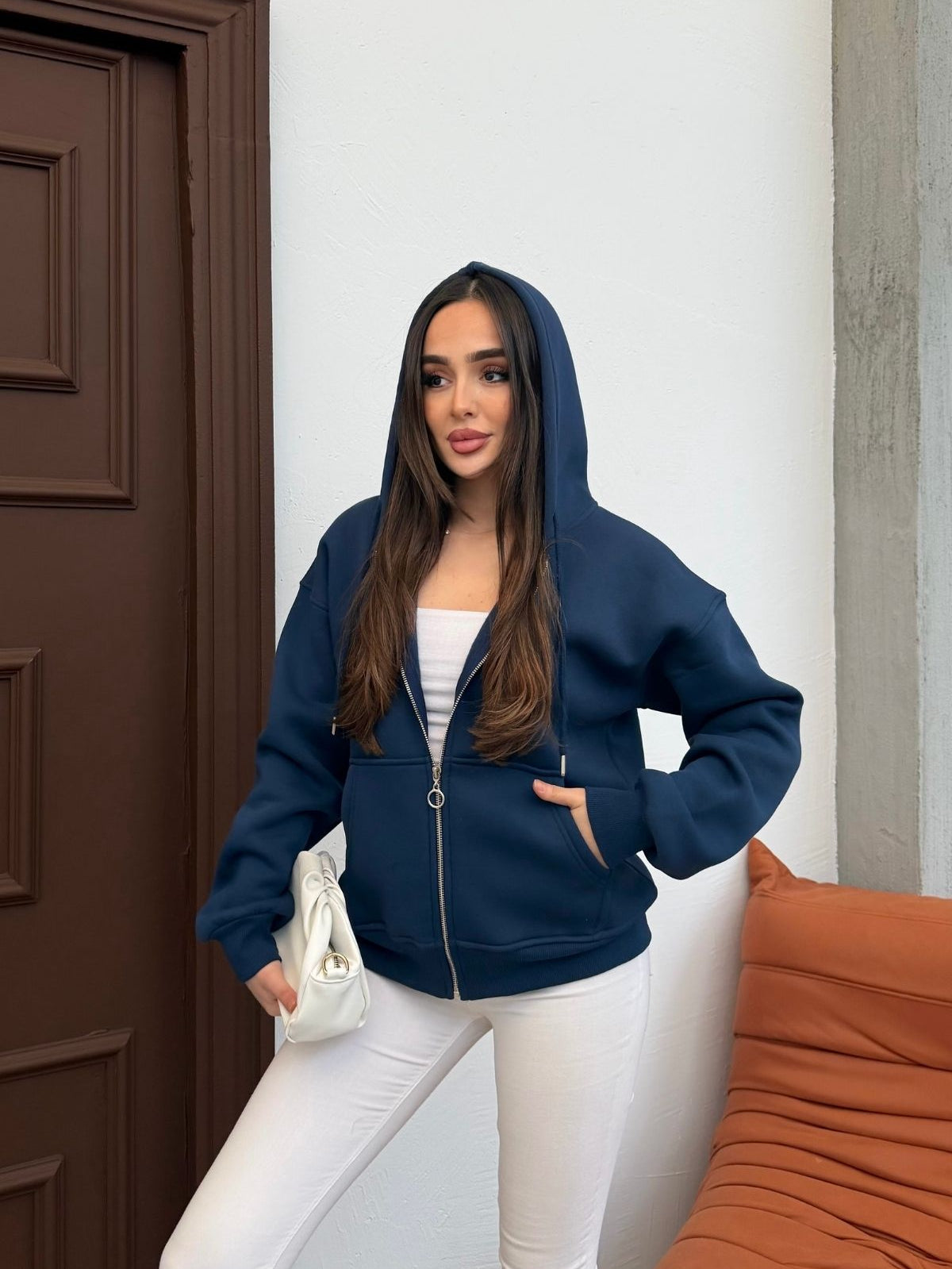 Kadın Kapüşonlu Bağcıklı Sweatshirt Fermuarlı 3 İplik Şardonlu Rahat Kesim