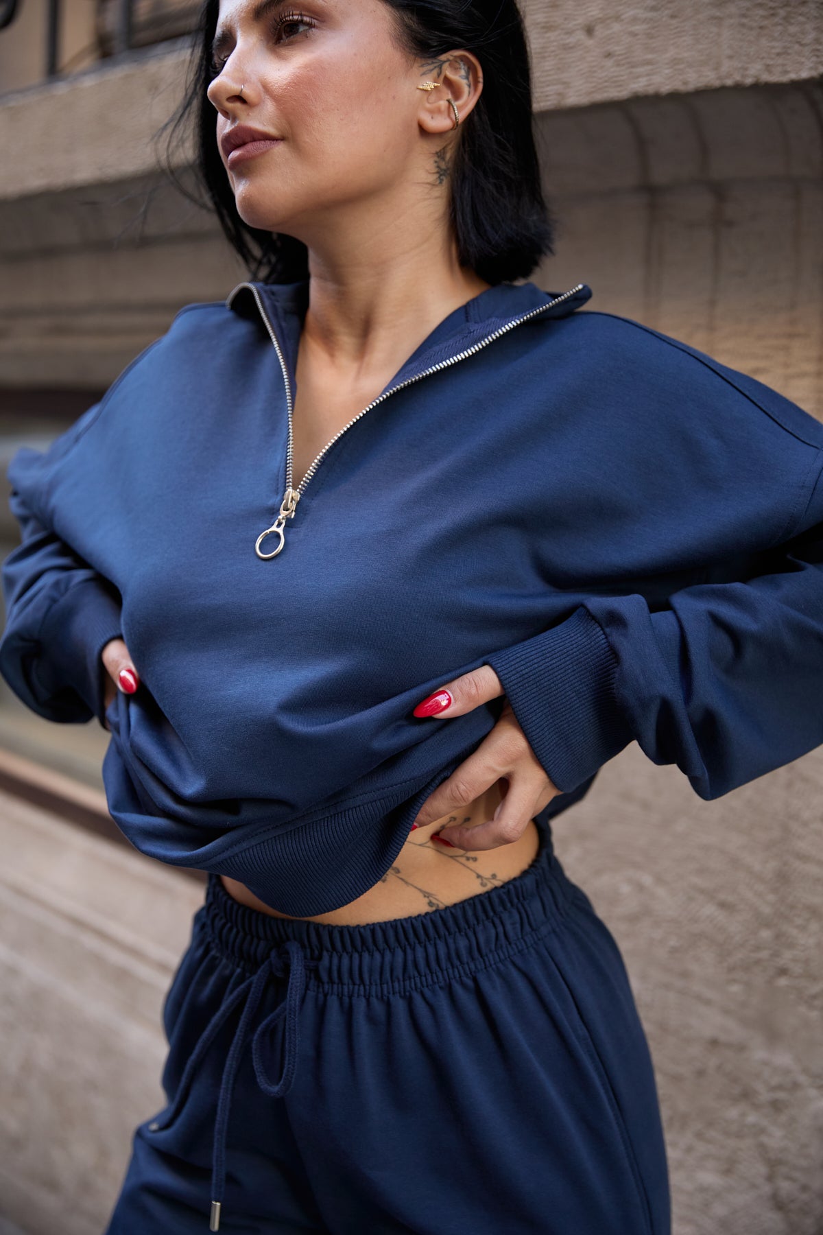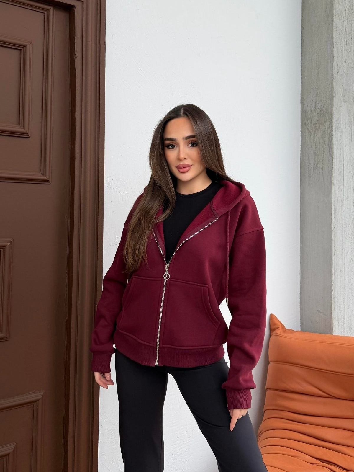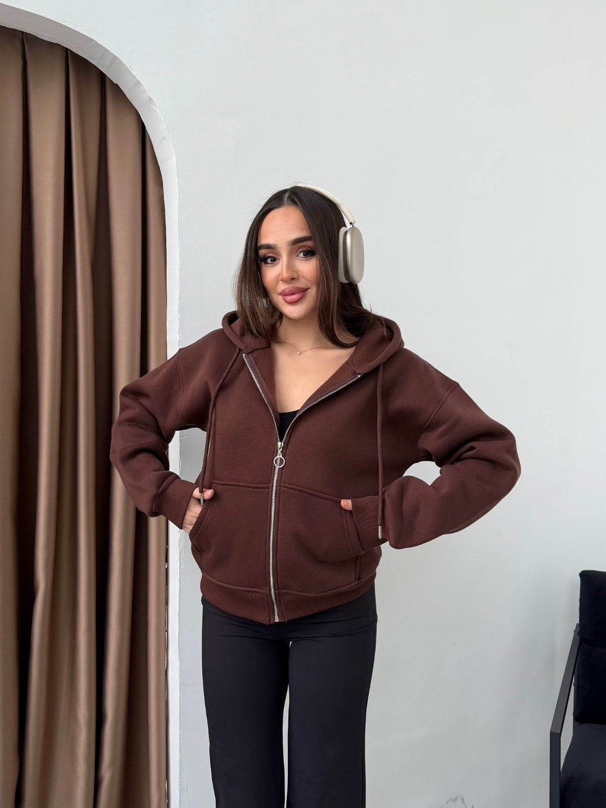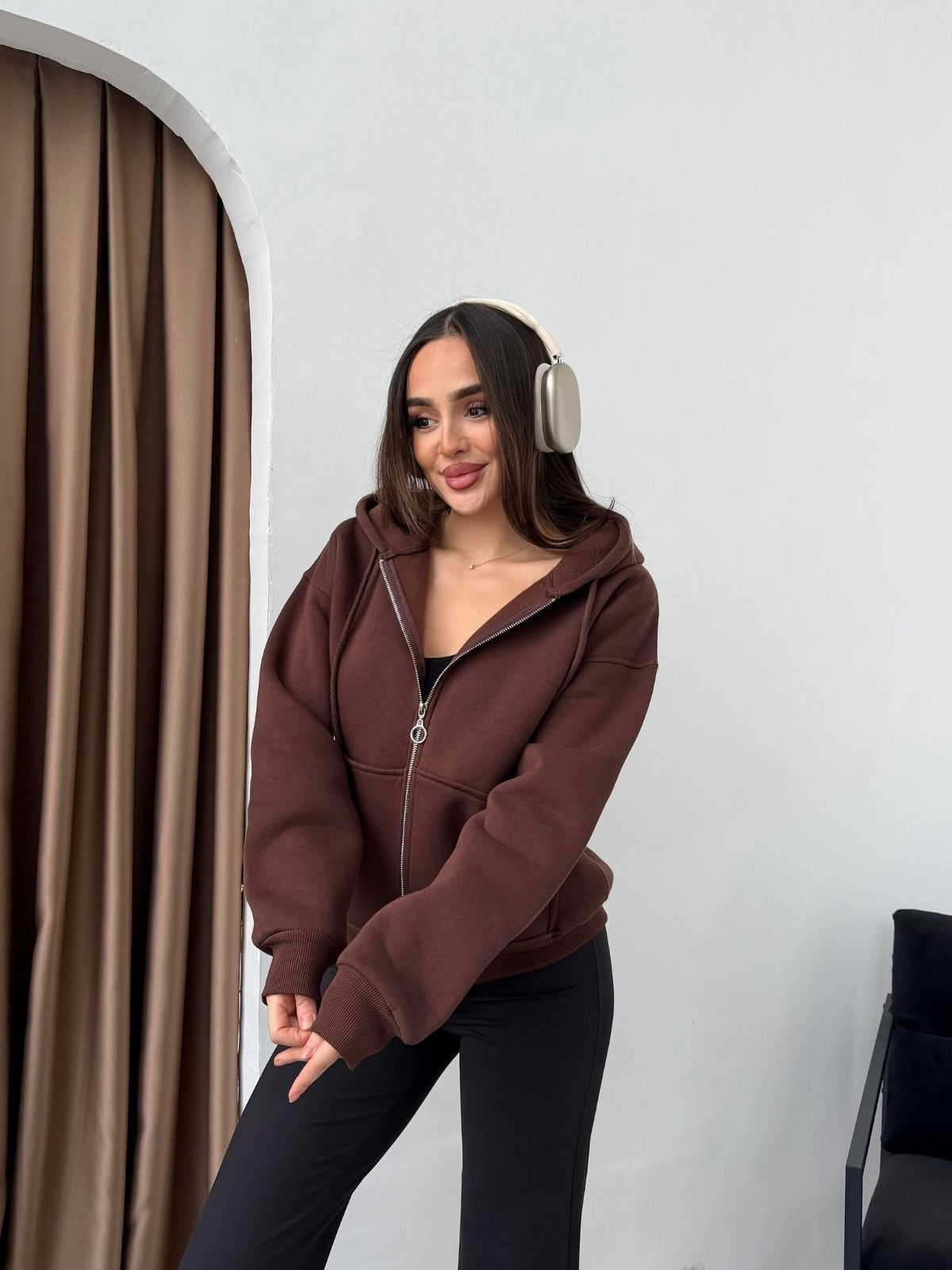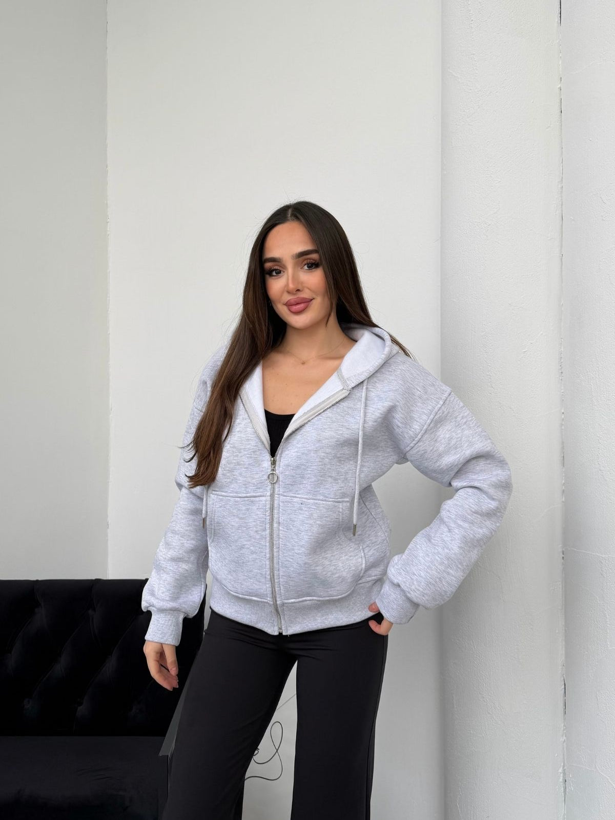 Kadın Kapüşonlu Bağcıklı Sweatshirt Fermuarlı 3 İplik Şardonlu Rahat Kesim