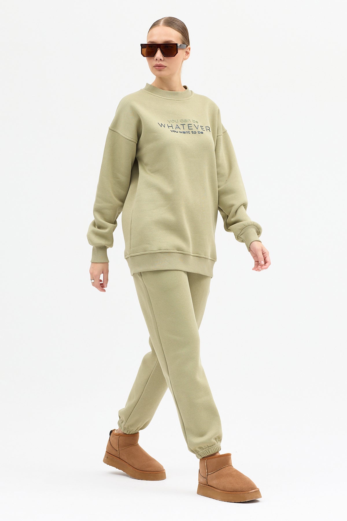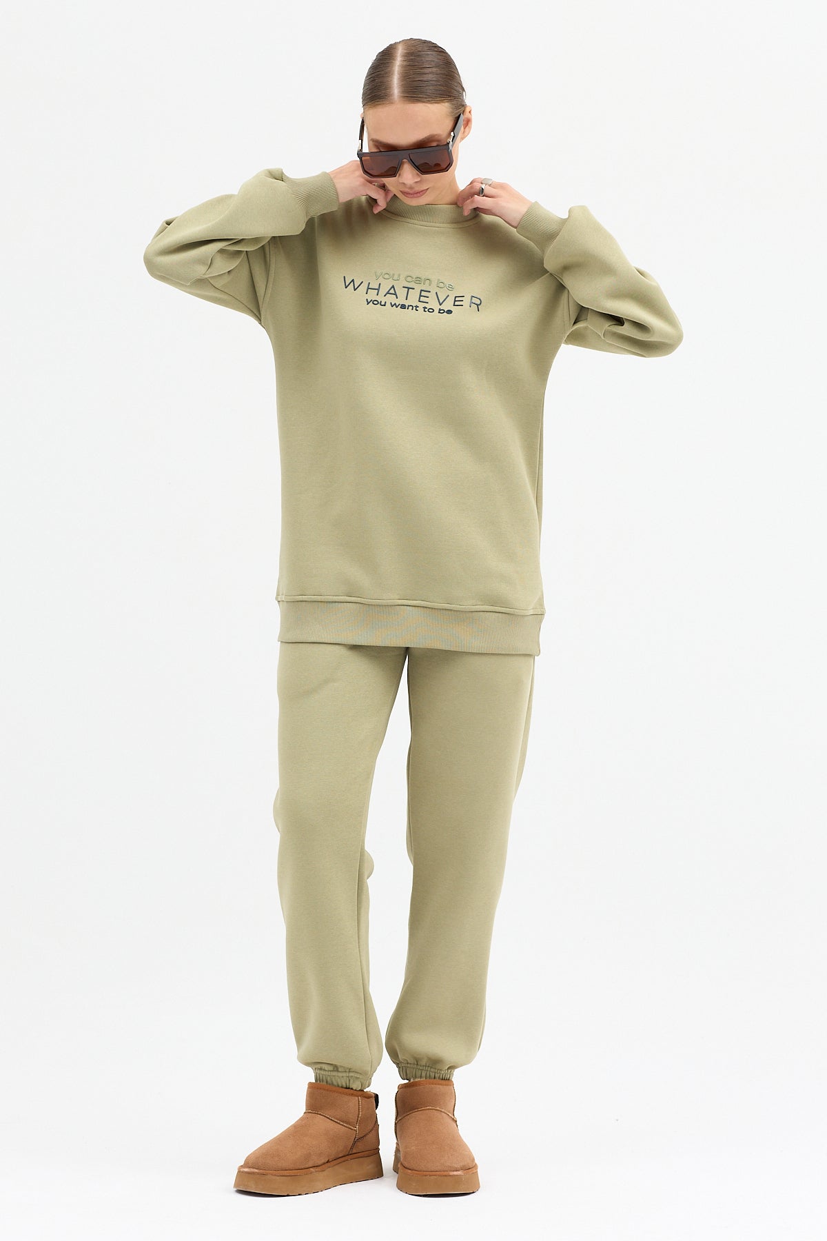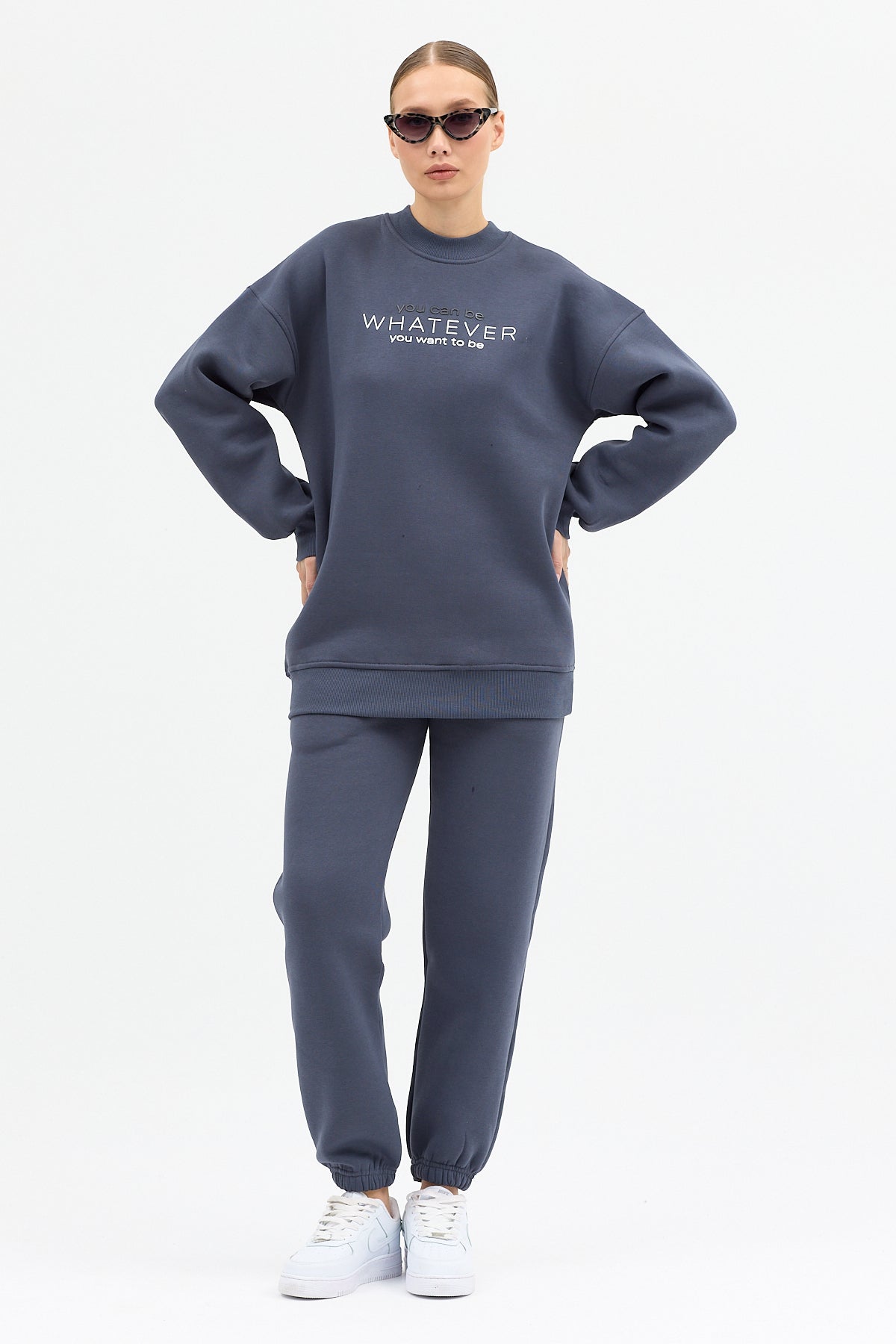 Kadın Whatever Baskılı Bisiklet Yaka Paçası Lastikli Oversize Eşofman Takımı