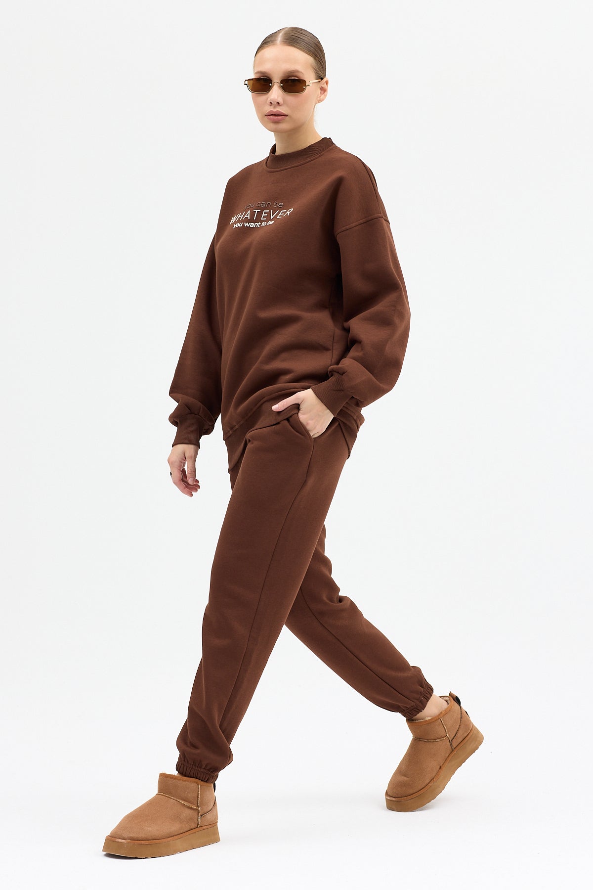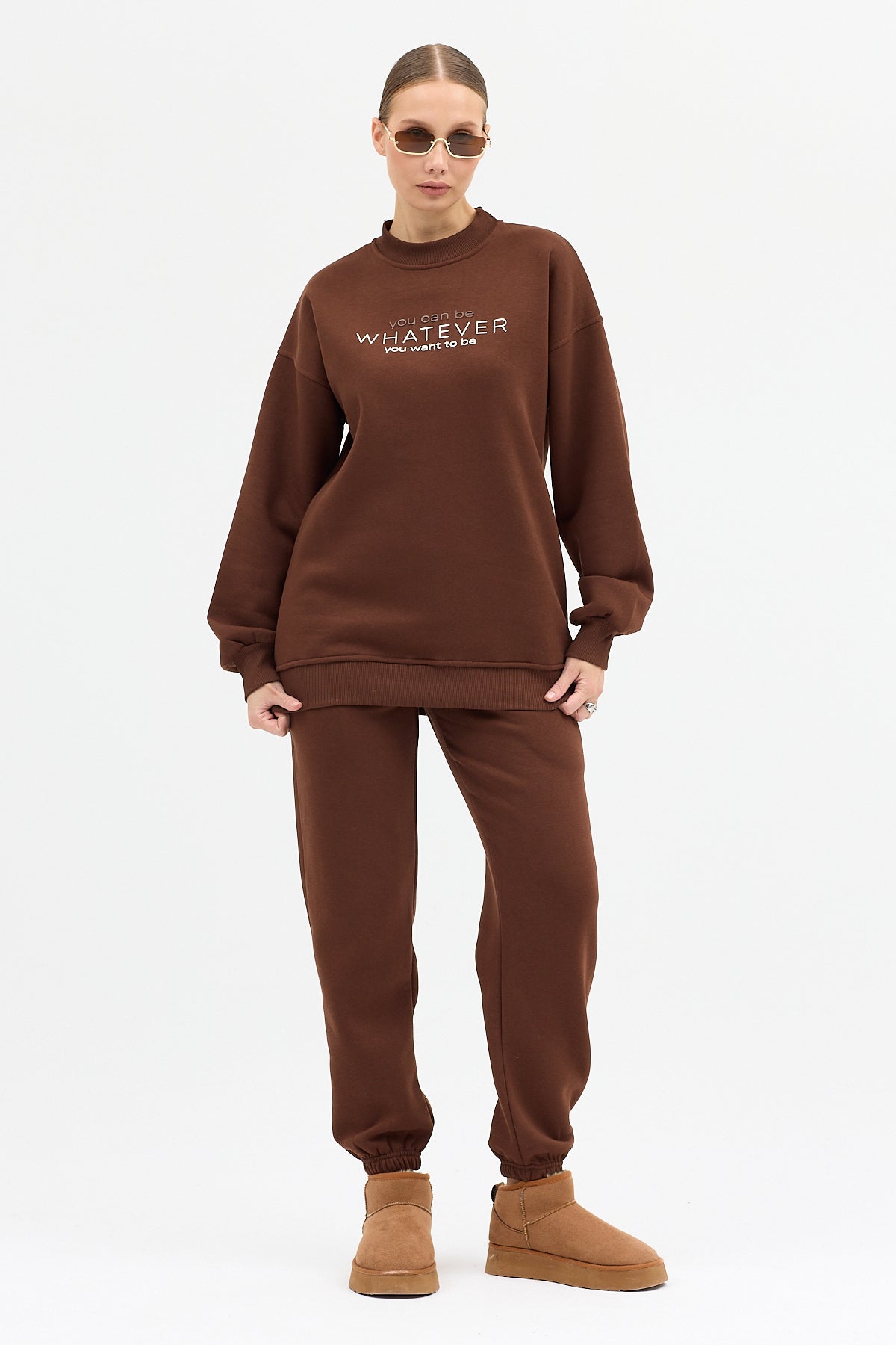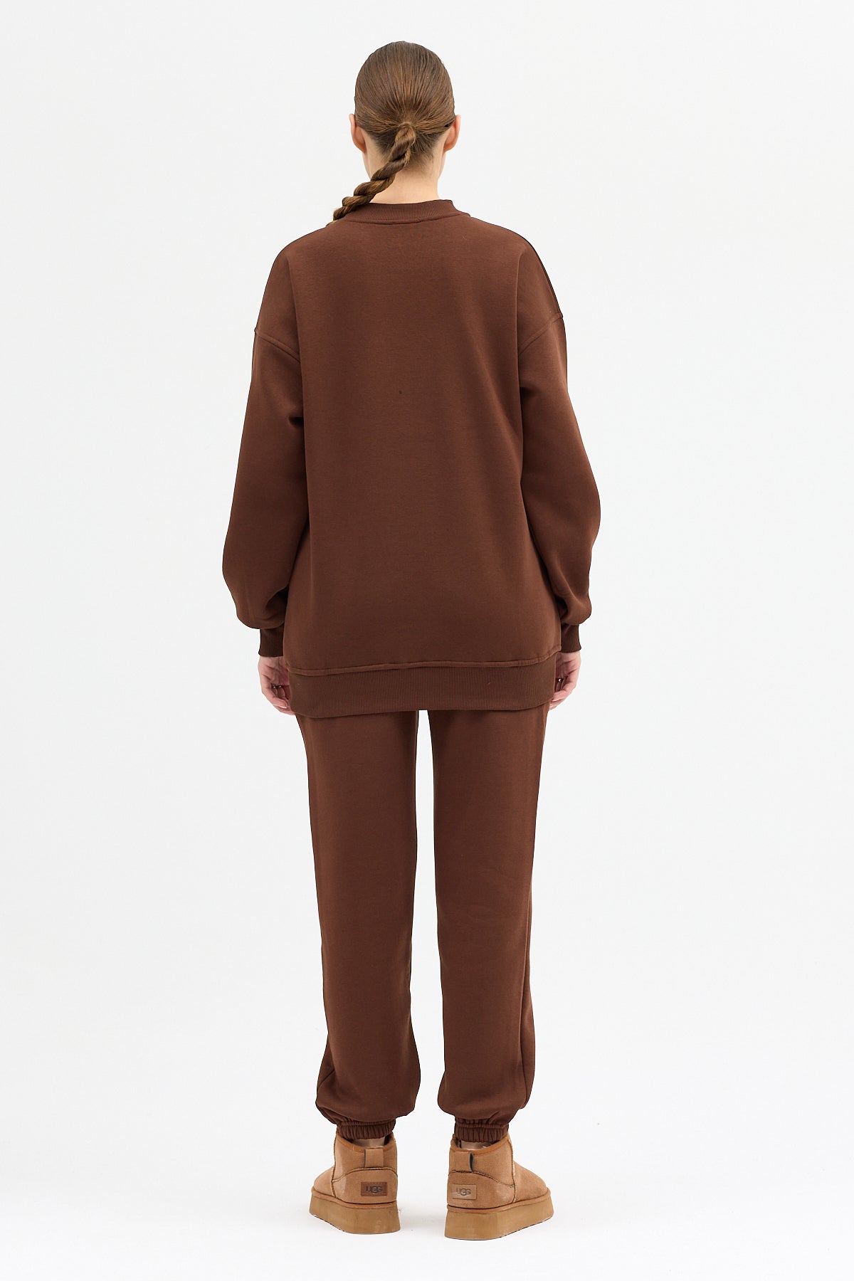 Kadın Oversize Kapüşonlu Kahverengi Eşofman Takımı Kışlık Içi Pamuklu
