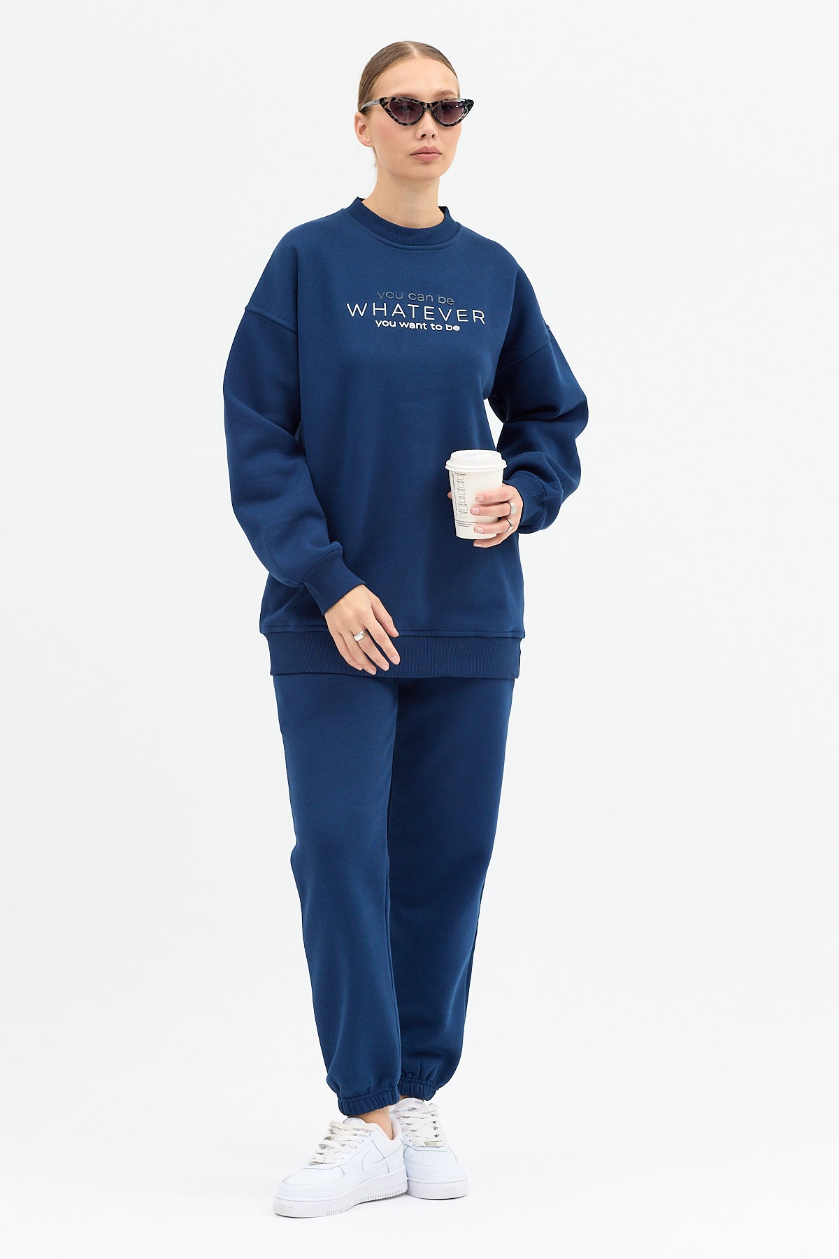 Kadın Oversize Kapüşonlu Lacivert Eşofman Takımı Kışlık Içi Pamuklu