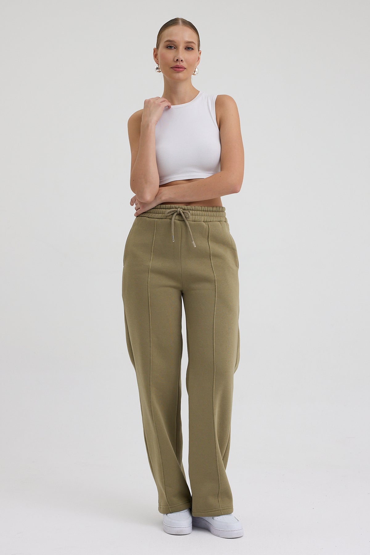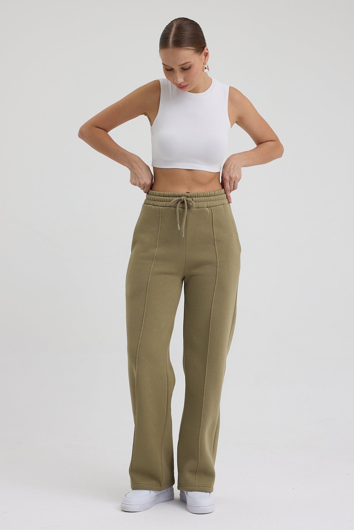 Kadın Yüksek Bel Nervürlü Kışlık Polarlı Paça Dikişli Bol Paça Eşofman Altı Haki