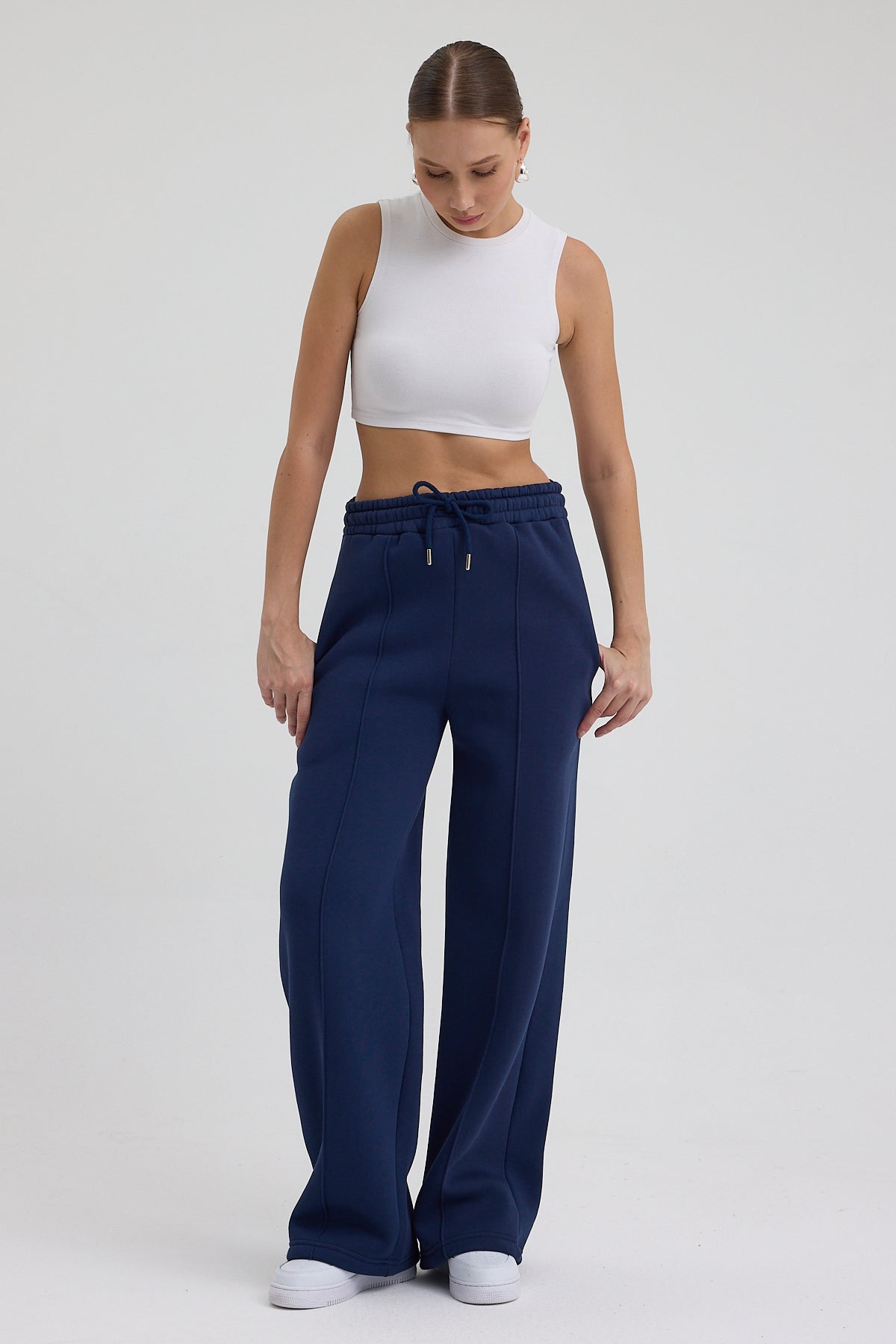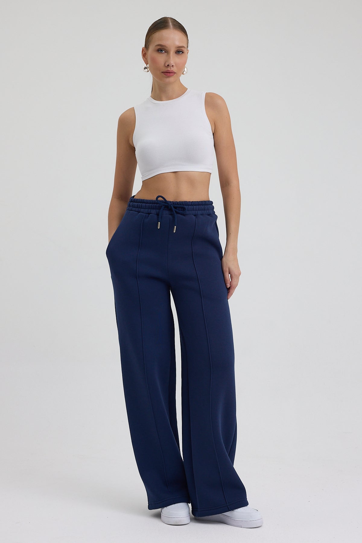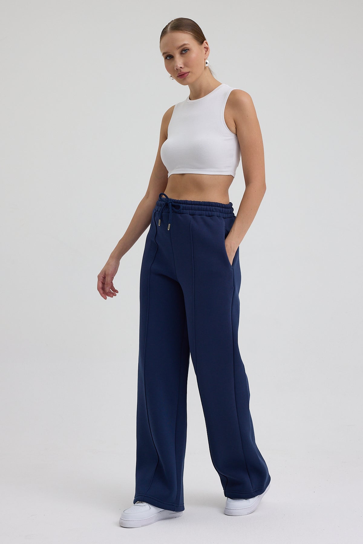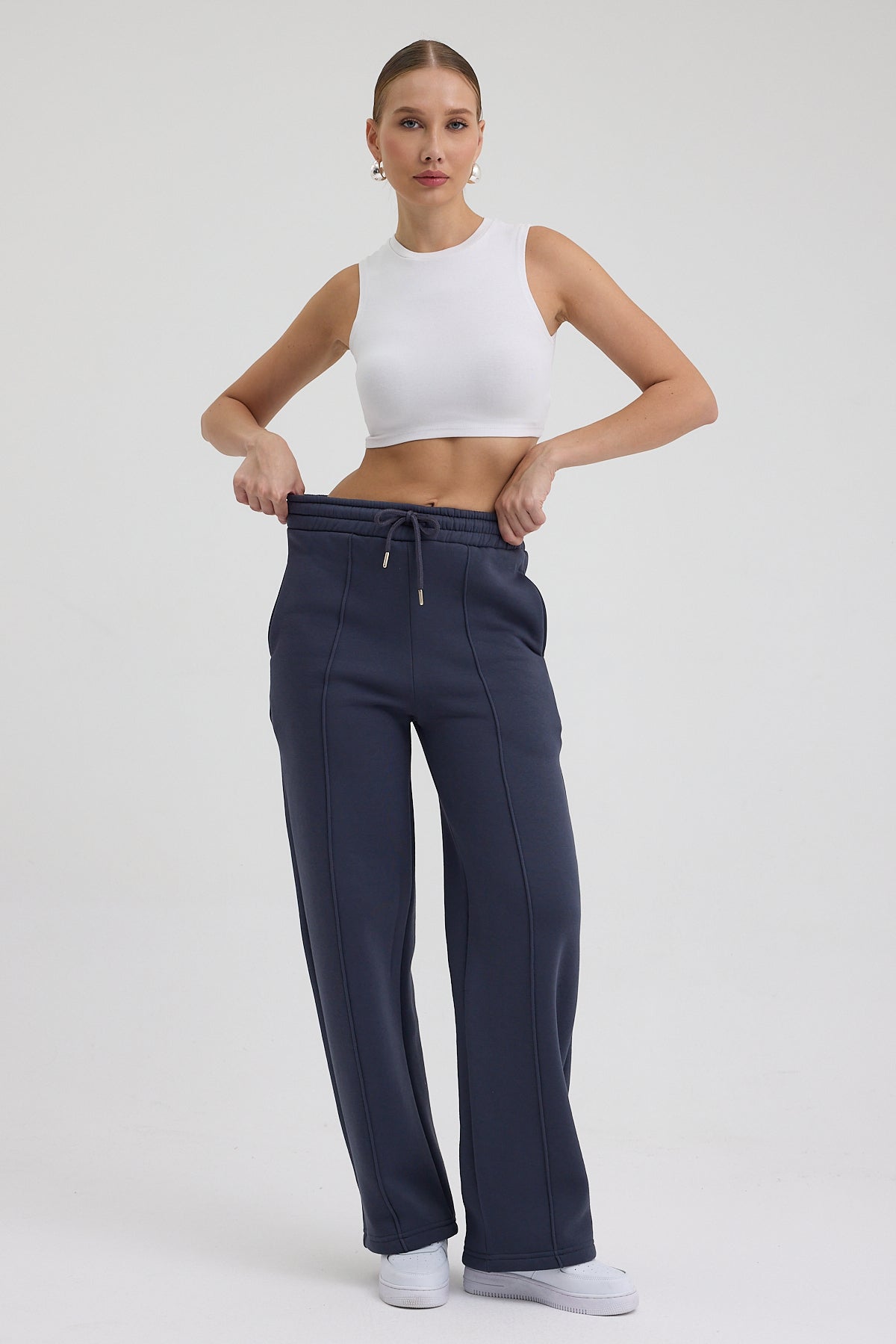 Kadın Yüksek Bel Nervürlü Kışlık Polarlı Paça Dikişli Bol Paça Eşofman Altı Lacivert