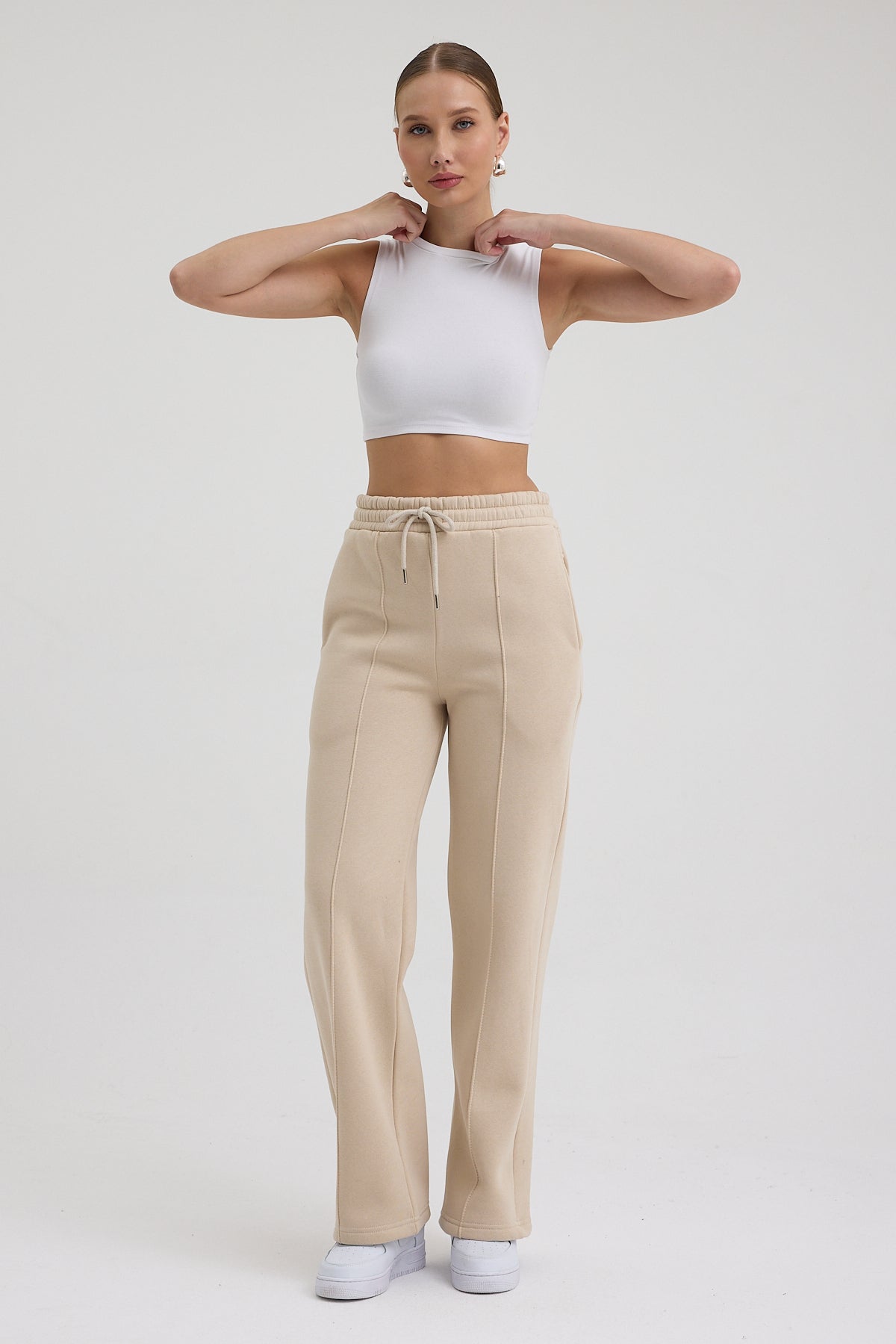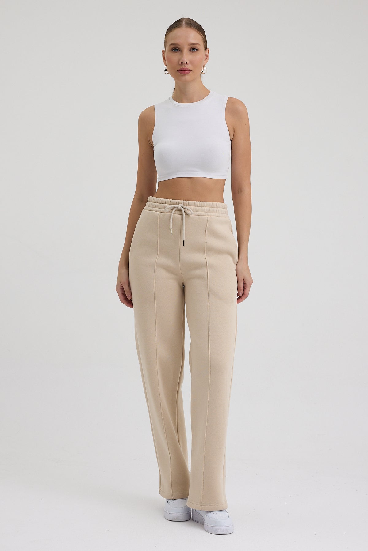 Kadın Yüksek Bel Nervürlü Kışlık Polarlı Paça Dikişli Bol Paça Eşofman Altı Bej