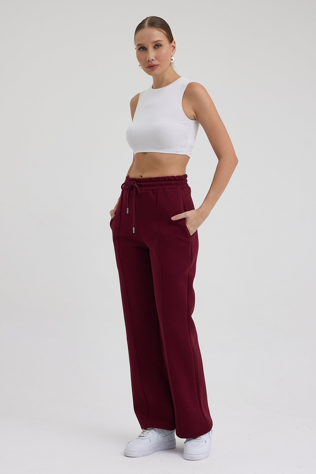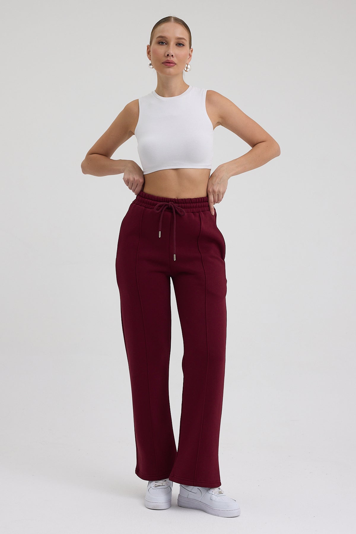 Kadın Yüksek Bel Nervürlü Kışlık Polarlı Paça Dikişli Bol Paça Eşofman Altı Bordo