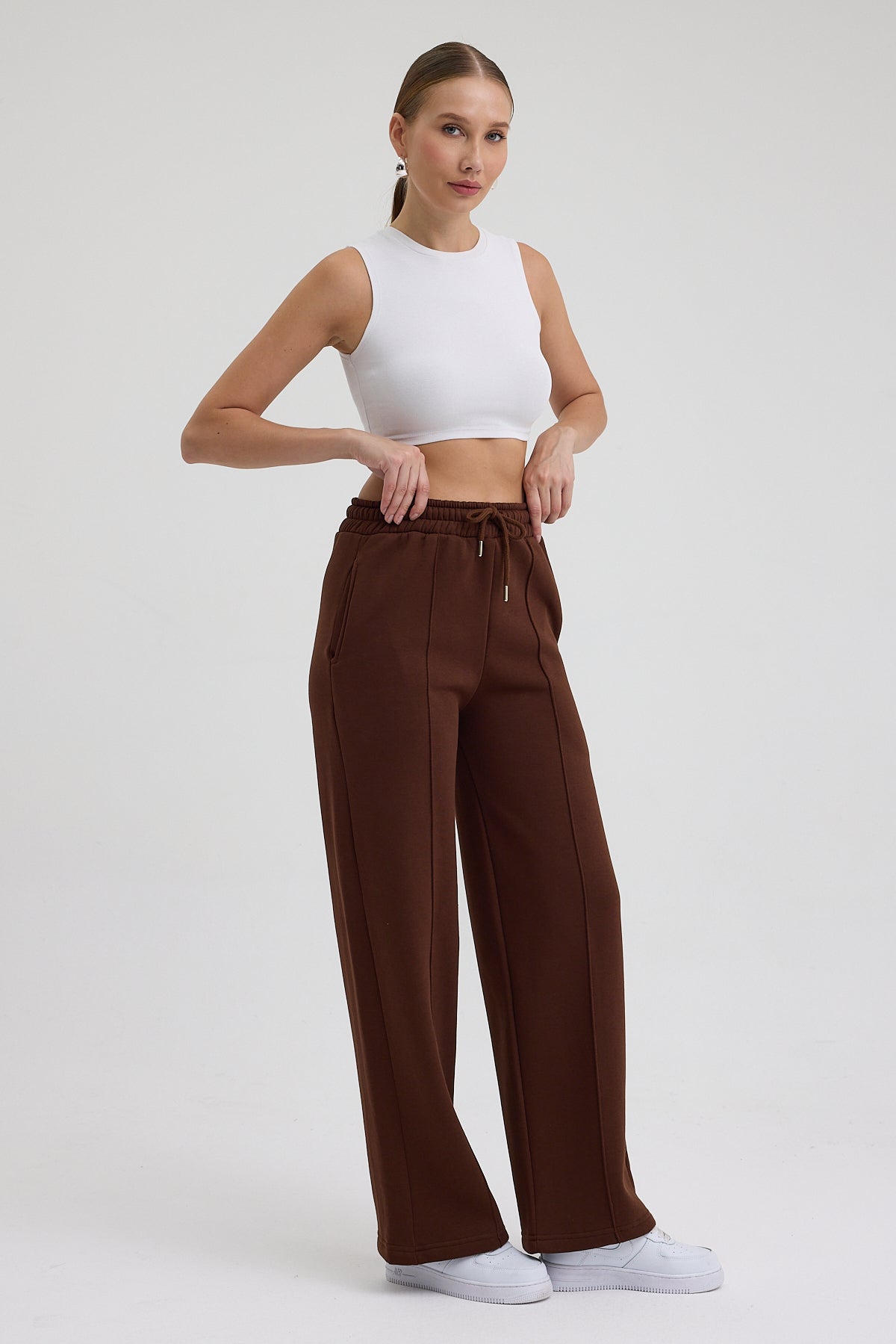 Kadın Yüksek Bel Nervürlü Kışlık Polarlı Paça Dikişli Bol Paça Eşofman Altı Kahve
