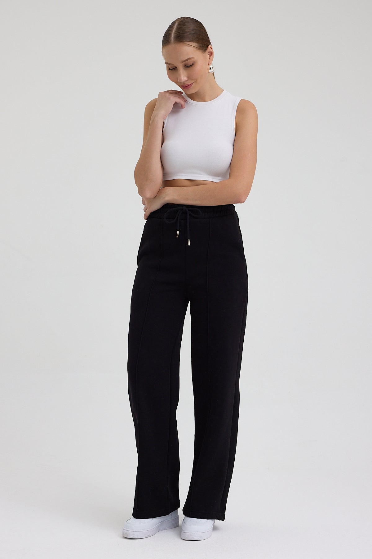 Kadın Yüksek Bel Nervürlü Kışlık Polarlı Paça Dikişli Bol Paça Eşofman Altı Siyah