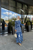 Kadın Etnik Desenli Mavi Uzun Kol, Kemerli Cepli, Uzun Viskon Gömlek Elbise
