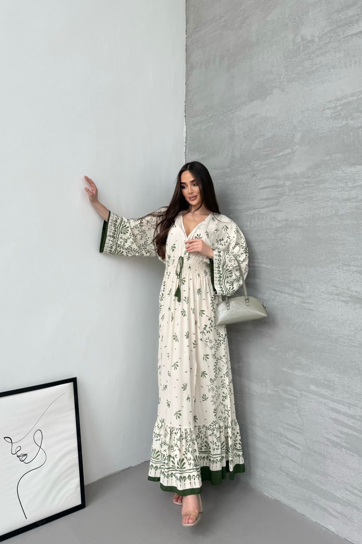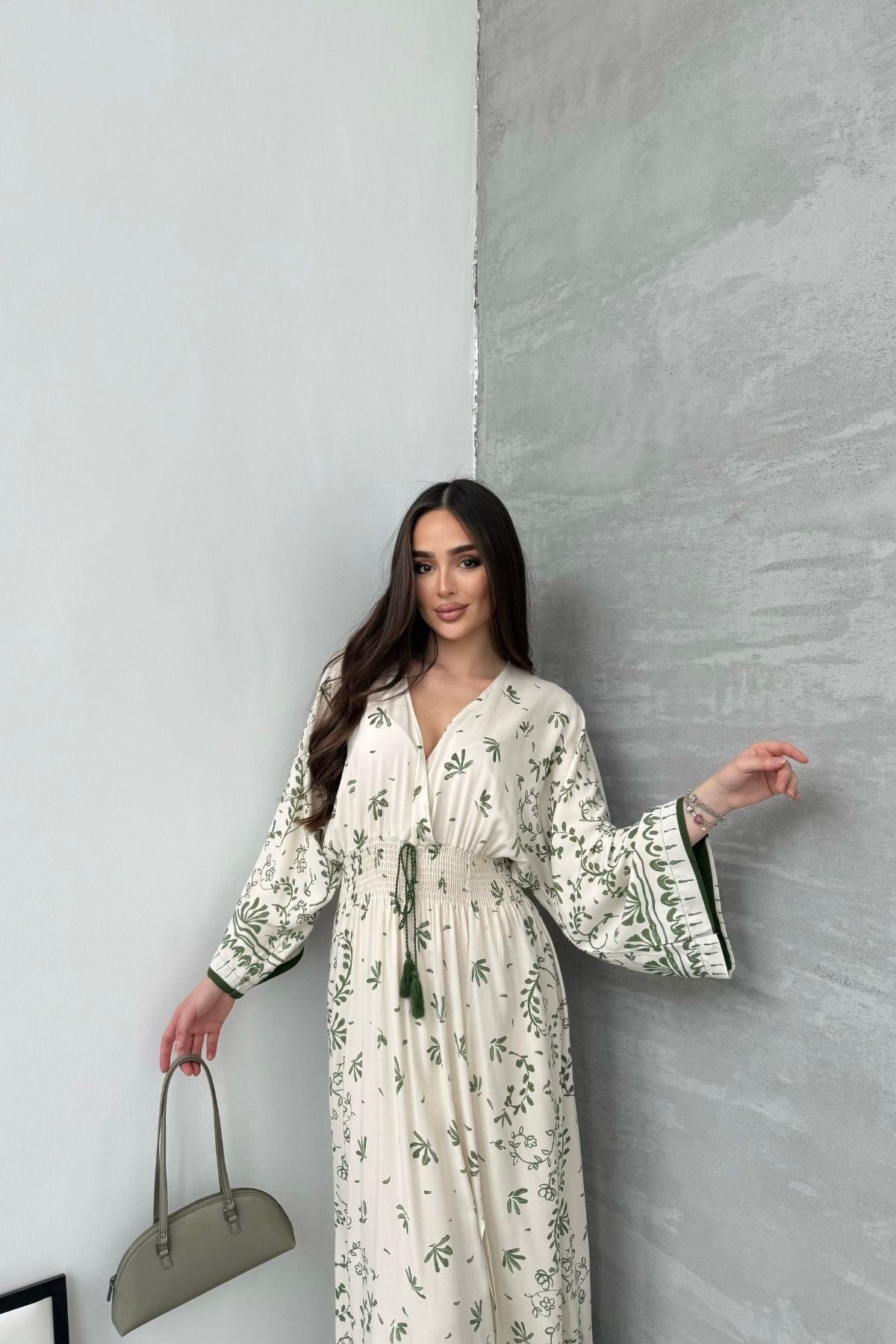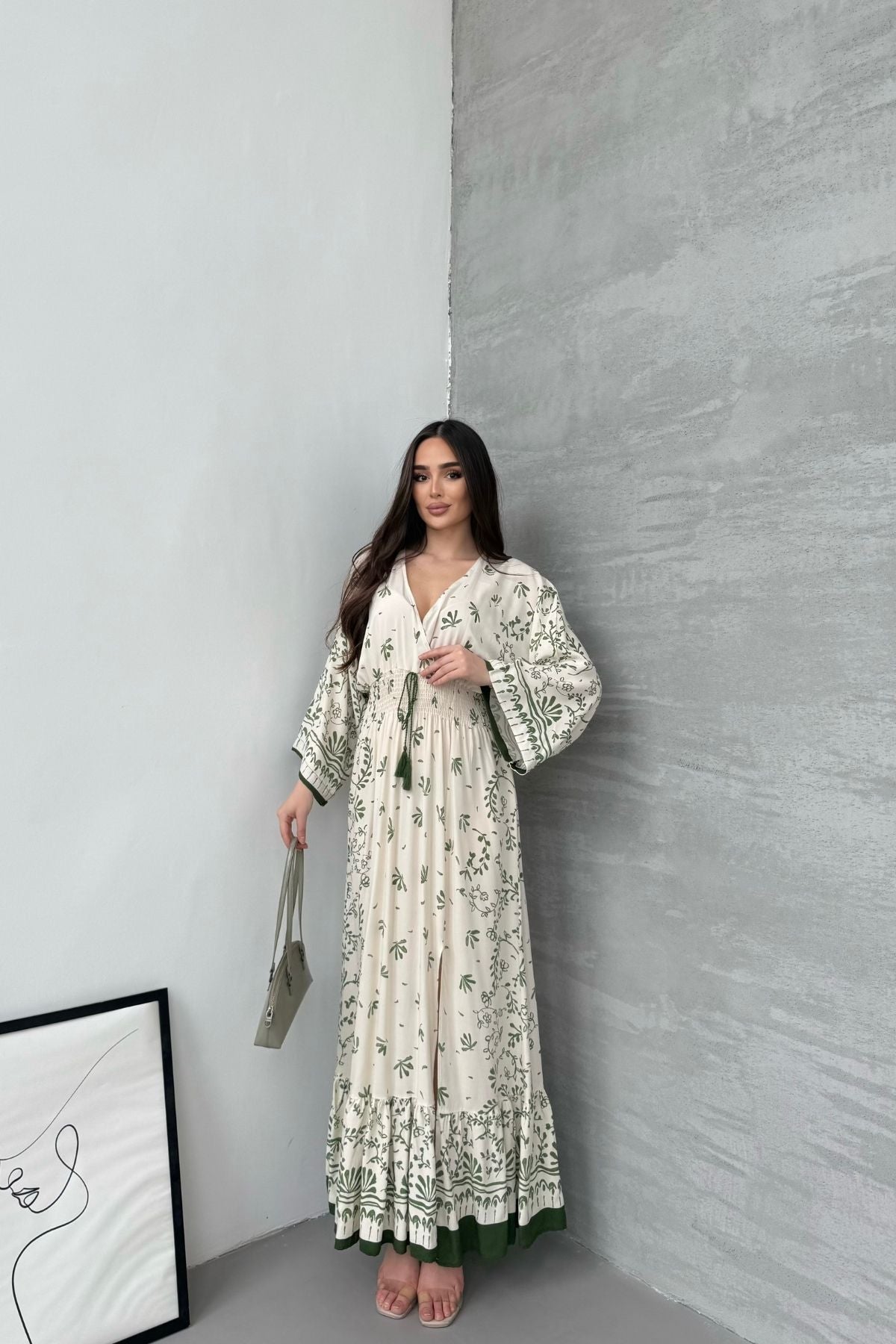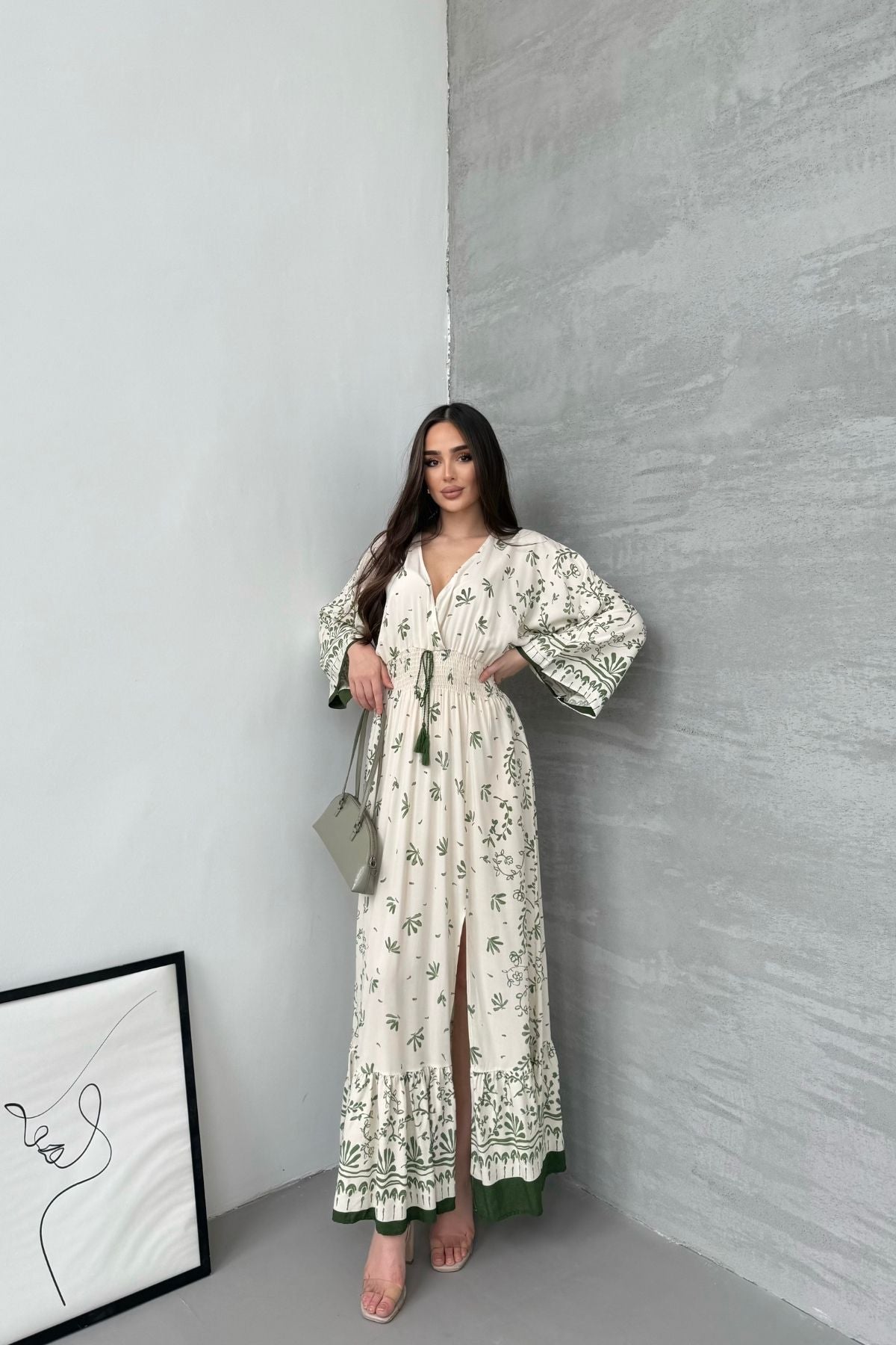 Kadın Yeşil Desenli Beli Gipeli Uzun Yırtmaçlı Elbise