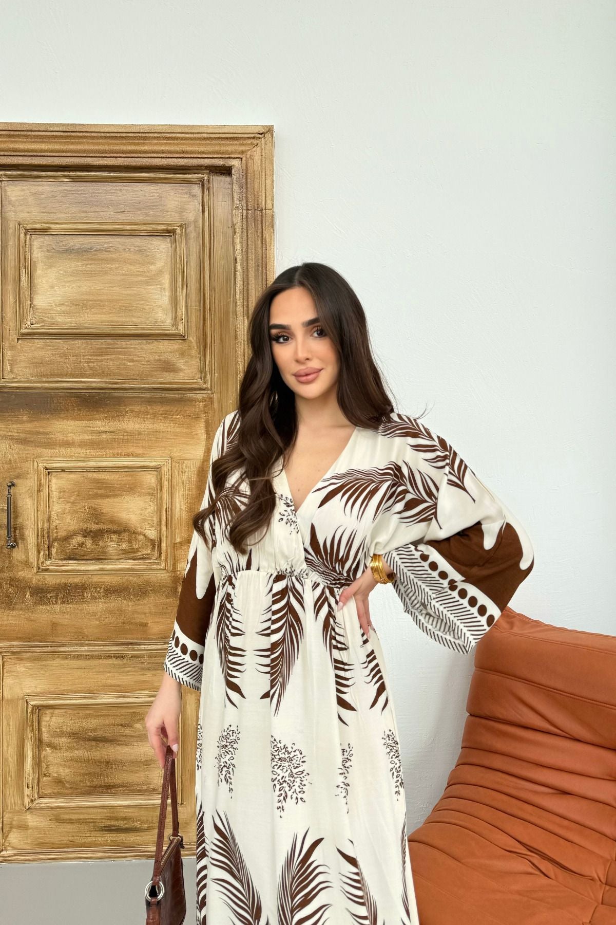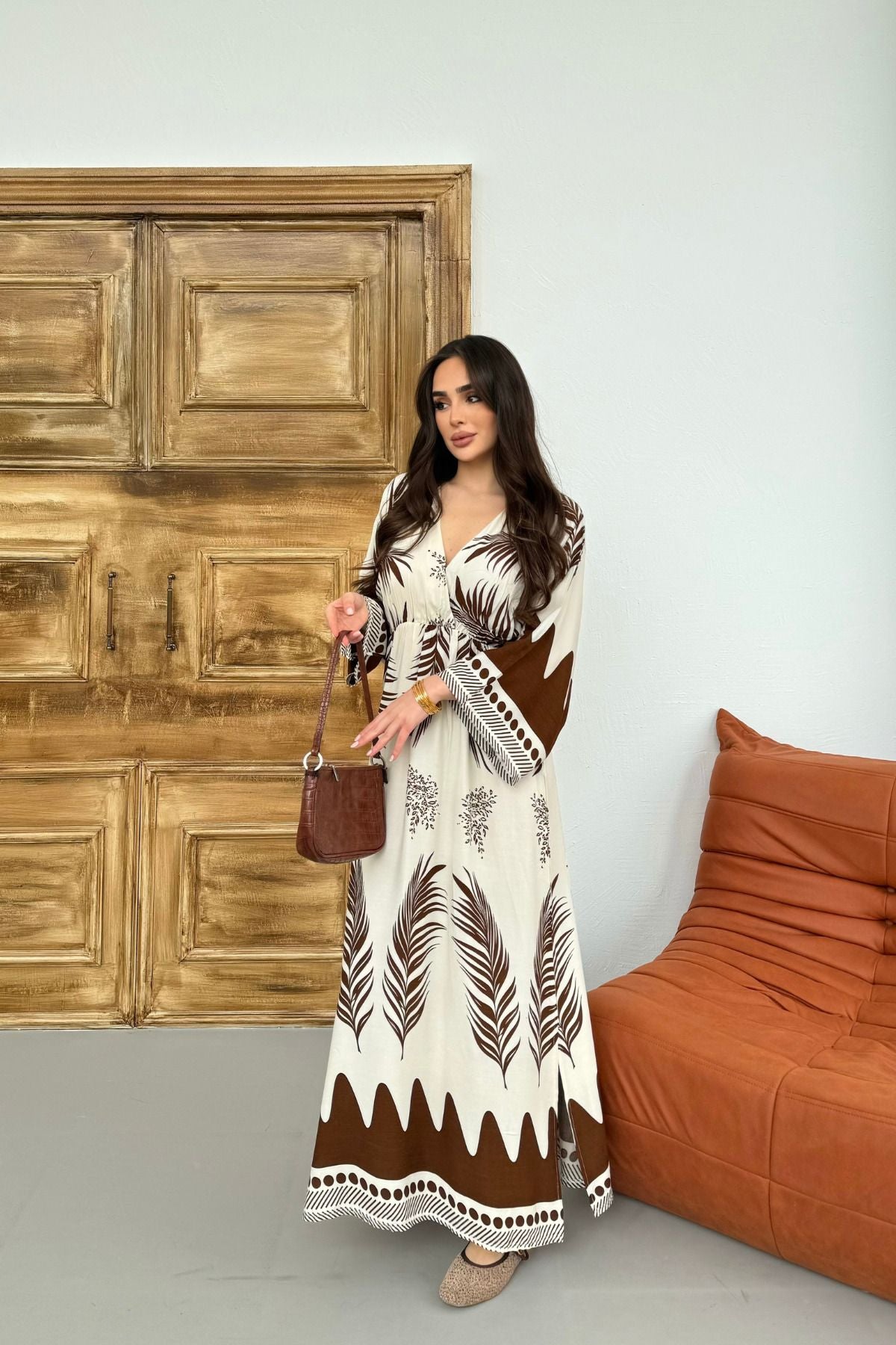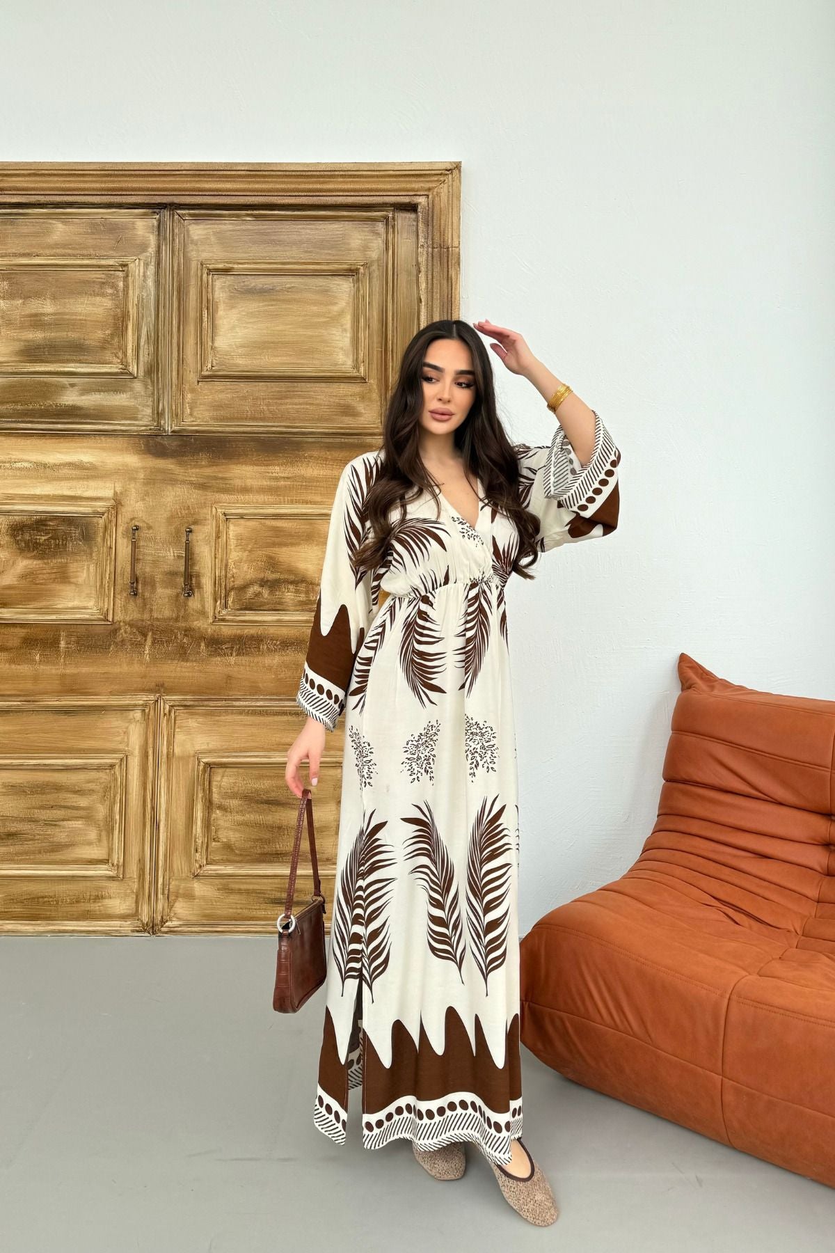 Kahverengi Desenli Yırtmaç Detaylı Beli Lastikli Uzun Elbise