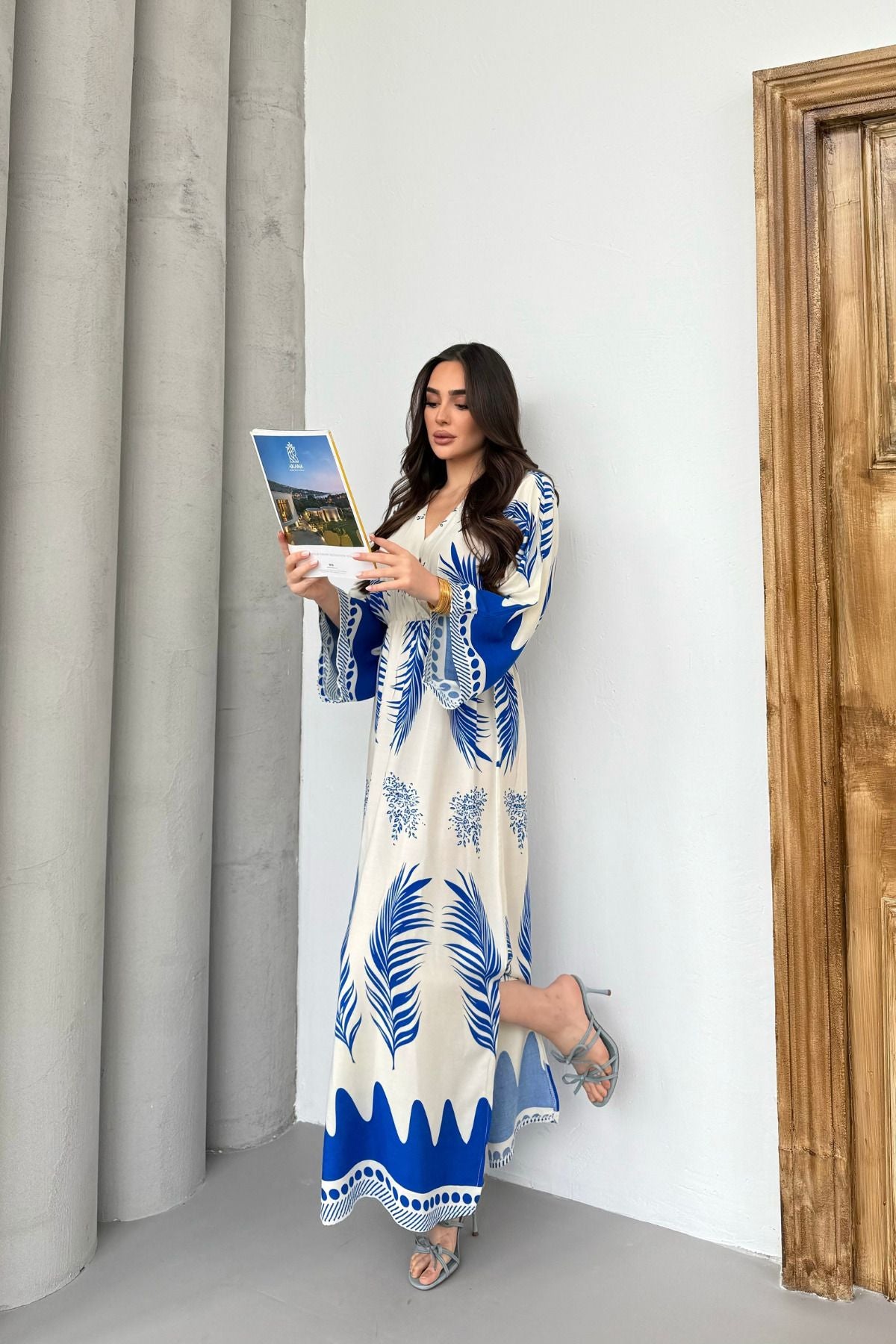 Mavi Desenli Yırtmaç Detaylı Beli Lastikli Uzun Elbise