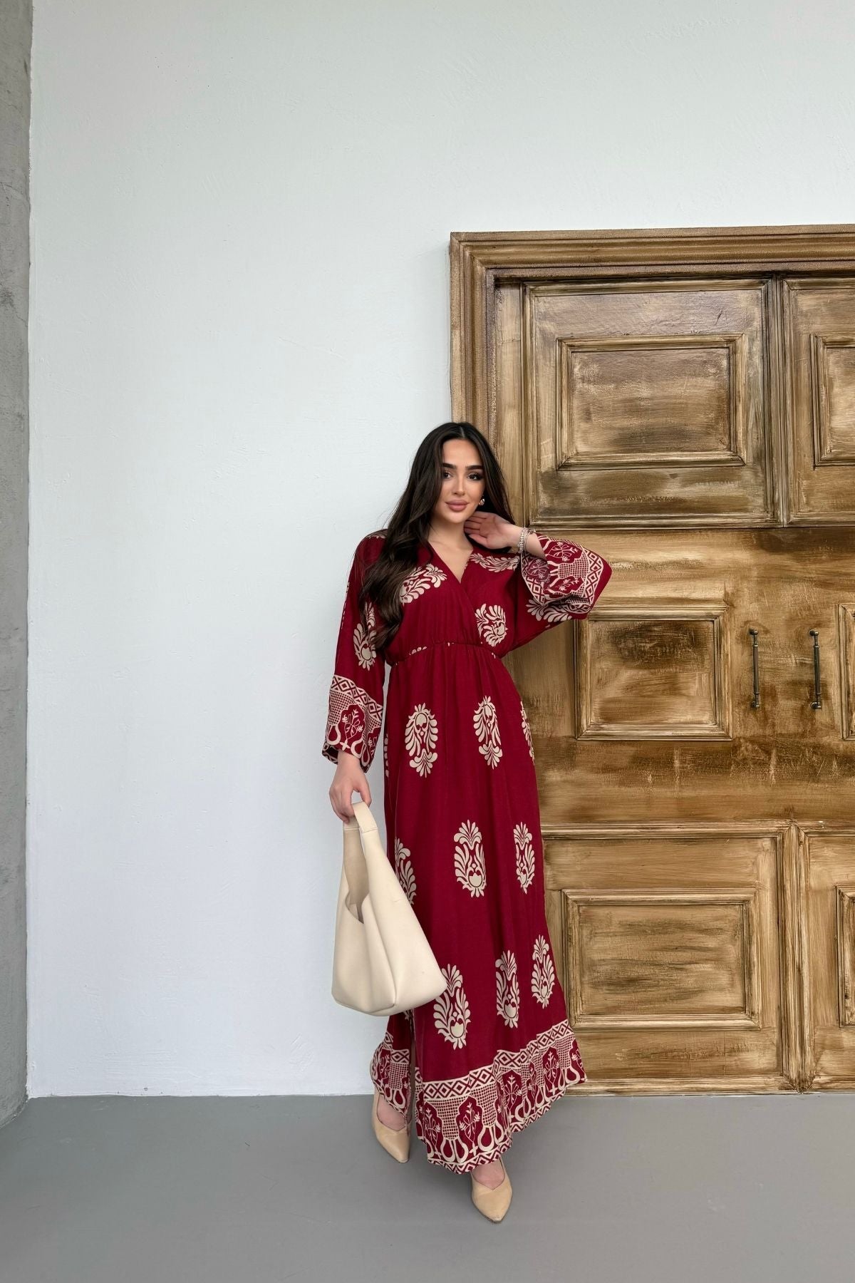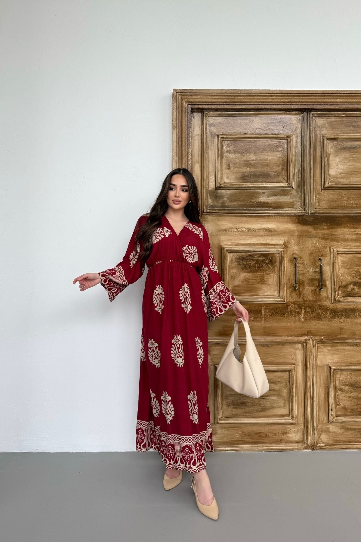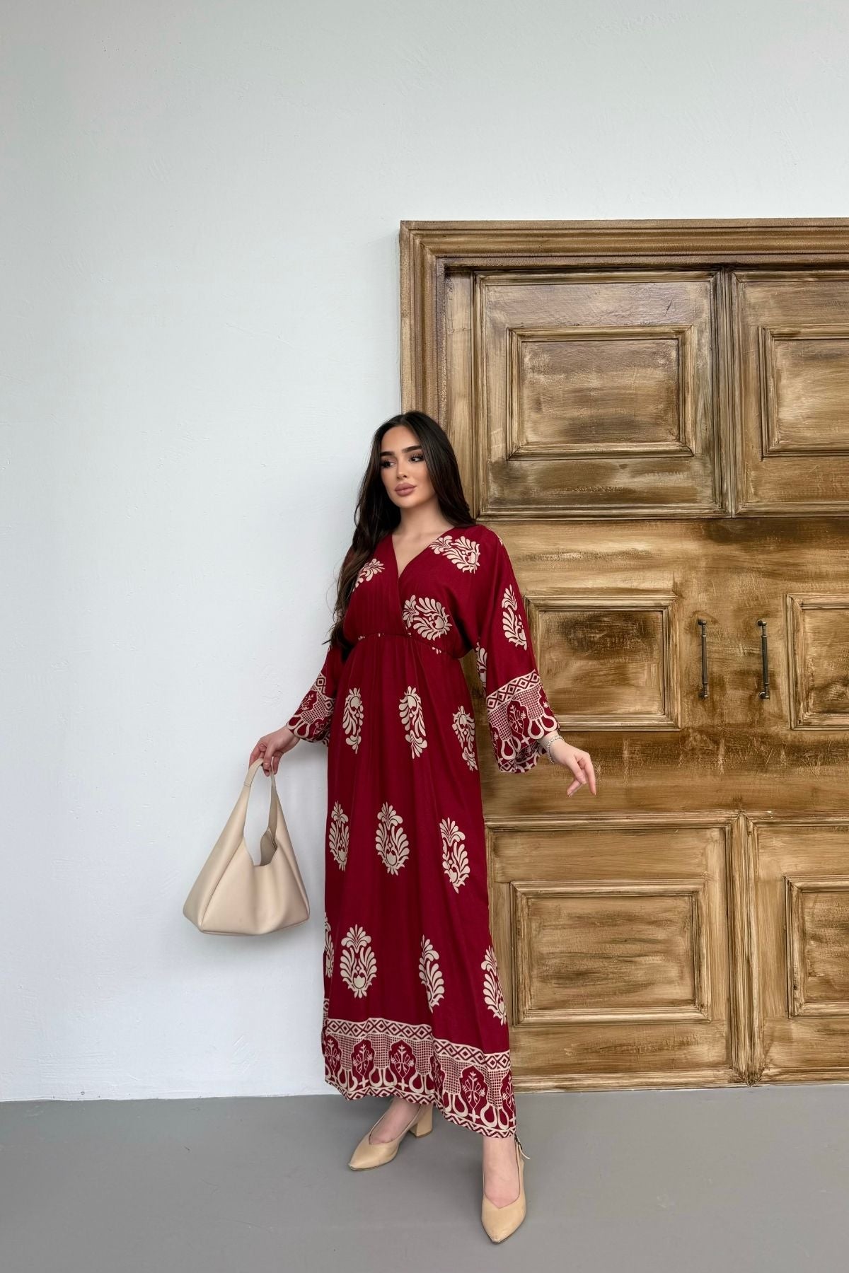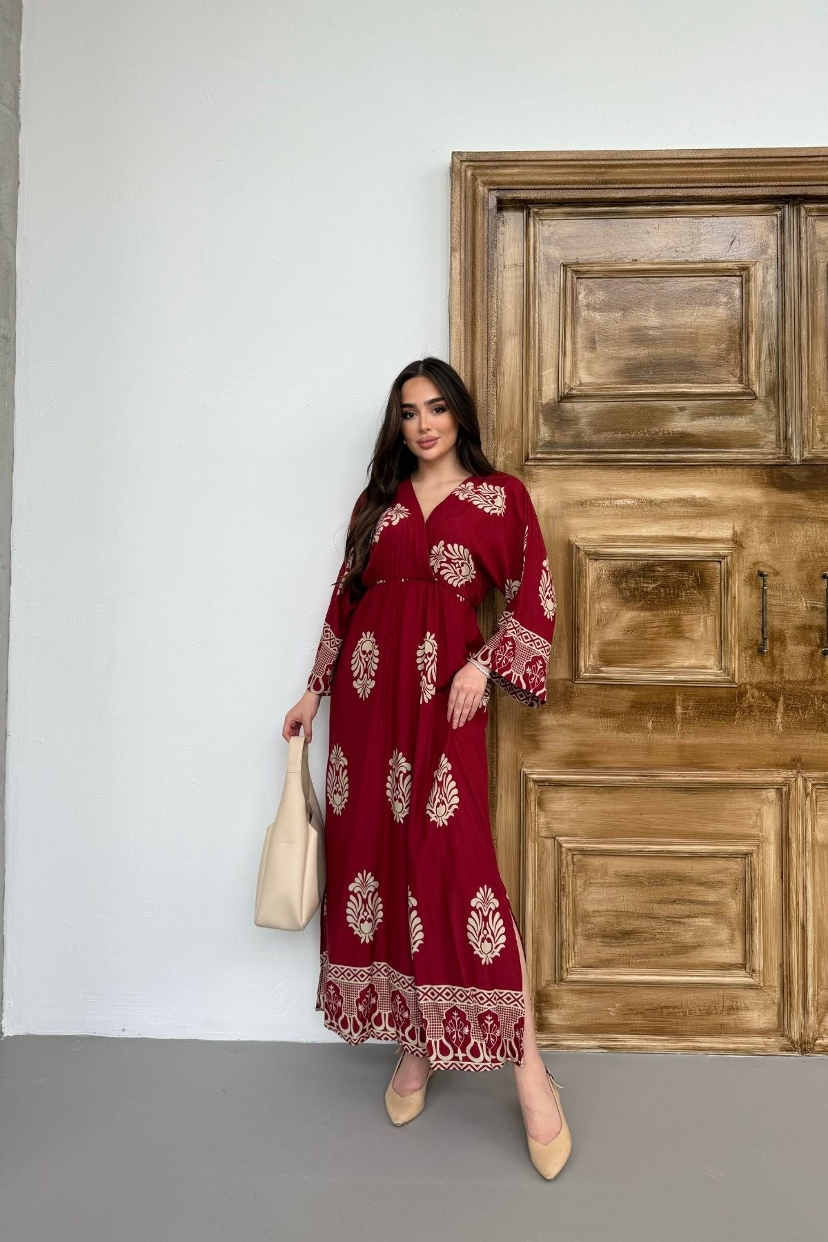 Otantik Desenli Bordo Uzun Kollu Elbise