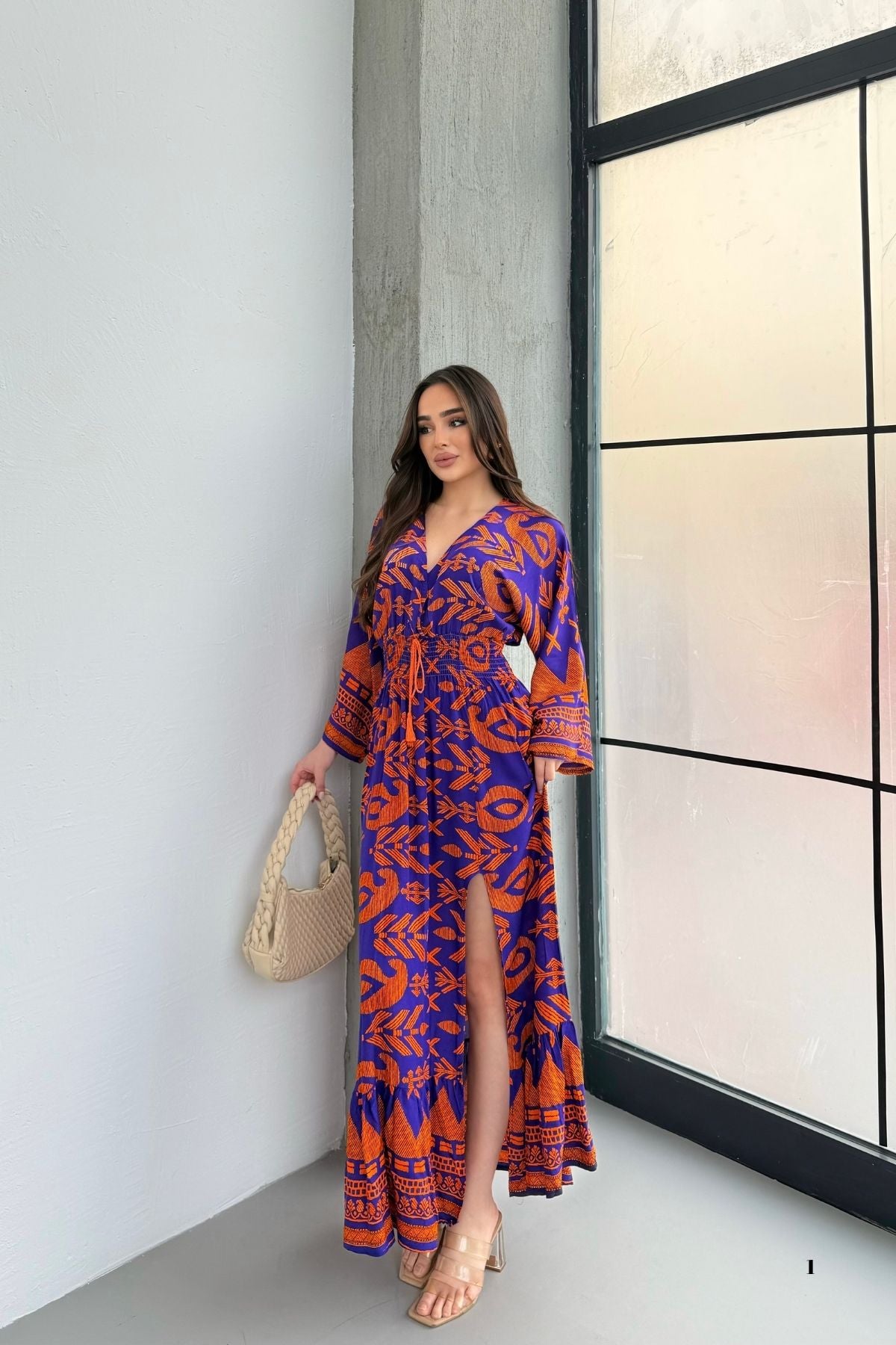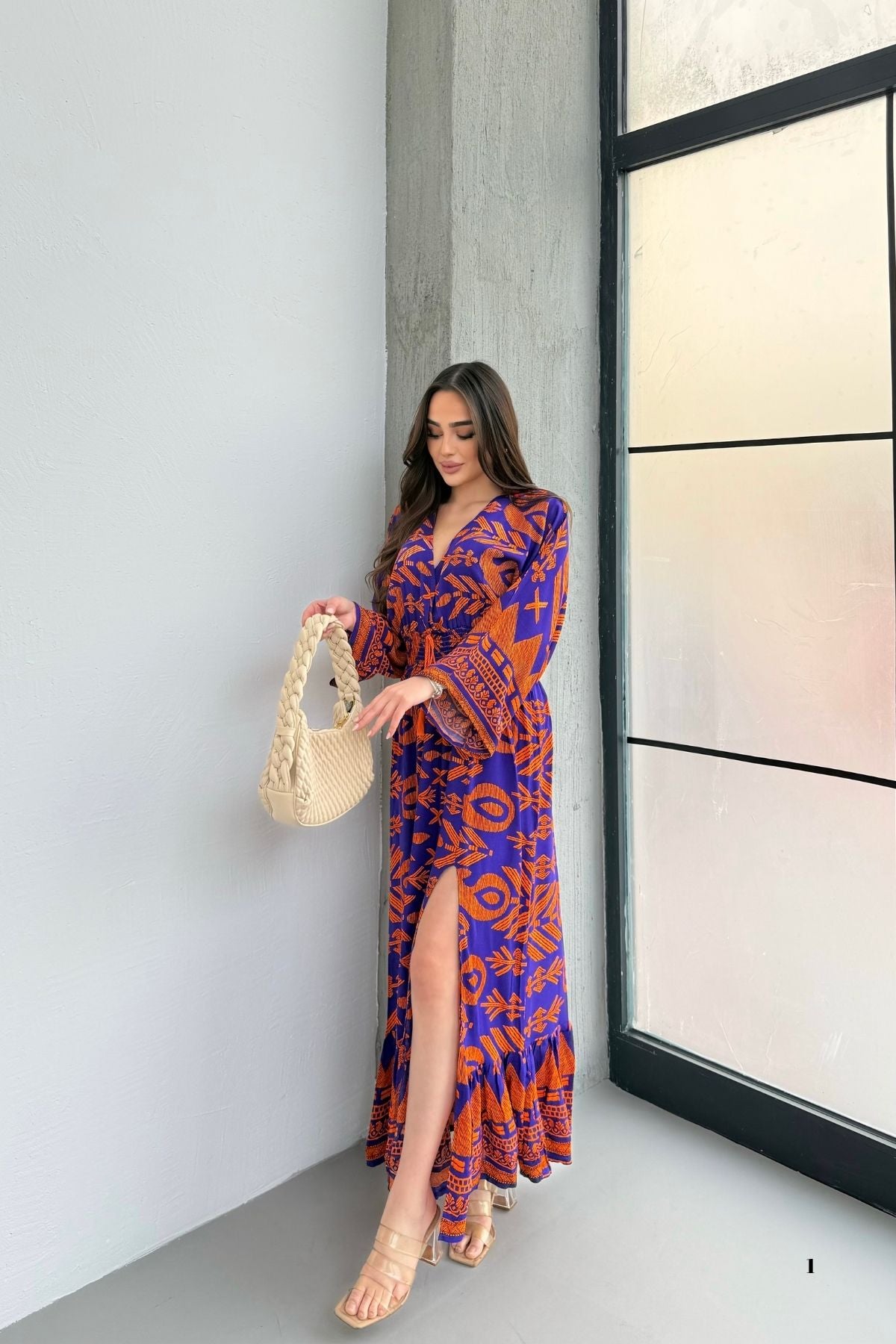 Turuncu Desenli Kruvaze Yaka Bağcıklı Uzun Kadın Elbise