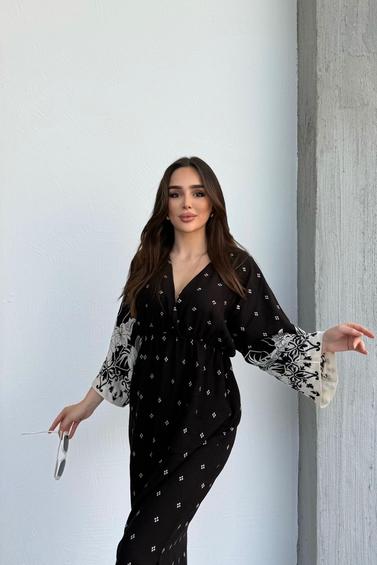 Uzun Kollu Etek Desenli Uzun Kadın Elbise
