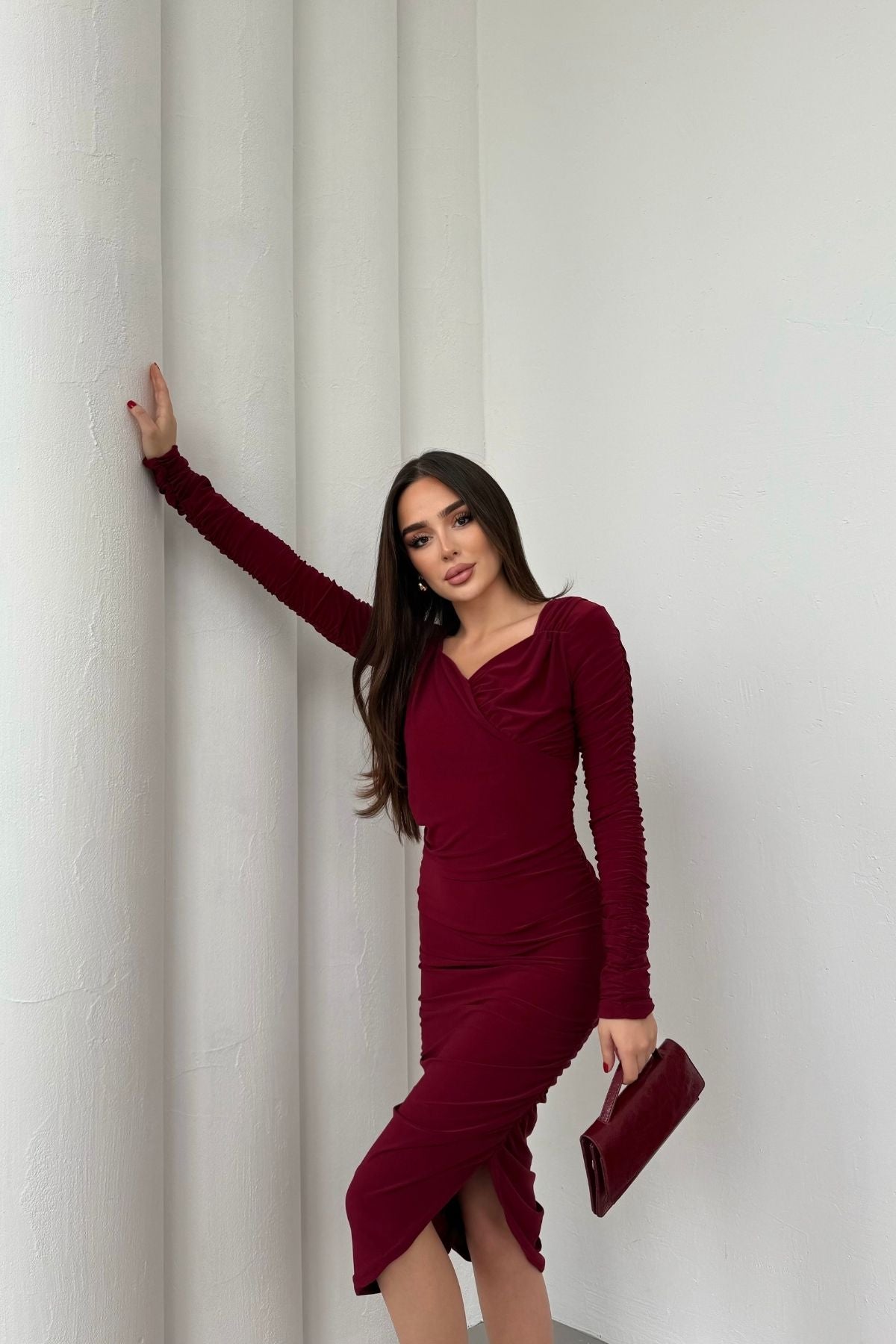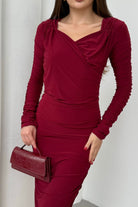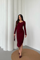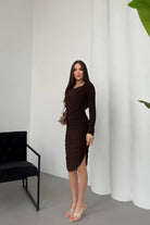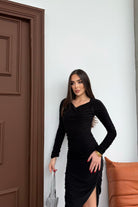 • Modern çizgileri ve iddialı duruşuyla öne çıkan bu elbise, Kadın Drapeli Uzun Kollu ön yırtmaç detay Büzgülü Detaylı Elbise • Vücudu saran formu, bel bölgesindeki drape tasarımıyla kusurları ustaca gizlerken, feminen bir siluet oluşturur.
