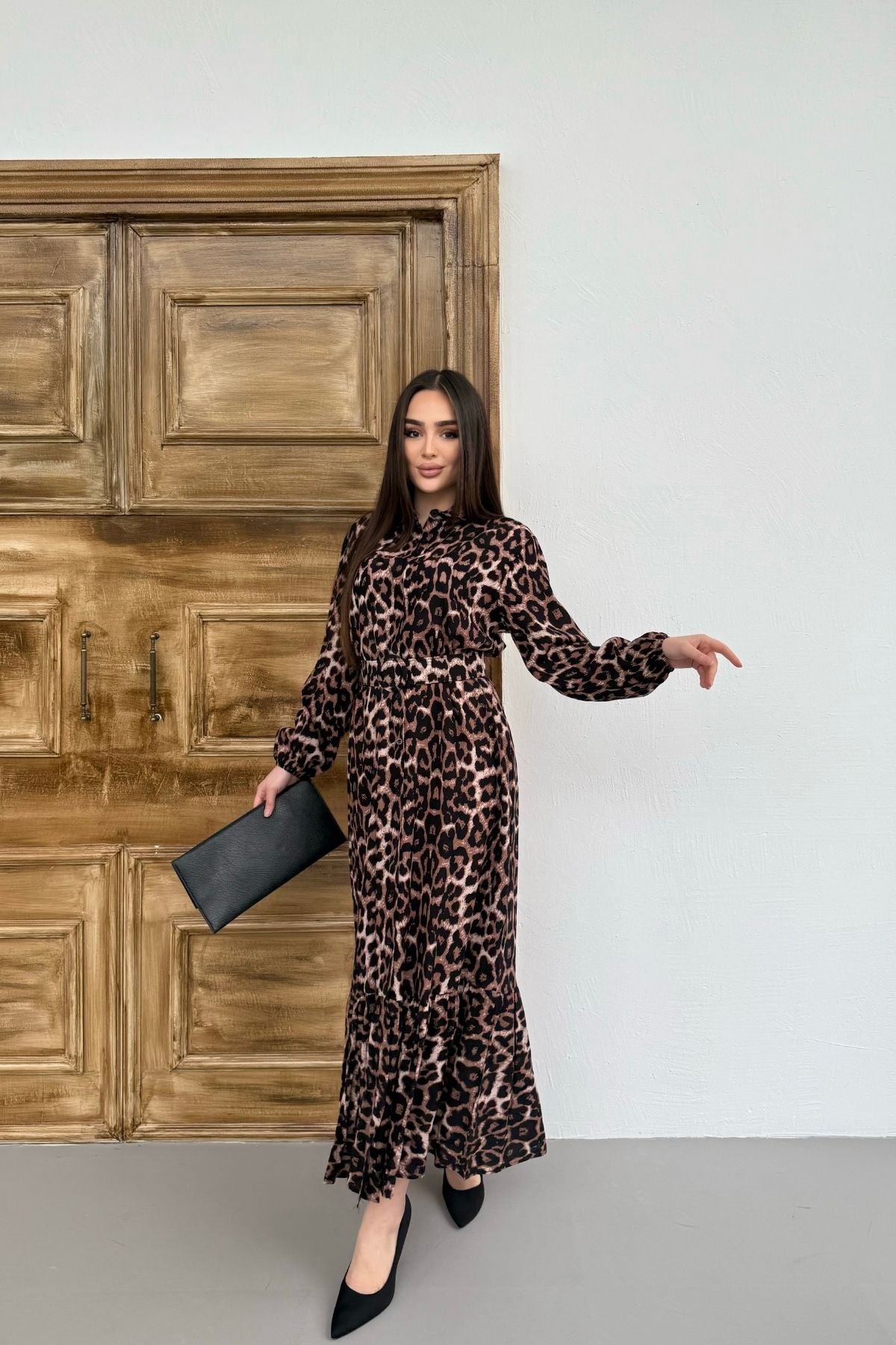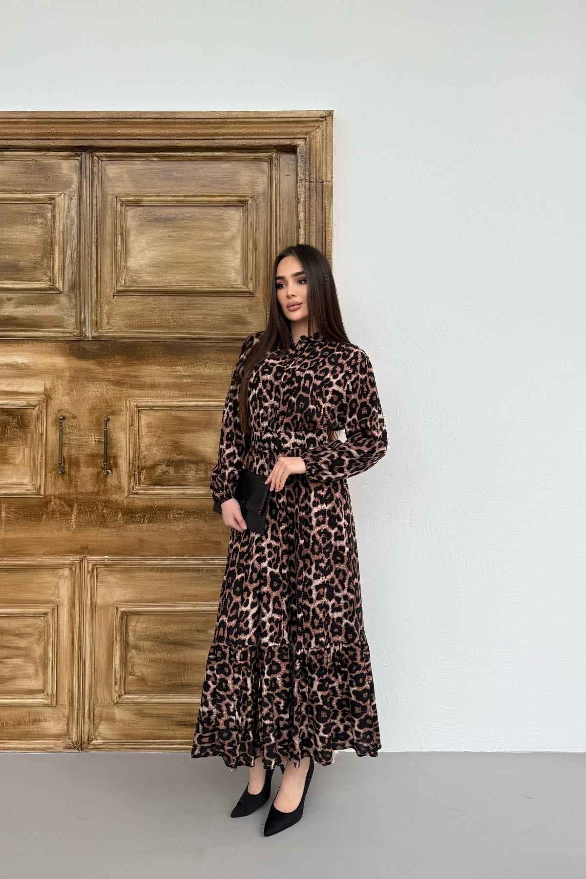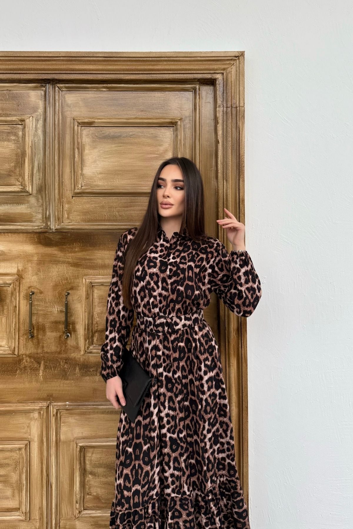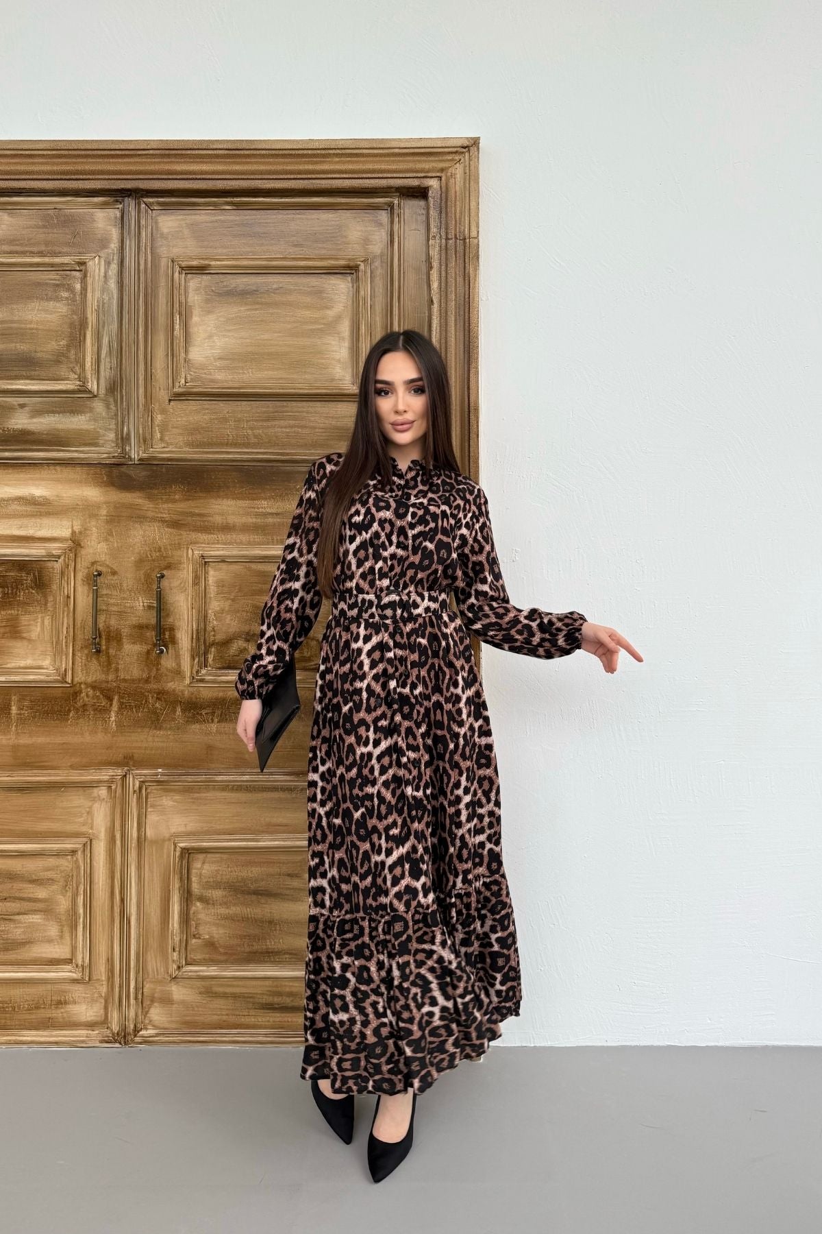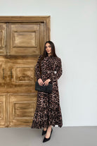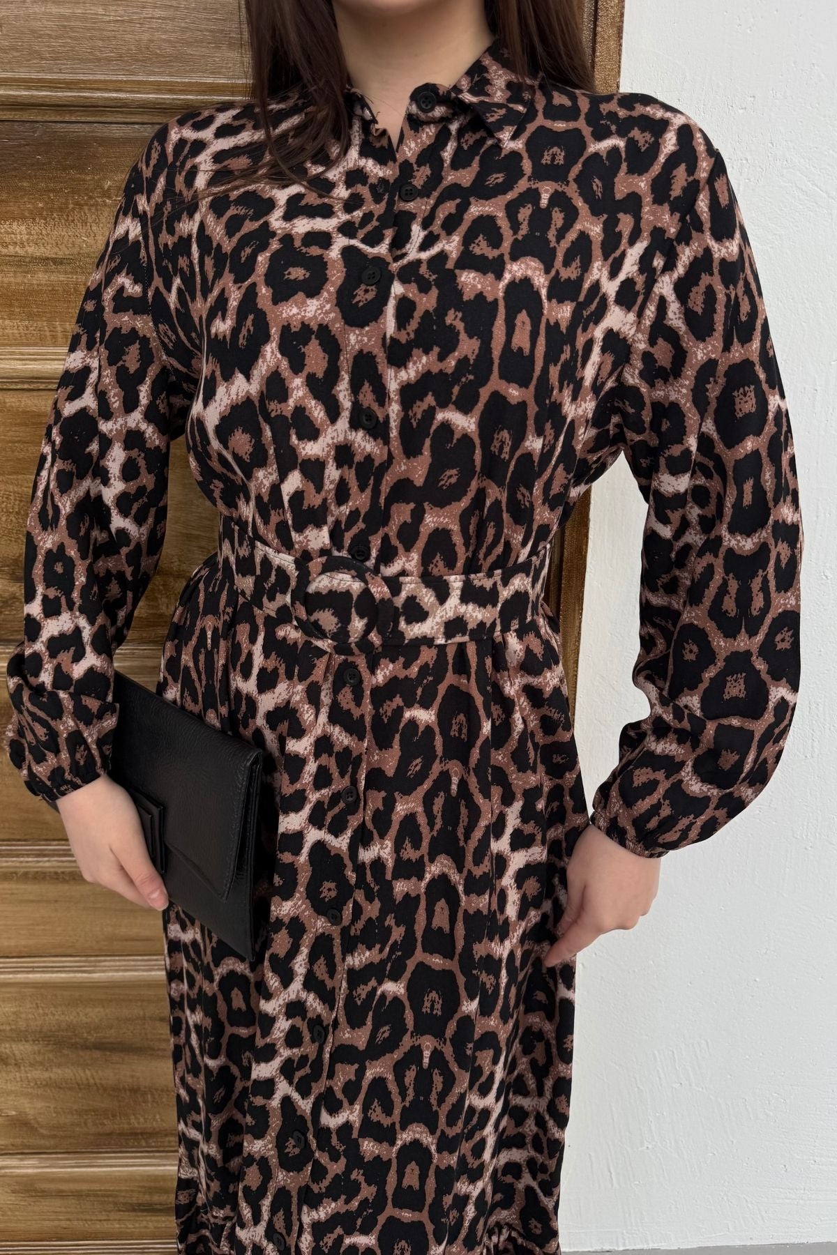 Leopar Desenli Viskon Uzun Kollu Kemerli Elbise