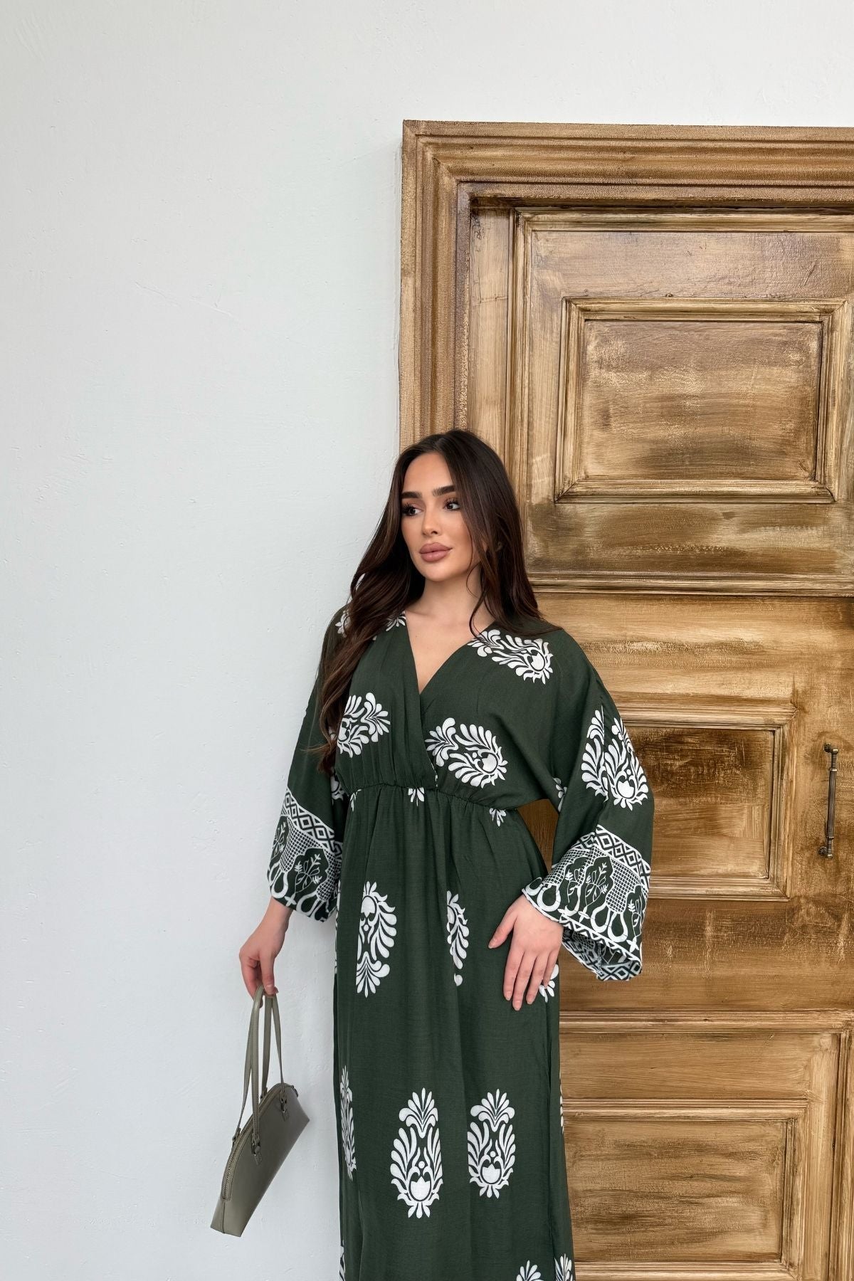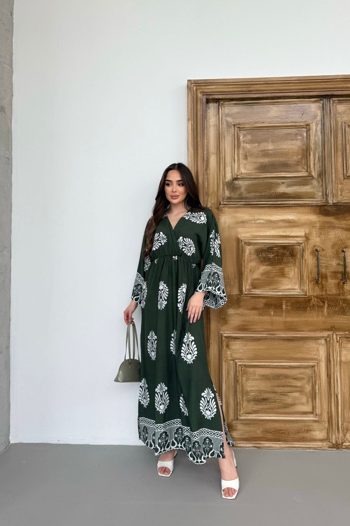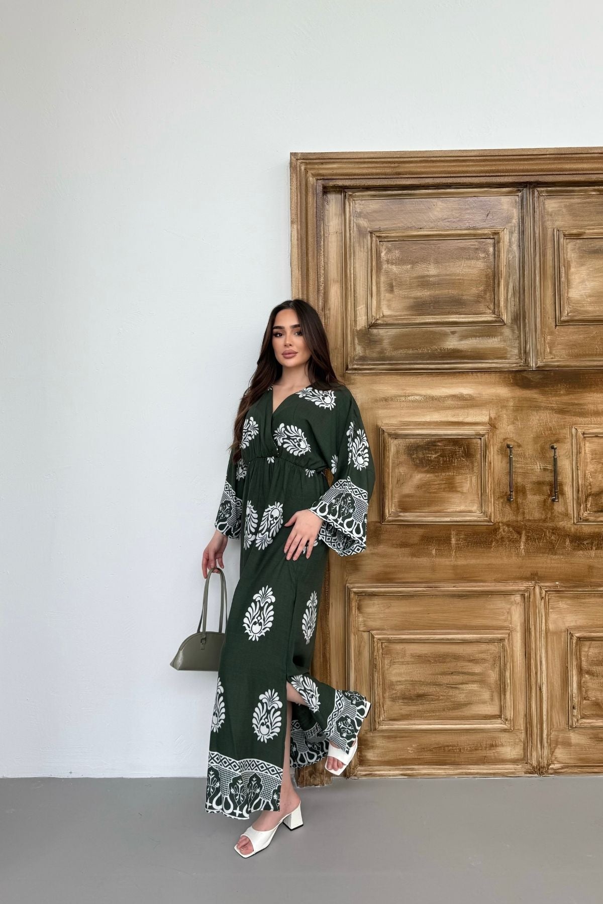 Otantik Desenli Yeşil Uzun Kollu Elbise