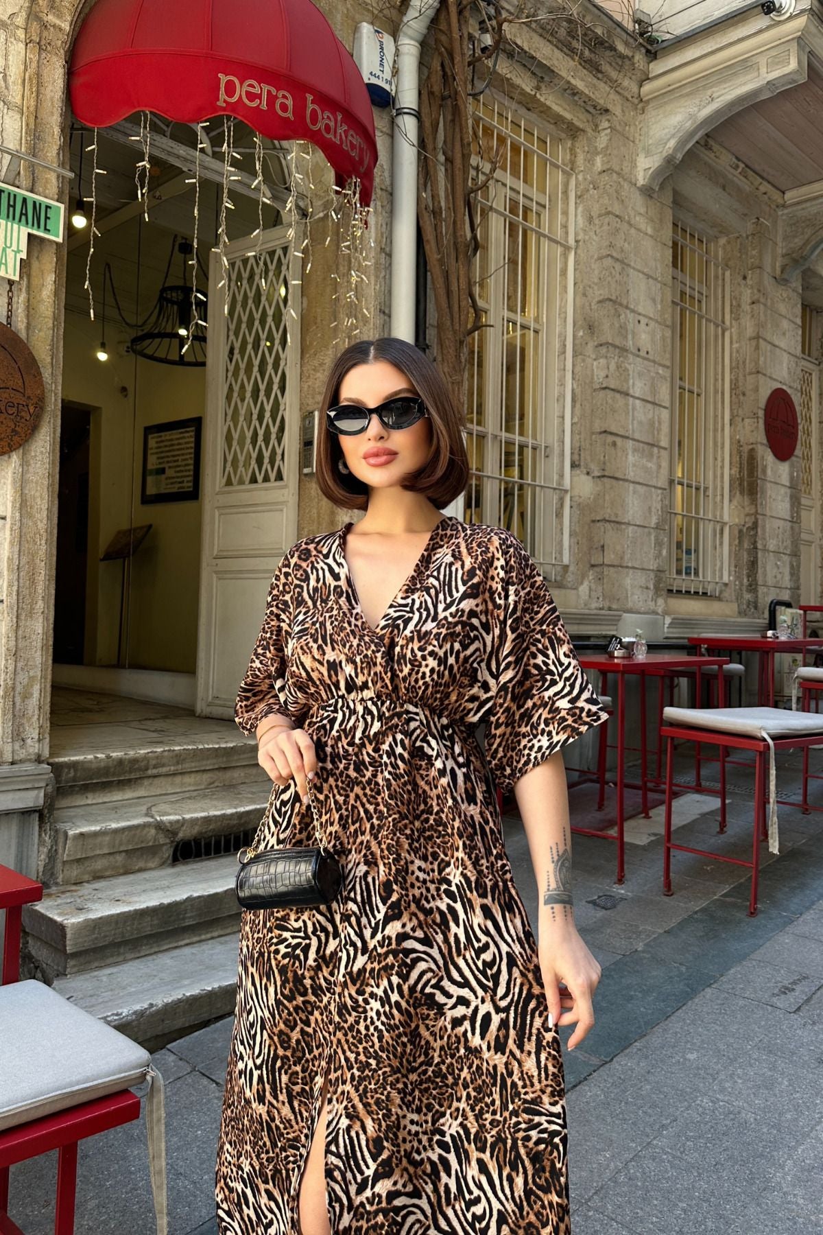 Yarasa Kol Beli Lastikli Önden Yırtmaçlı Midi Boy Desenli Yazlık Şık Leopar Desenli Elbise