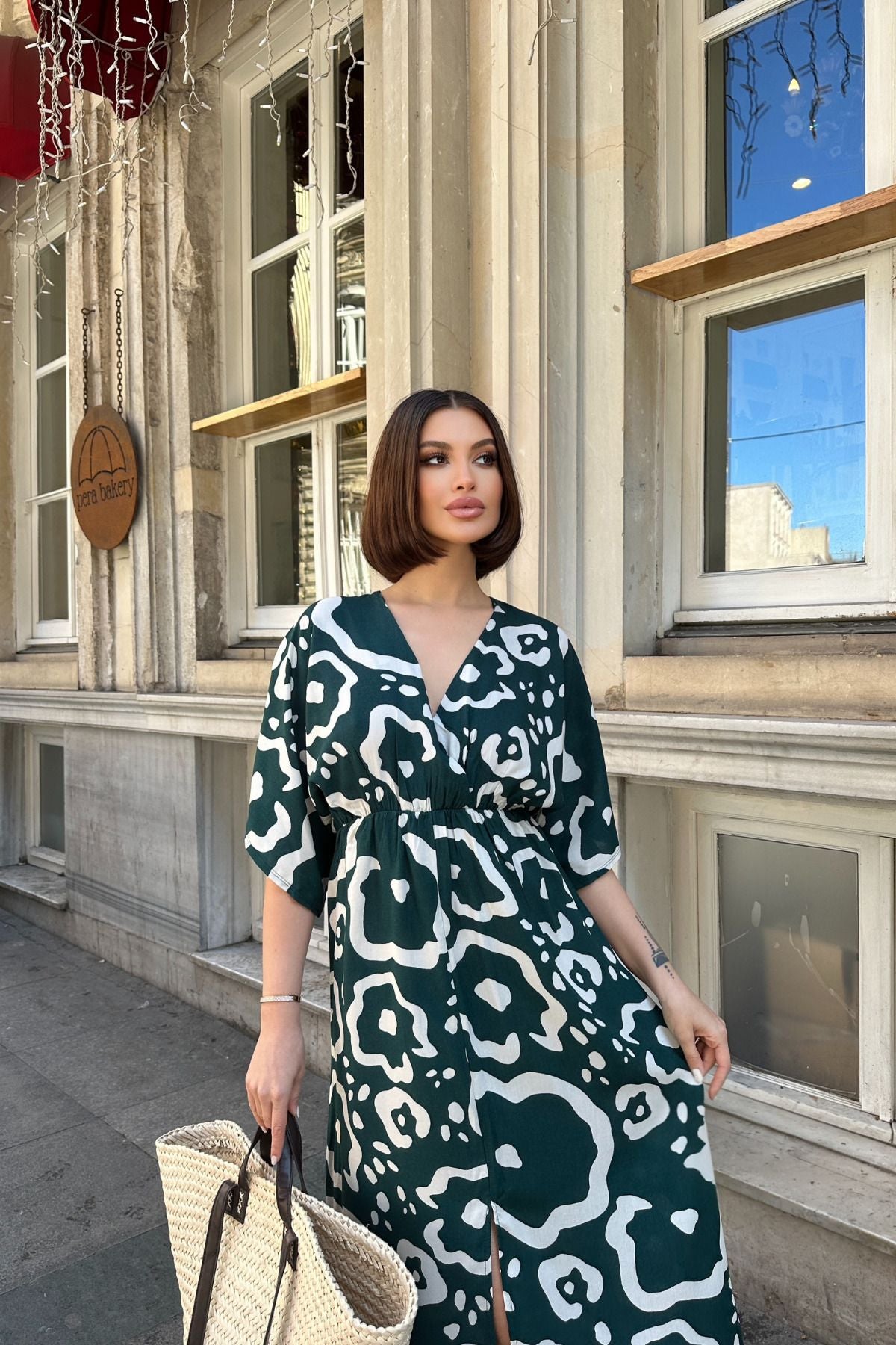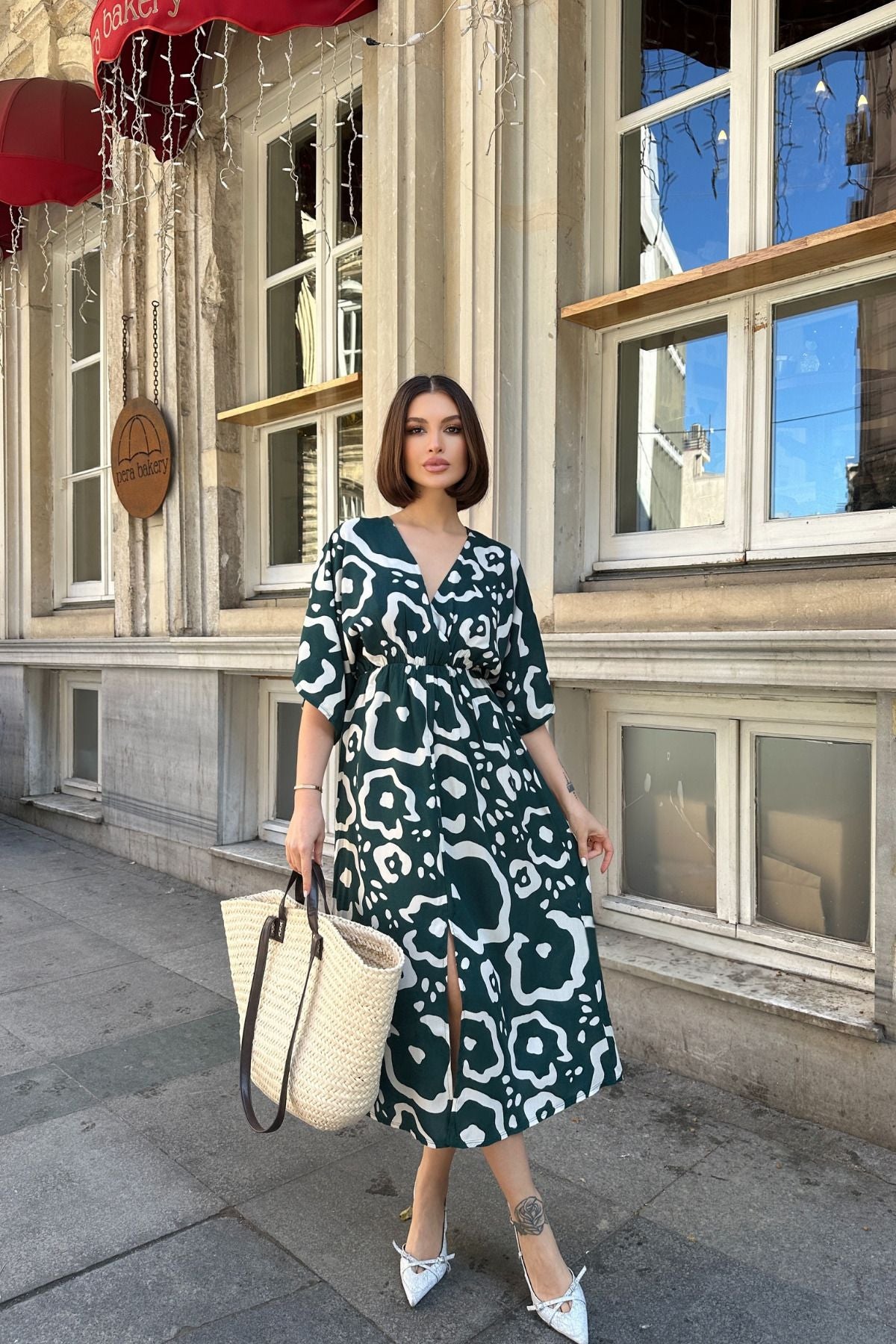 Yarasa Kol Beli Lastikli Önden Yırtmaçlı Midi Boy Kruvaze Yaka Desenli Yazlık Yeşil Beyaz Elbise