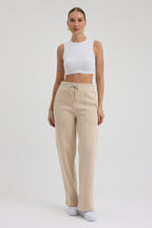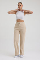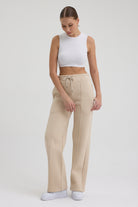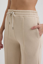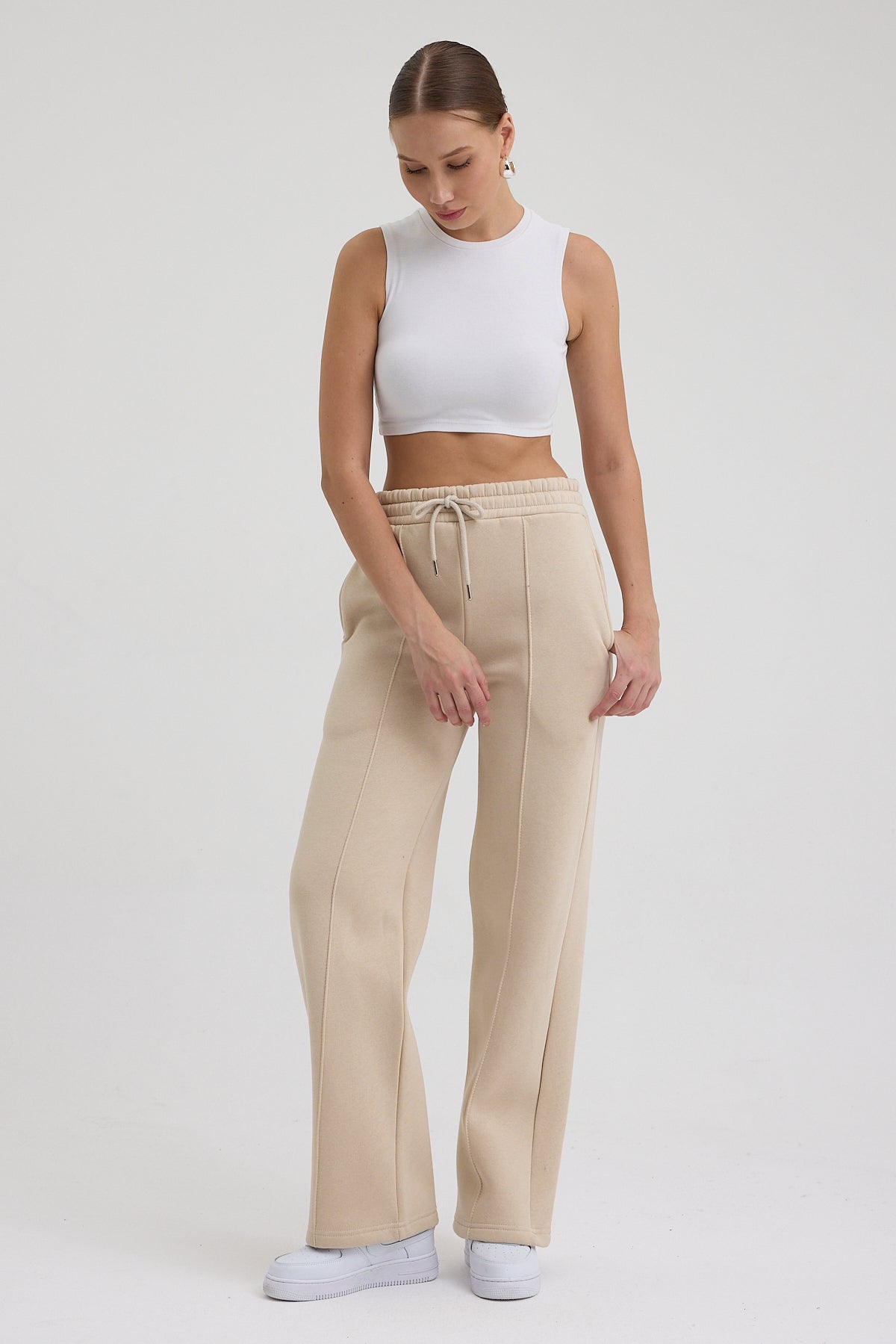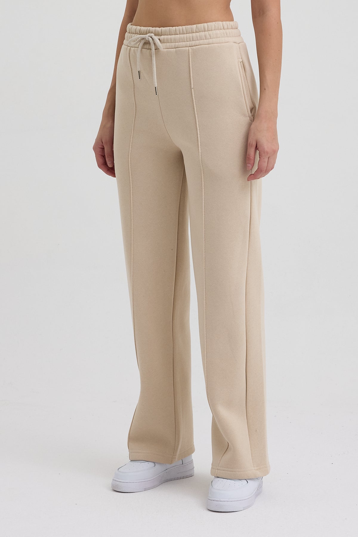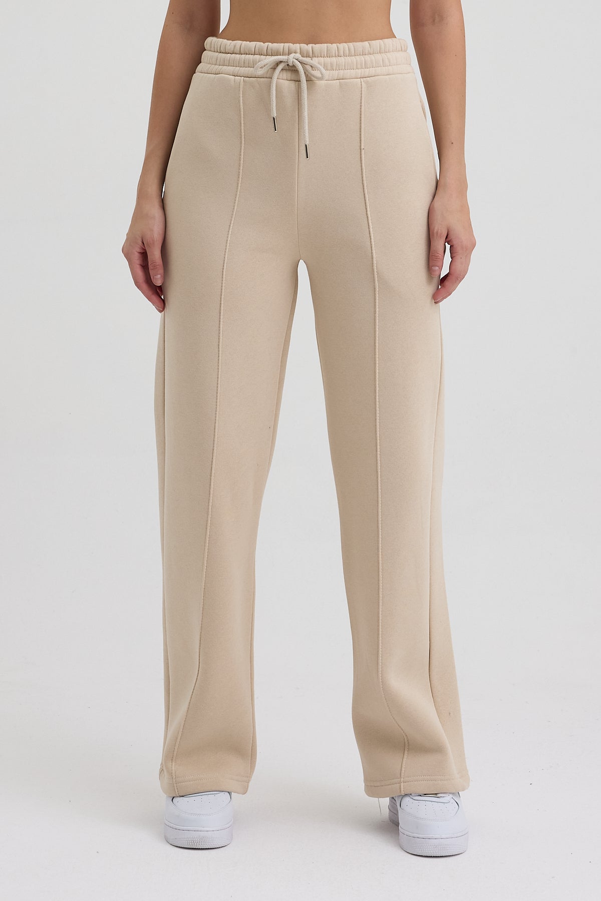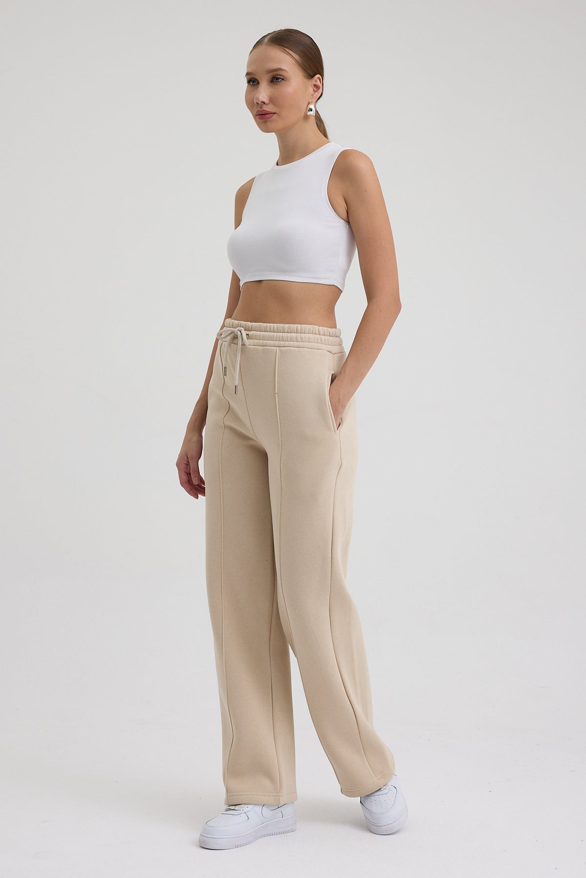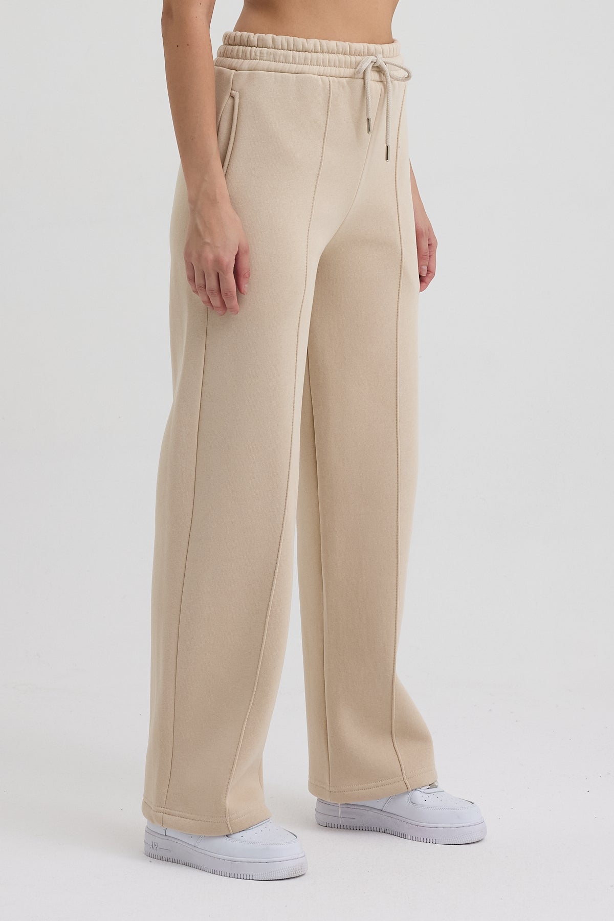 Kadın Yüksek Bel Nervürlü Kışlık Polarlı Paça Dikişli Bol Paça Eşofman Altı Bej