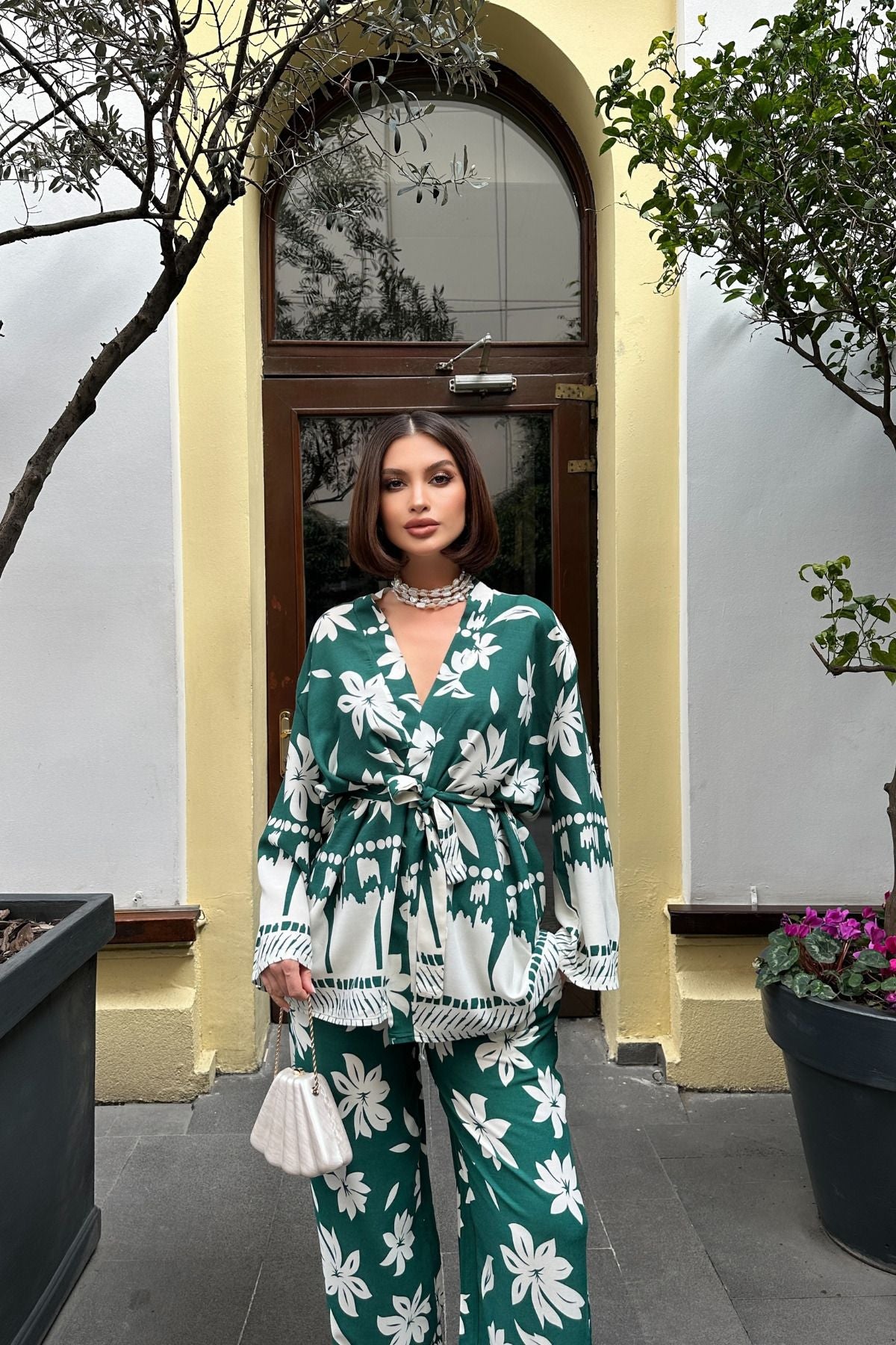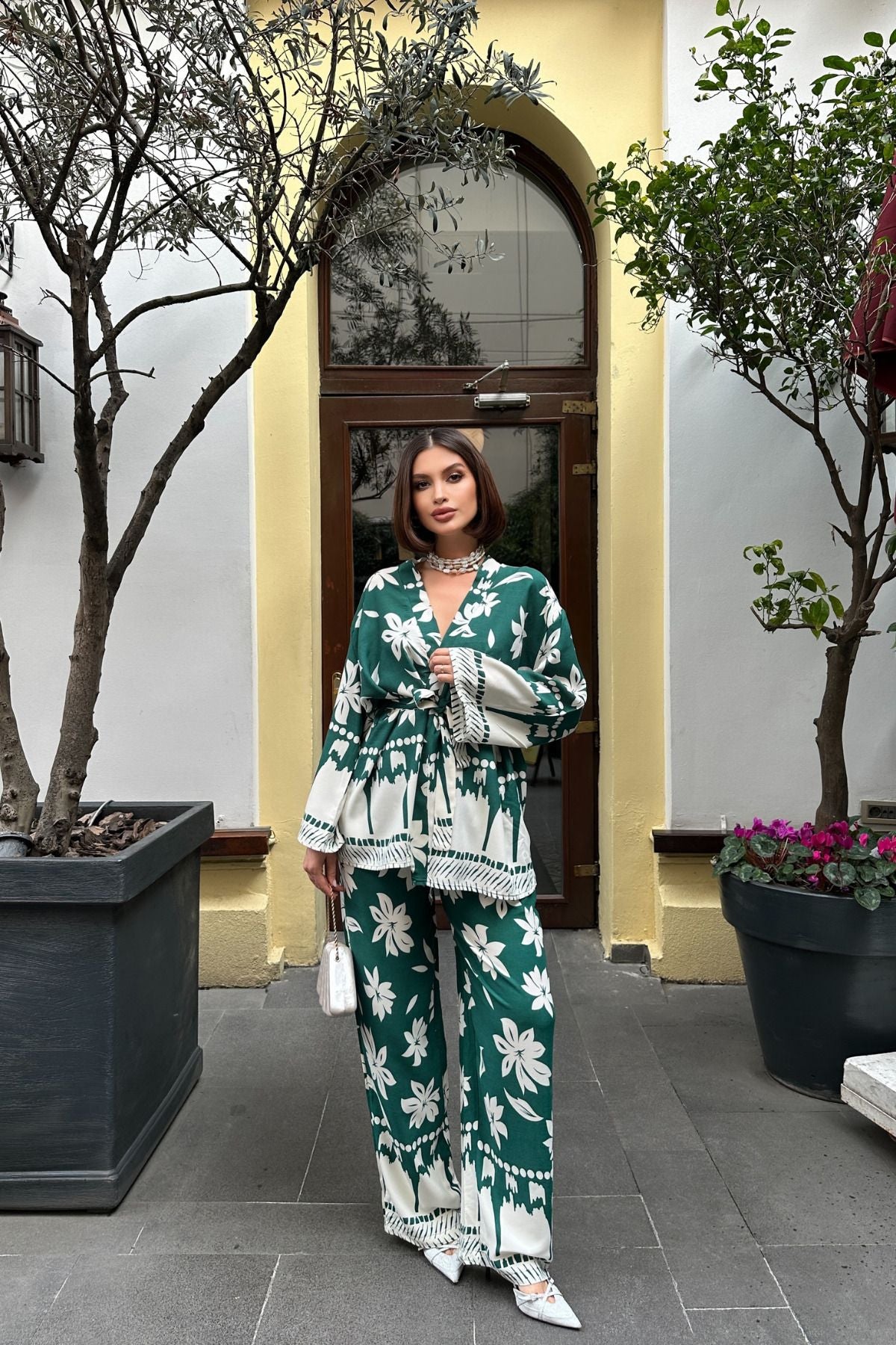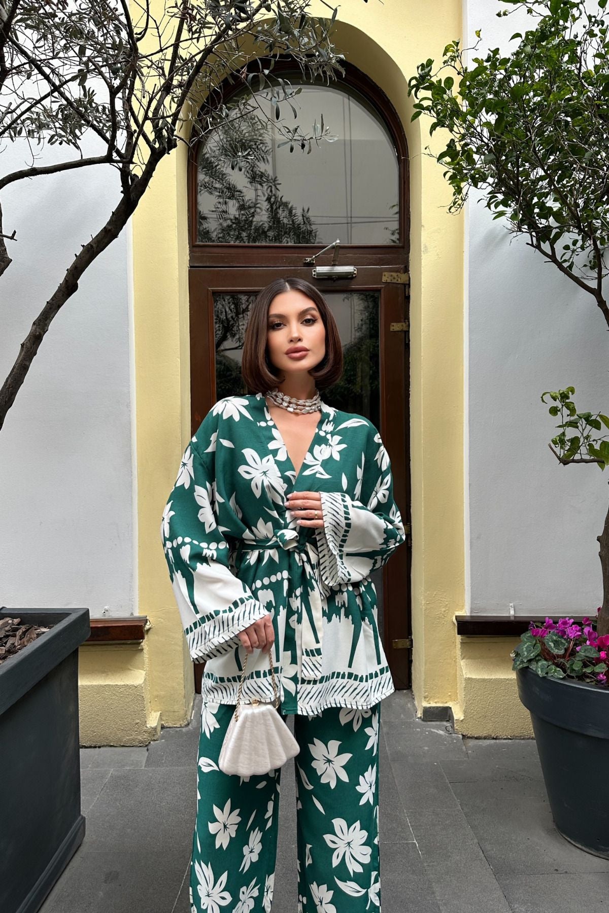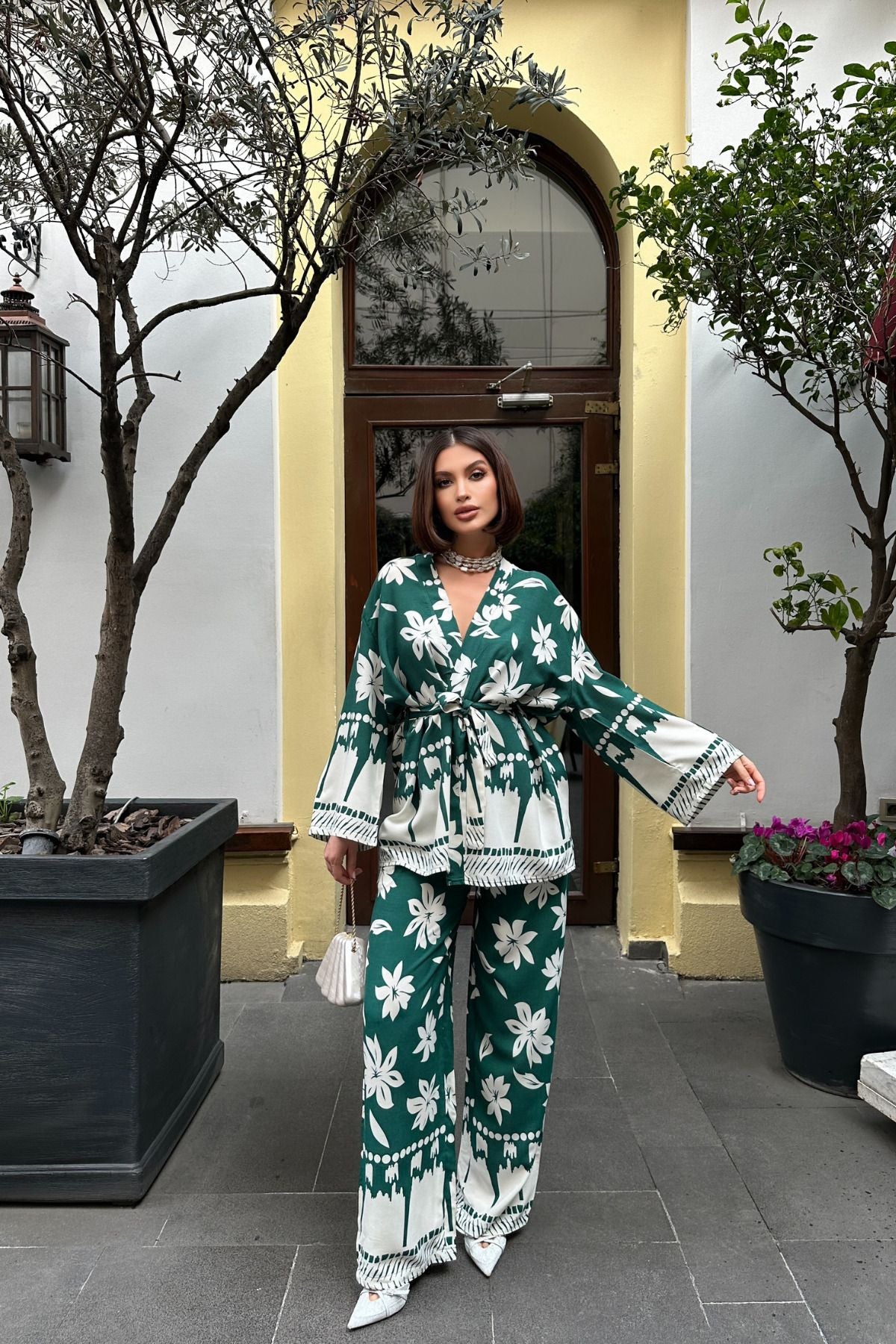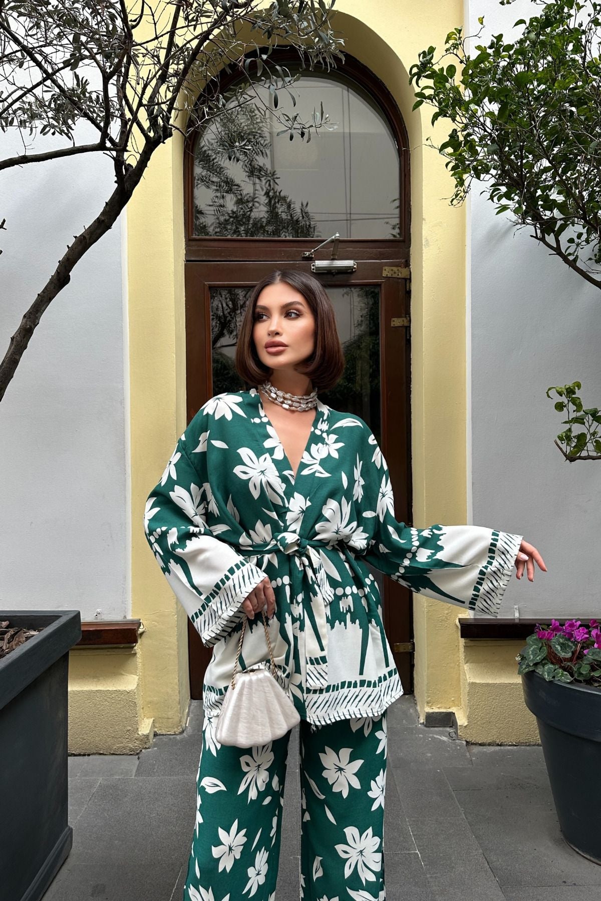 Kadın Yeşil Beyaz Kimono Ceket Ve Palazzo Pantolon Takım