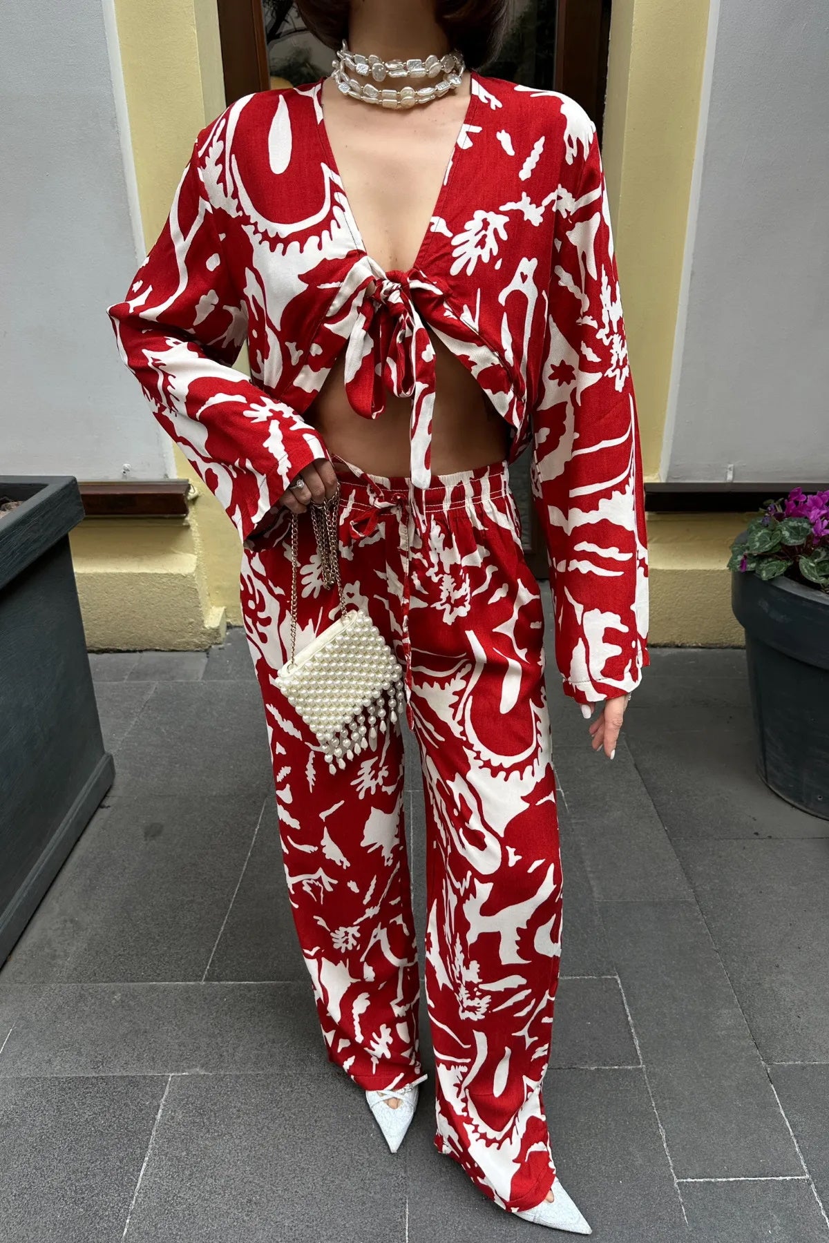 Kırmızı Desenli Dokuma Bağlamalı Bluz Pantolon 2'li Takım