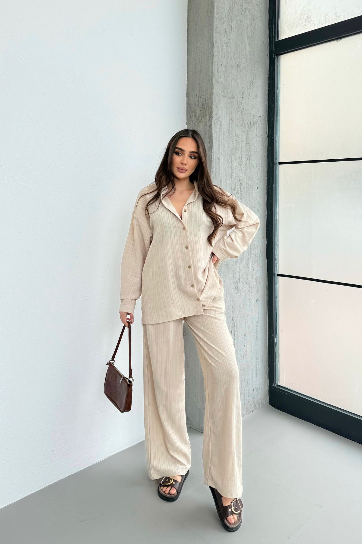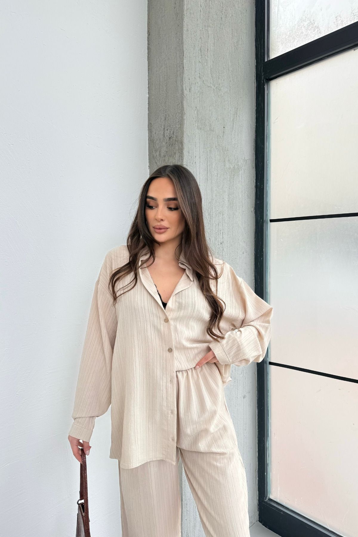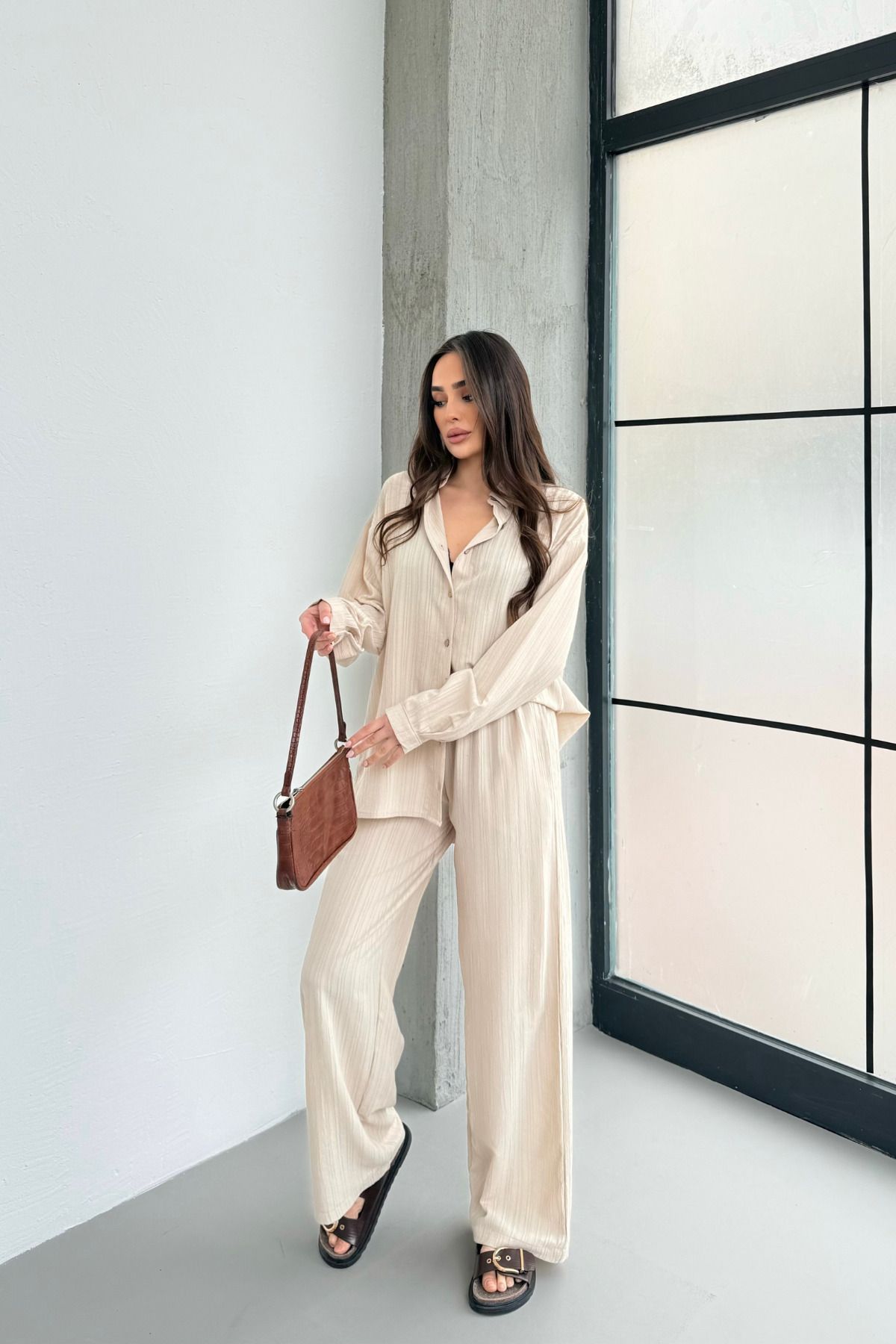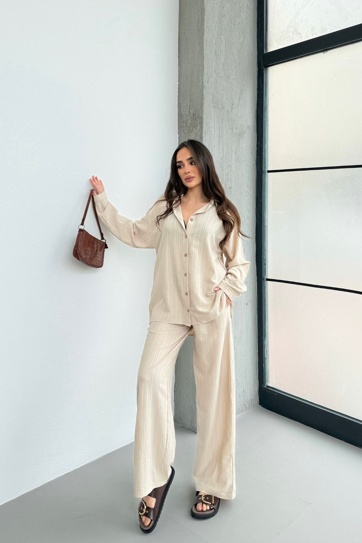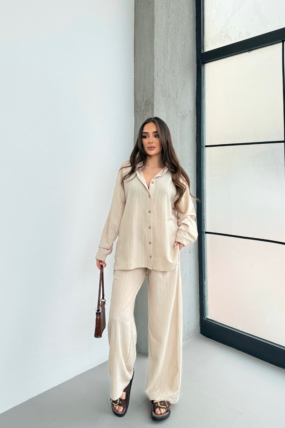 Krem Gofre Dokuma Kumaş Gömlek Alt-üst Takım