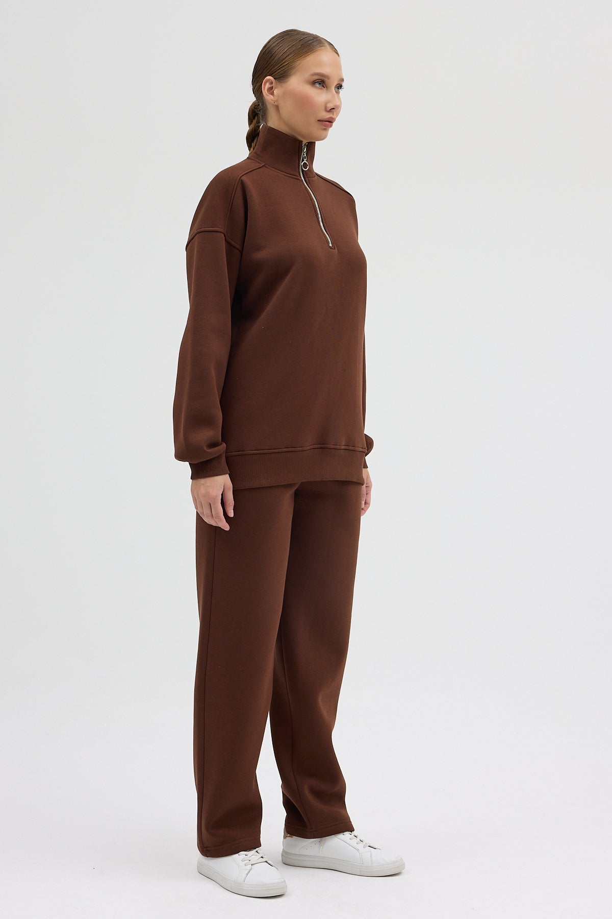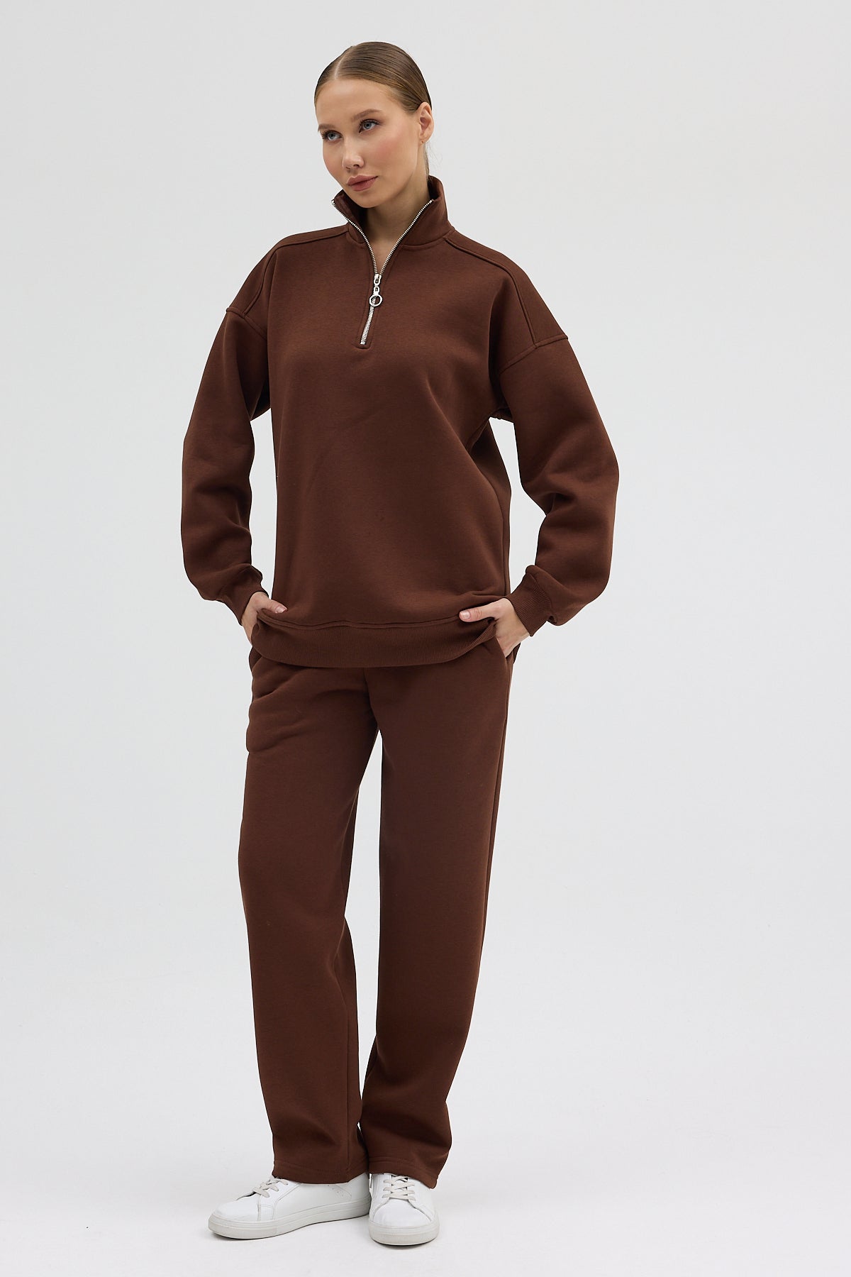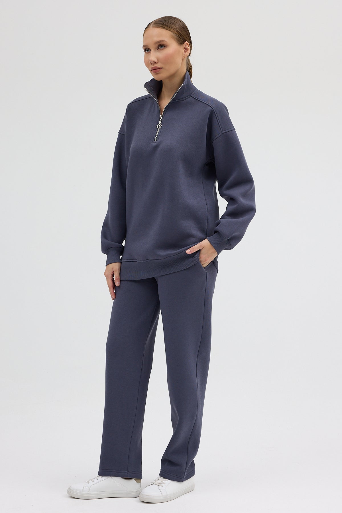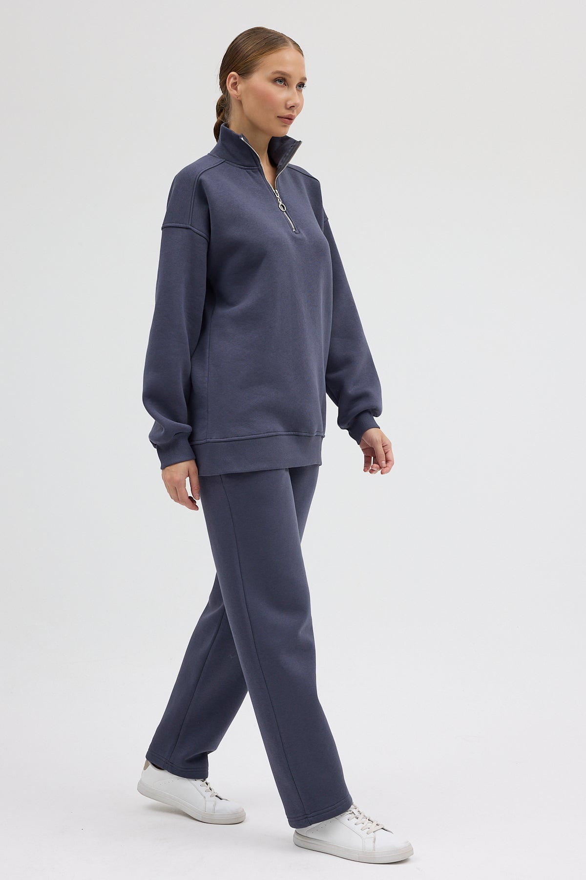 Kadın Yarım Fermuarlı Kışlık İçi Şardonlu Kalın Sweatshırt Ve Paçası Düz Füme Eşofman Takımı