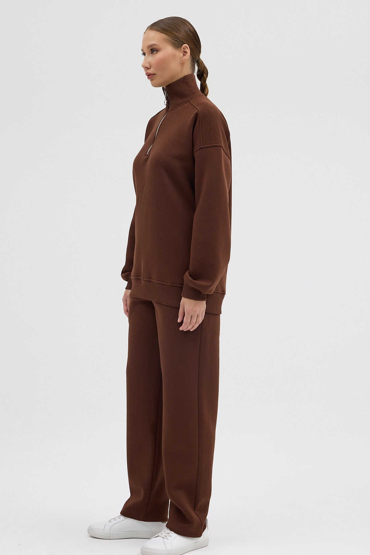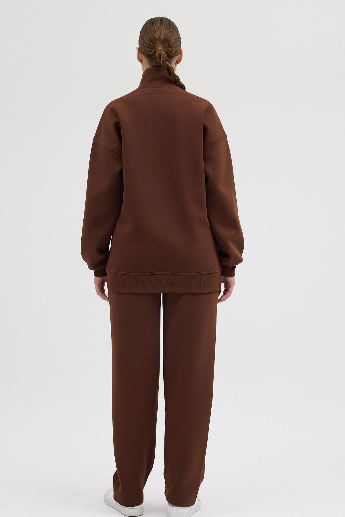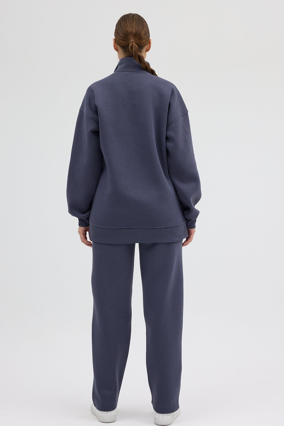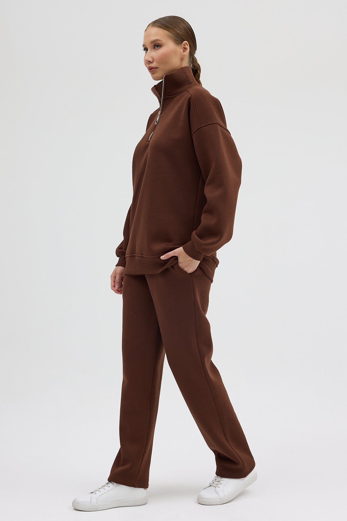 Kadın Yarım Fermuarlı Kışlık İçi Şardonlu Kalın Sweatshırt Ve Paçası Düz Füme Eşofman Takımı