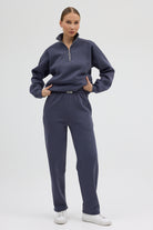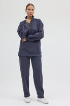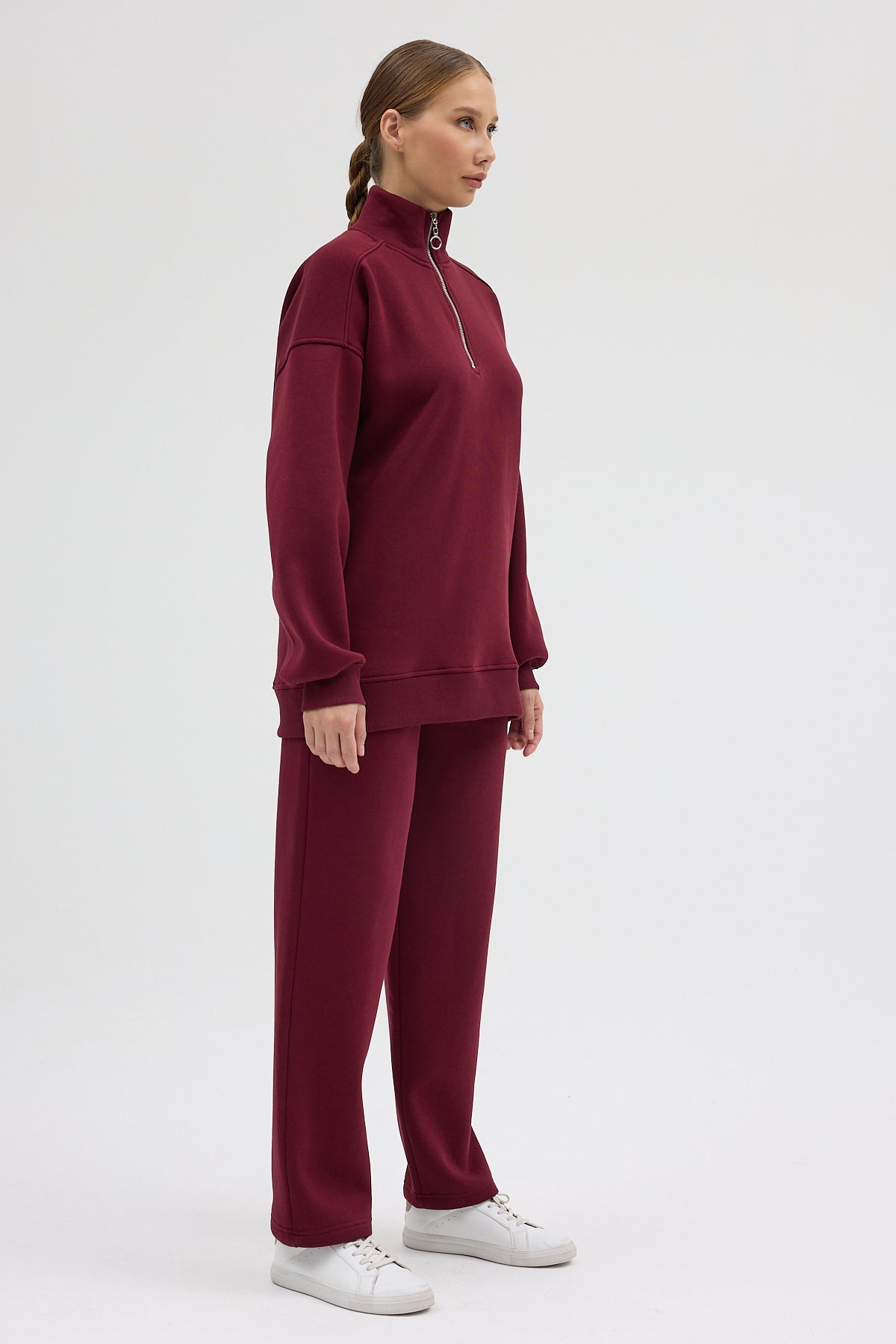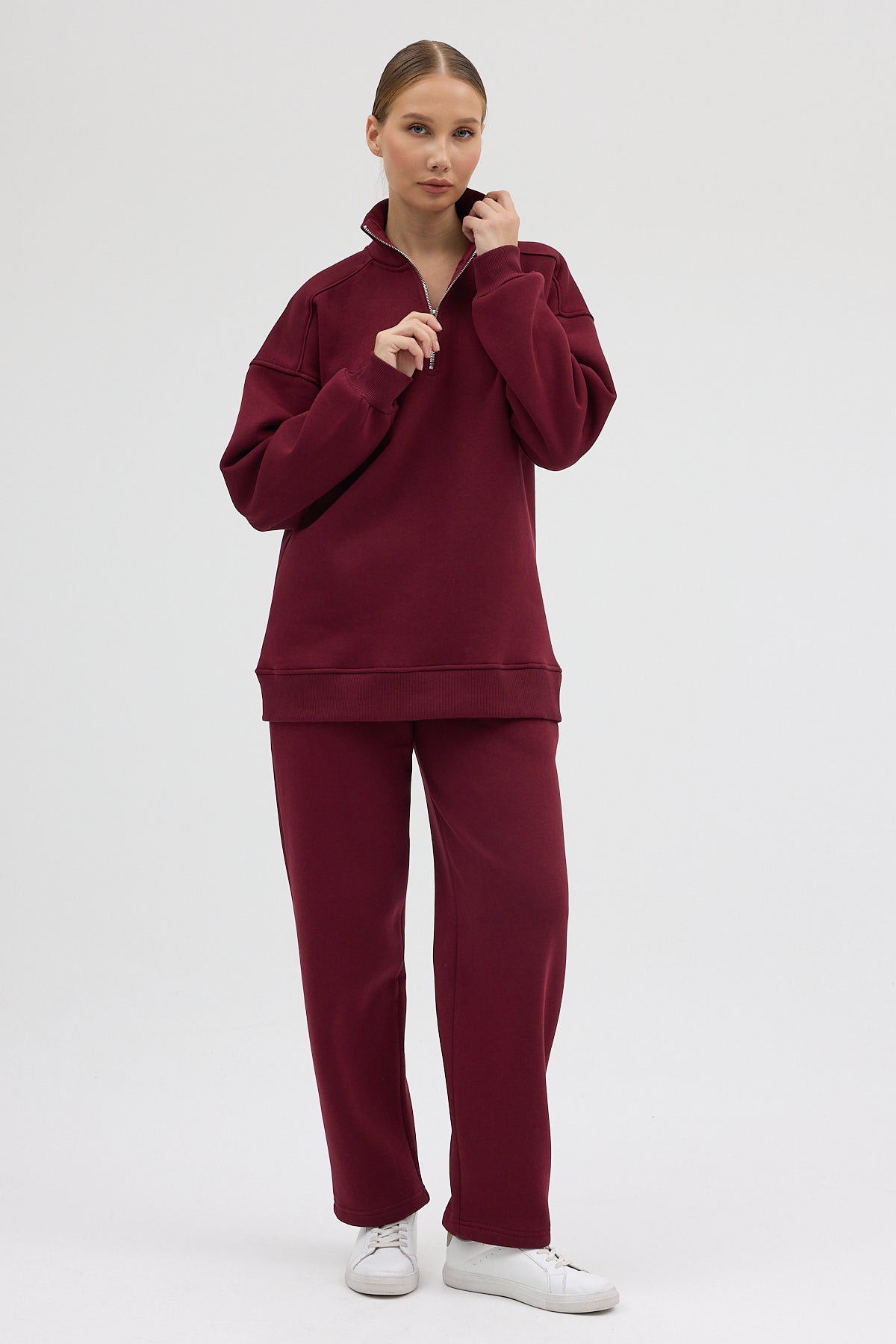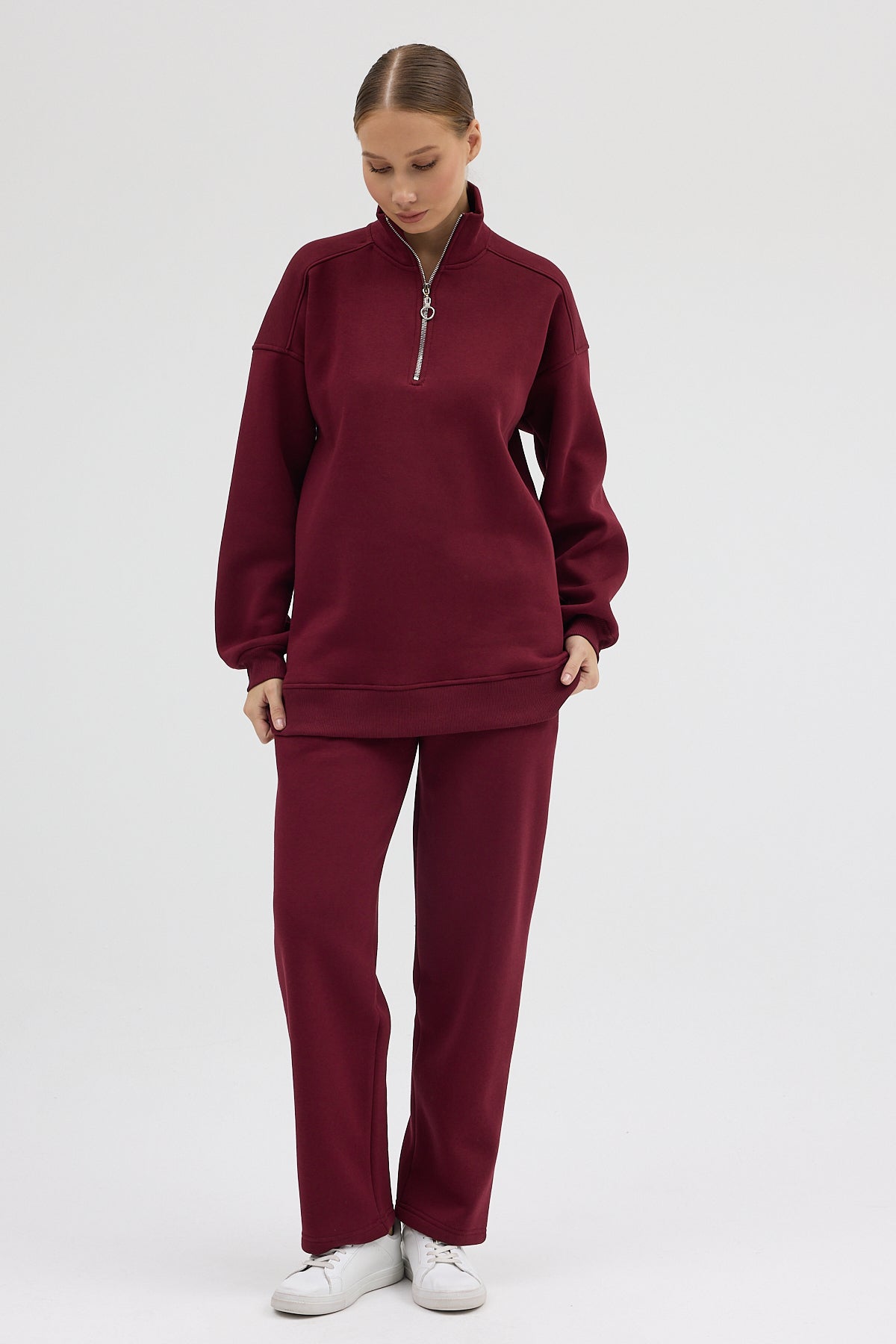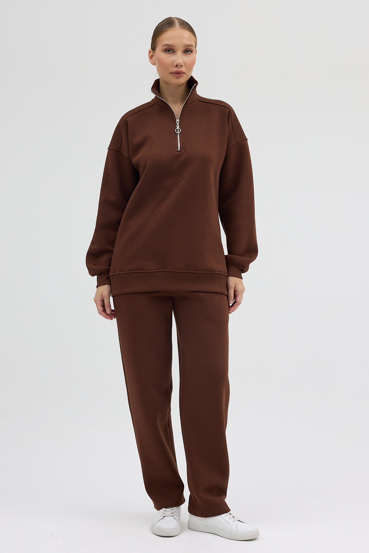 Kadın Yarım Fermuarlı Kışlık İçi Şardonlu Kalın Sweatshırt Ve Paçası Düz Füme Eşofman Takımı