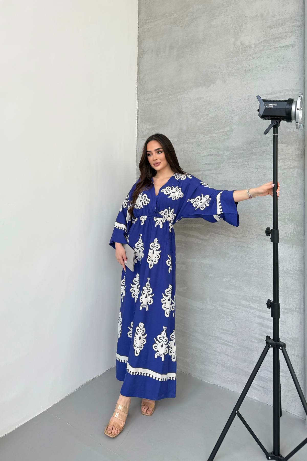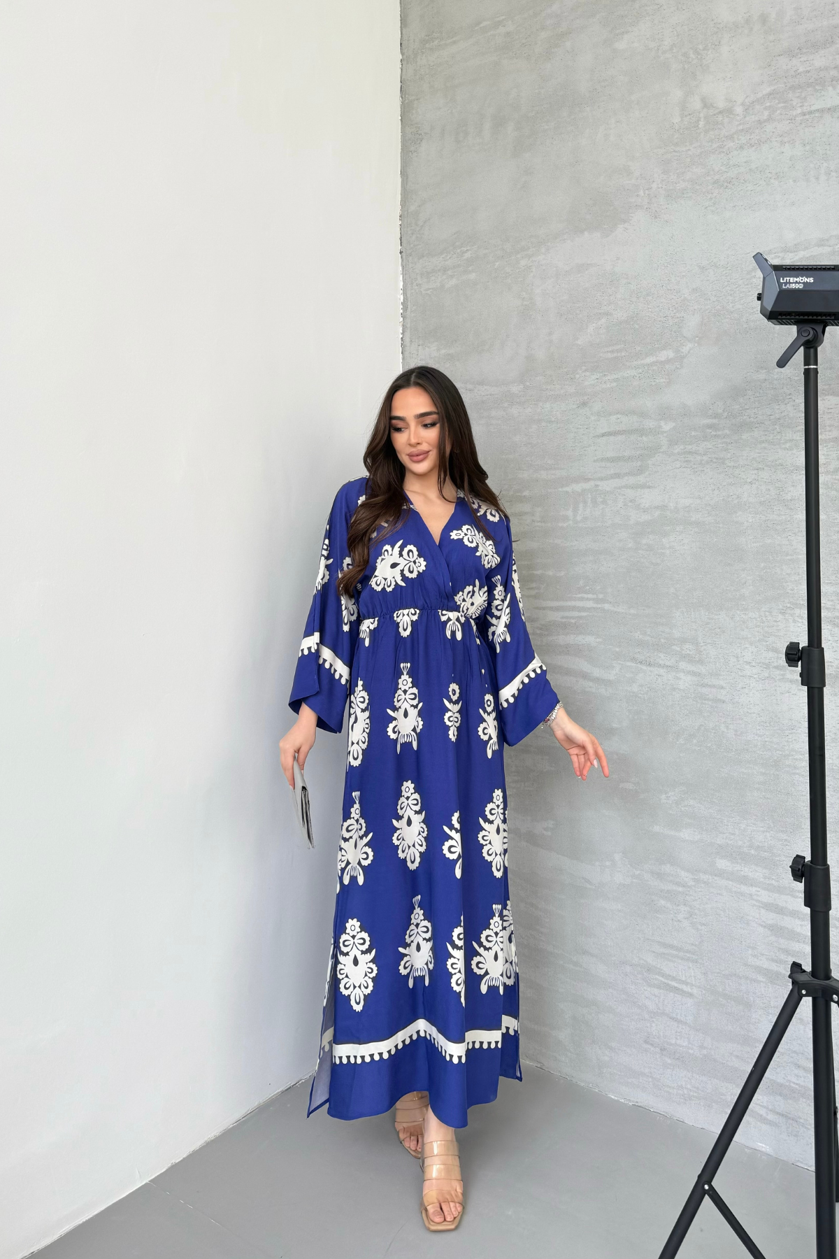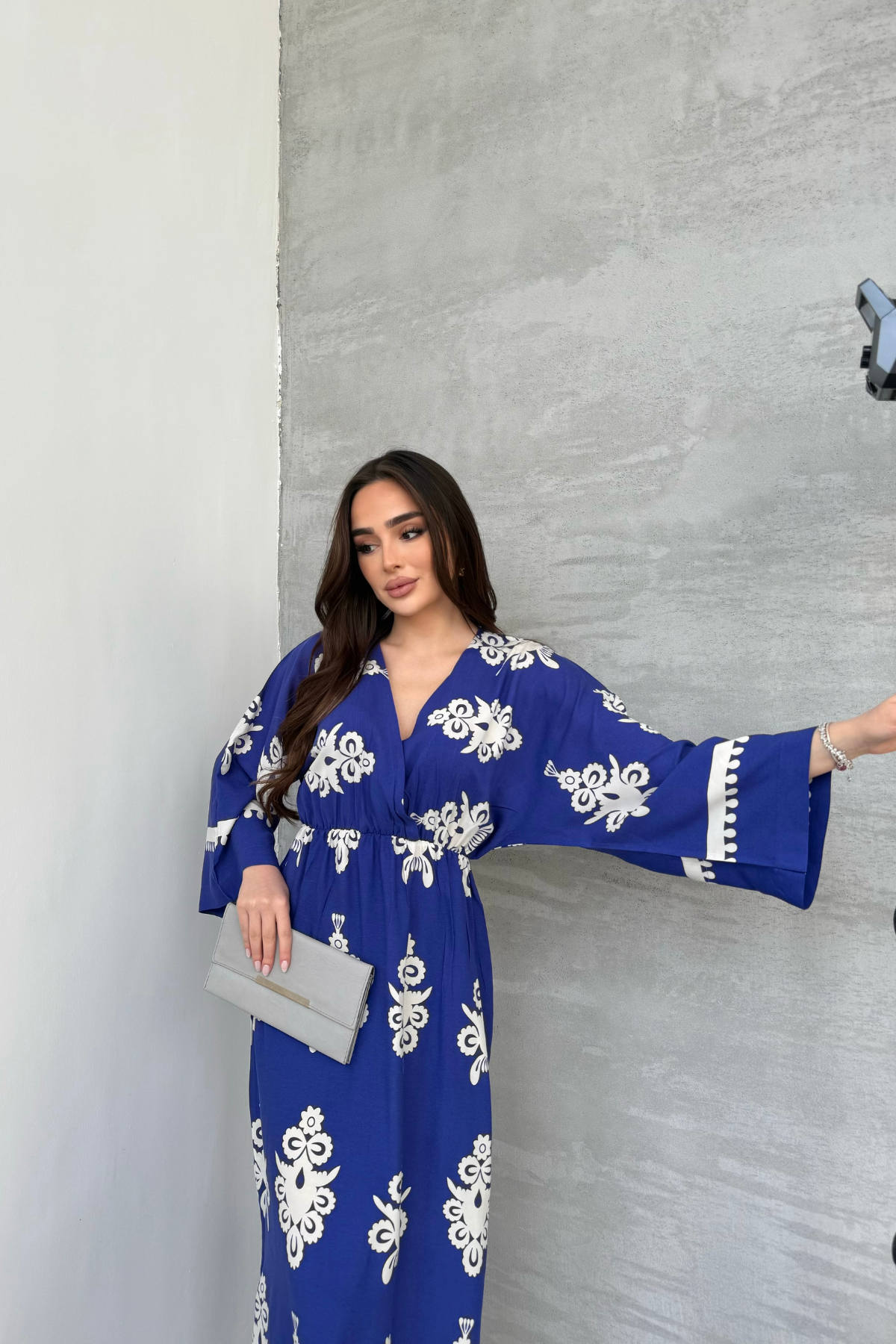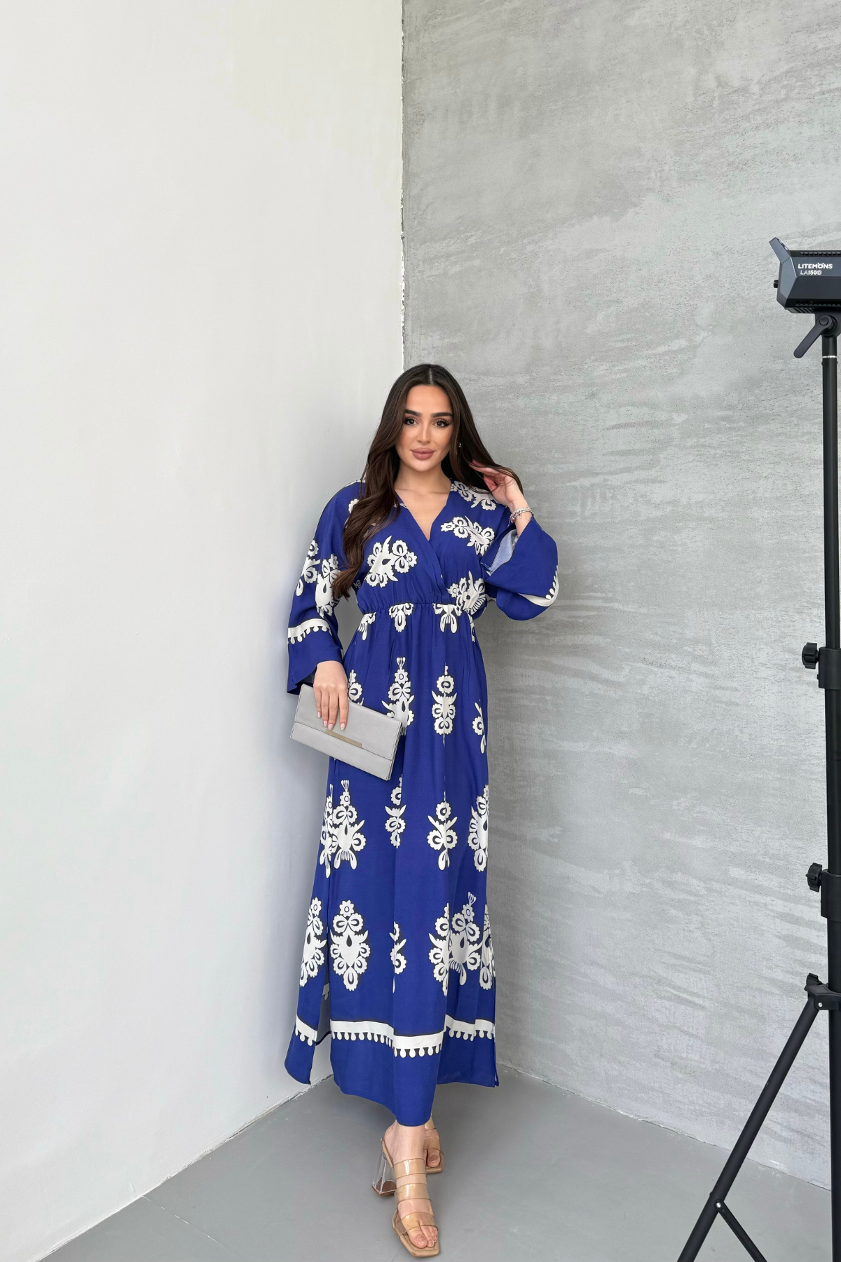 Etnik Desenli Viskon Uzun Kollu Mavi Elbise