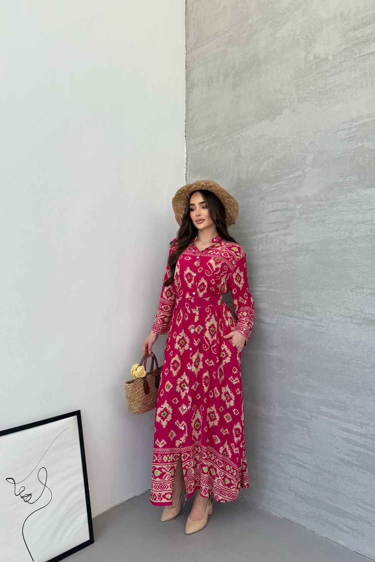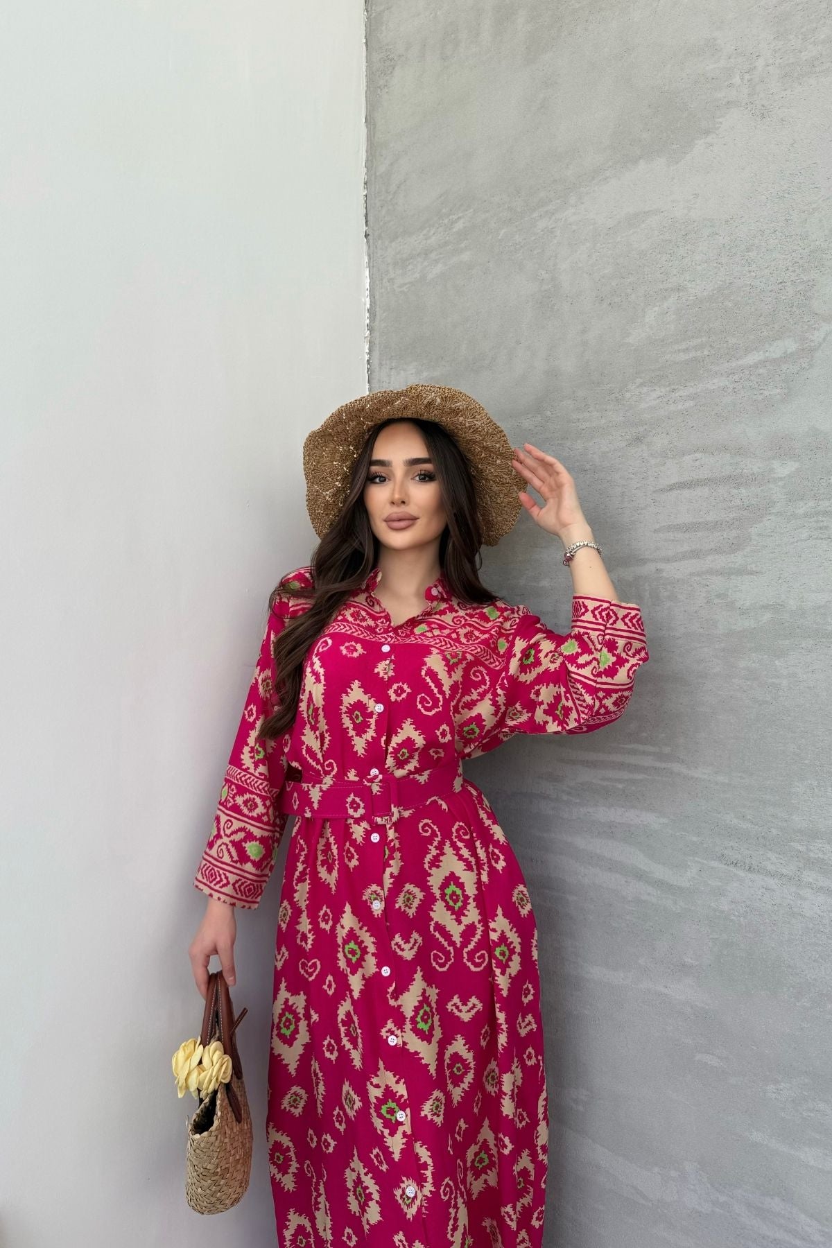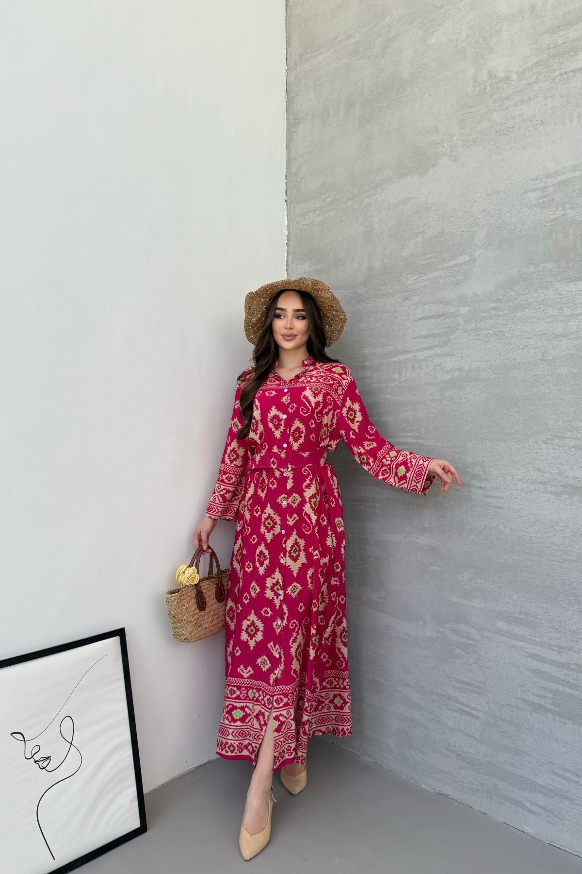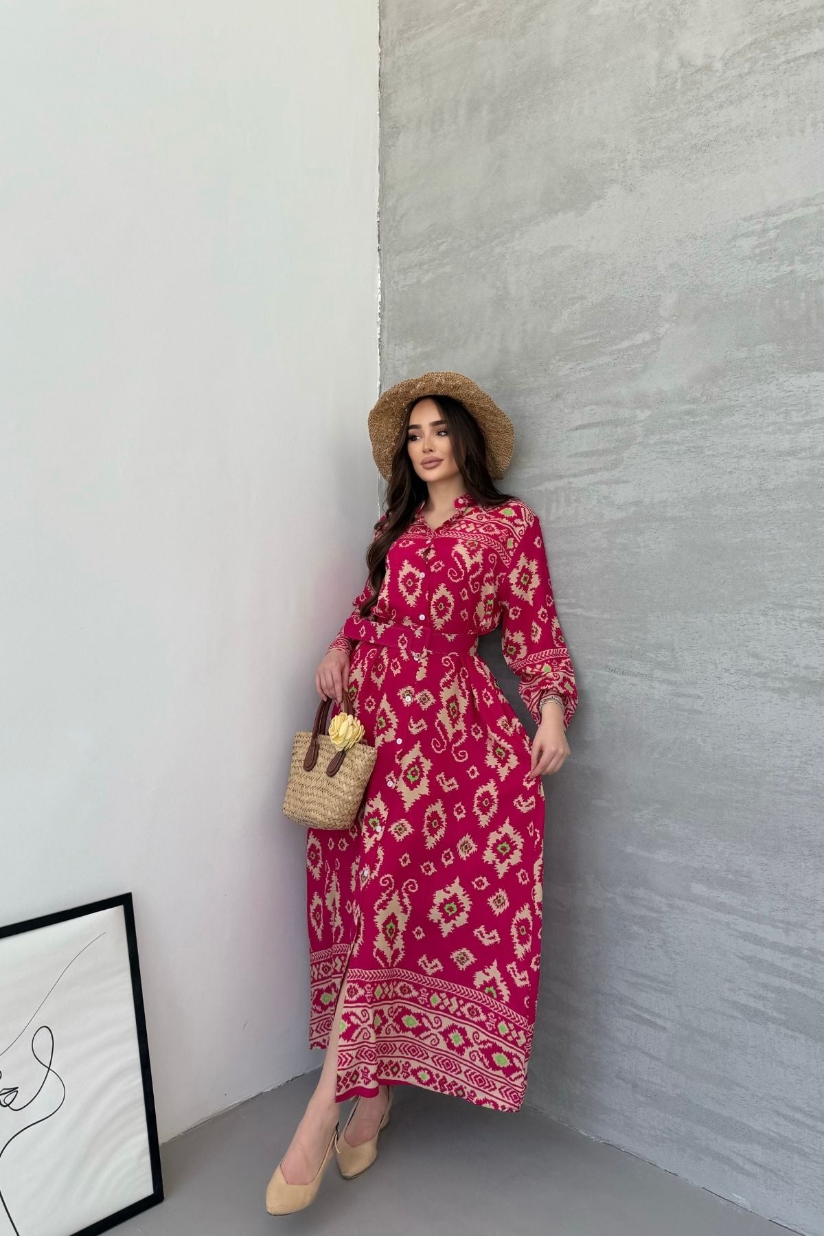 Fuşya Desenli Gömlek Yaka Kemerli Uzun Elbise